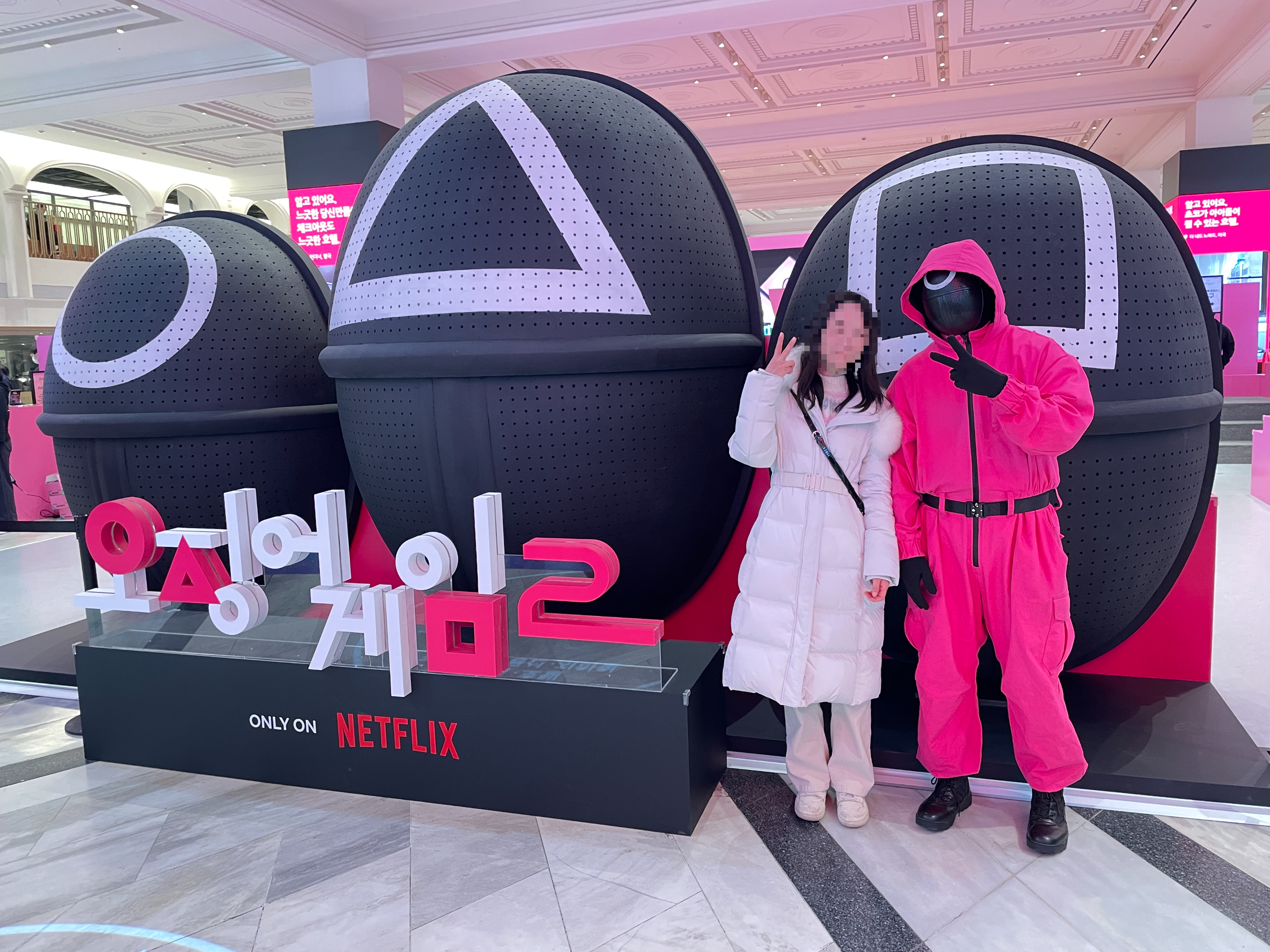 확실히 오징어게임이 전세계적으로 인기가 있다 보니 외국인 참가자도 많았습니다. 외국인들이 공기놀이하고 제기차기하는 모습이 재밌기도 하면서 신기했습니다. 특히 공기놀이의 경우에는 룰이 있다 보니 웨이팅 하는 공간 곳곳에 공기놀이 하는 방법이 큐알코드를 통해 자세히 소개되고 있었습니다. 팝업스토어 곳곳에는 핑크색 옷을 입고 가면을 쓴 요원들이 있어서 사진도 찍어주십니다. 오랜만에 활기가 넘치고 사람들이 즐거워하는 모습을 볼 수 있었고 저 또한 오랜만에 즐겁게 실내 데이트를 하면서 추억도 많이 남긴 것 같습니다.