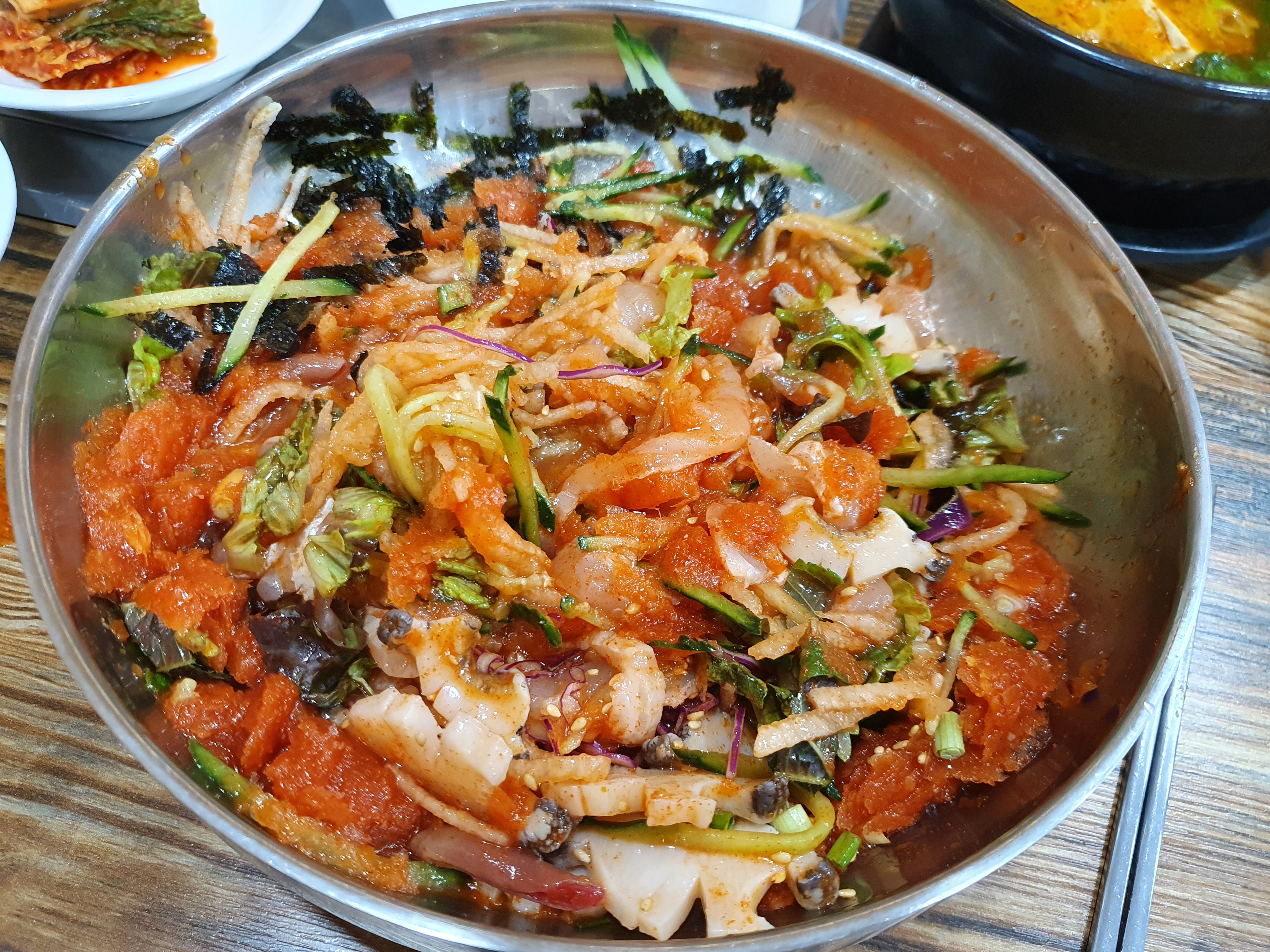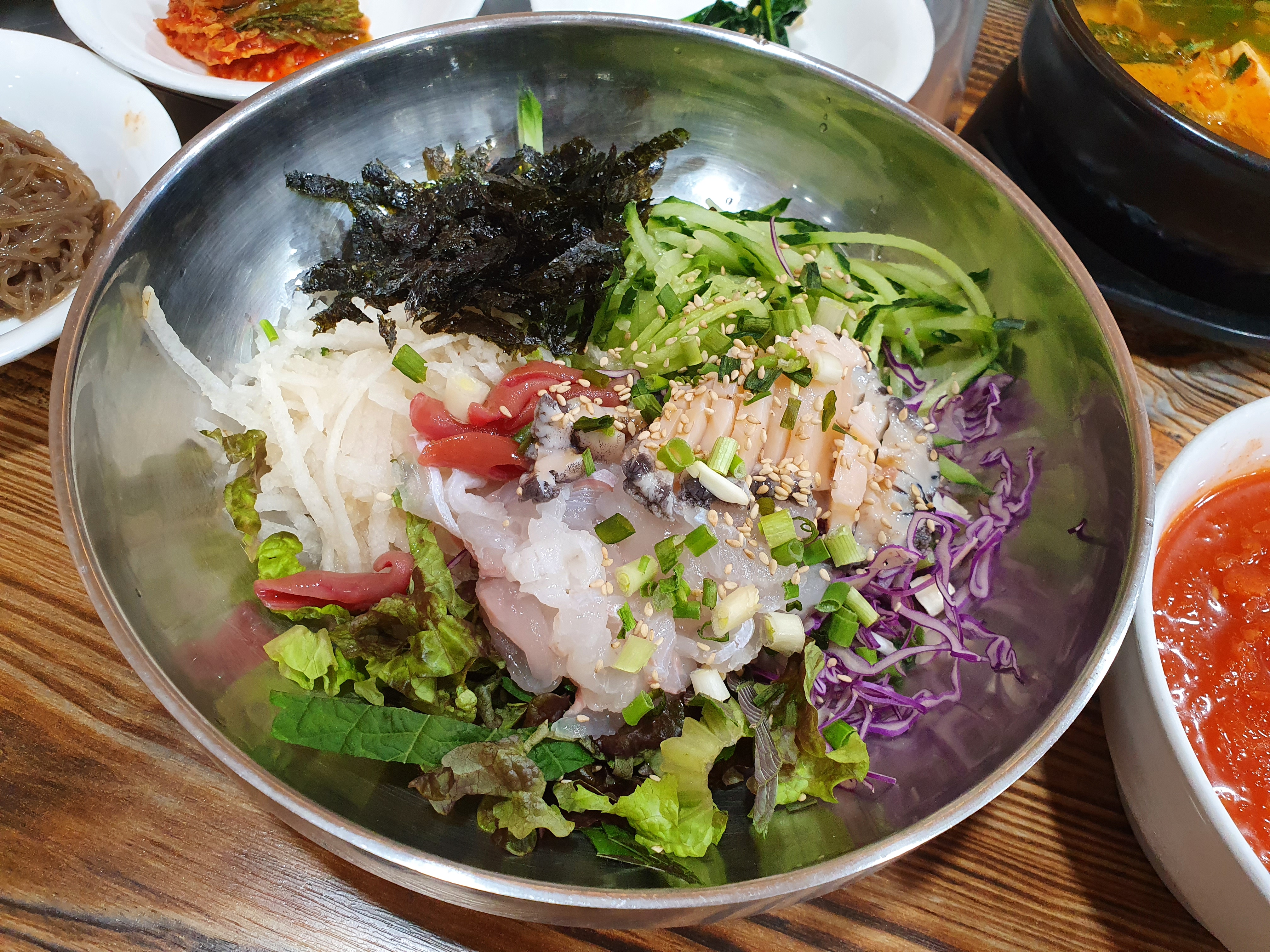 황제물회인만큼 회와 전복, 개불 등이 듬뿍듬뿍 들어가있더라구요. 면이나 매운탕 안먹어도 충분히 배부를것같은 비주얼입니다.
