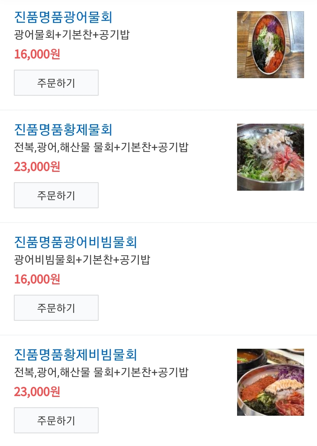 메뉴판을 찍지 못해서 검색에서 가지고 왔어요. 저는 진품명품황제물회를 주문했어요. 혼자 황제처럼 먹어보려구요ㅋㅋ