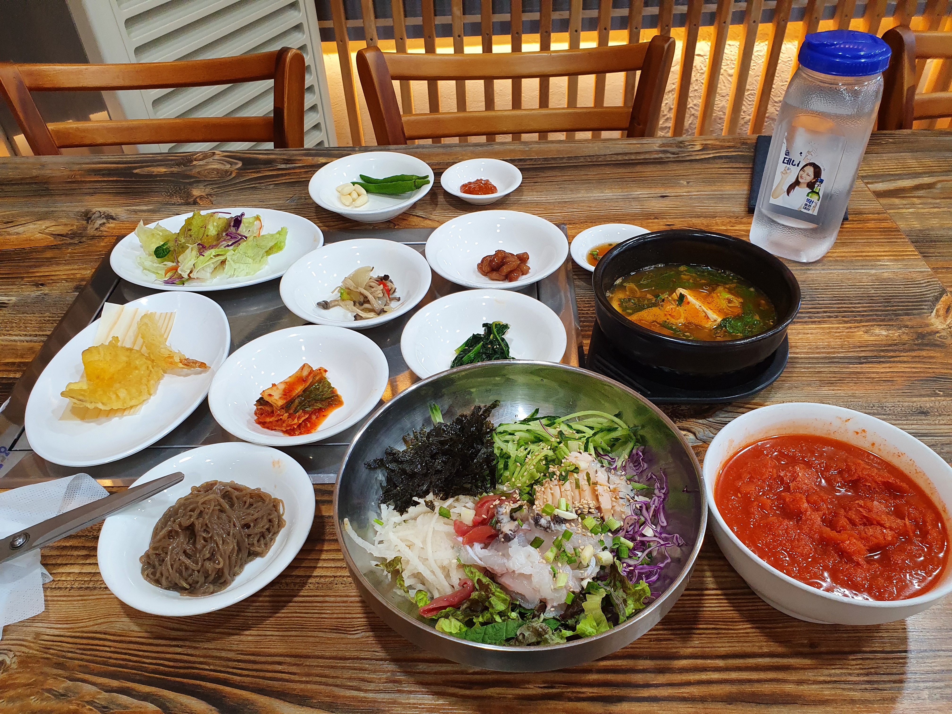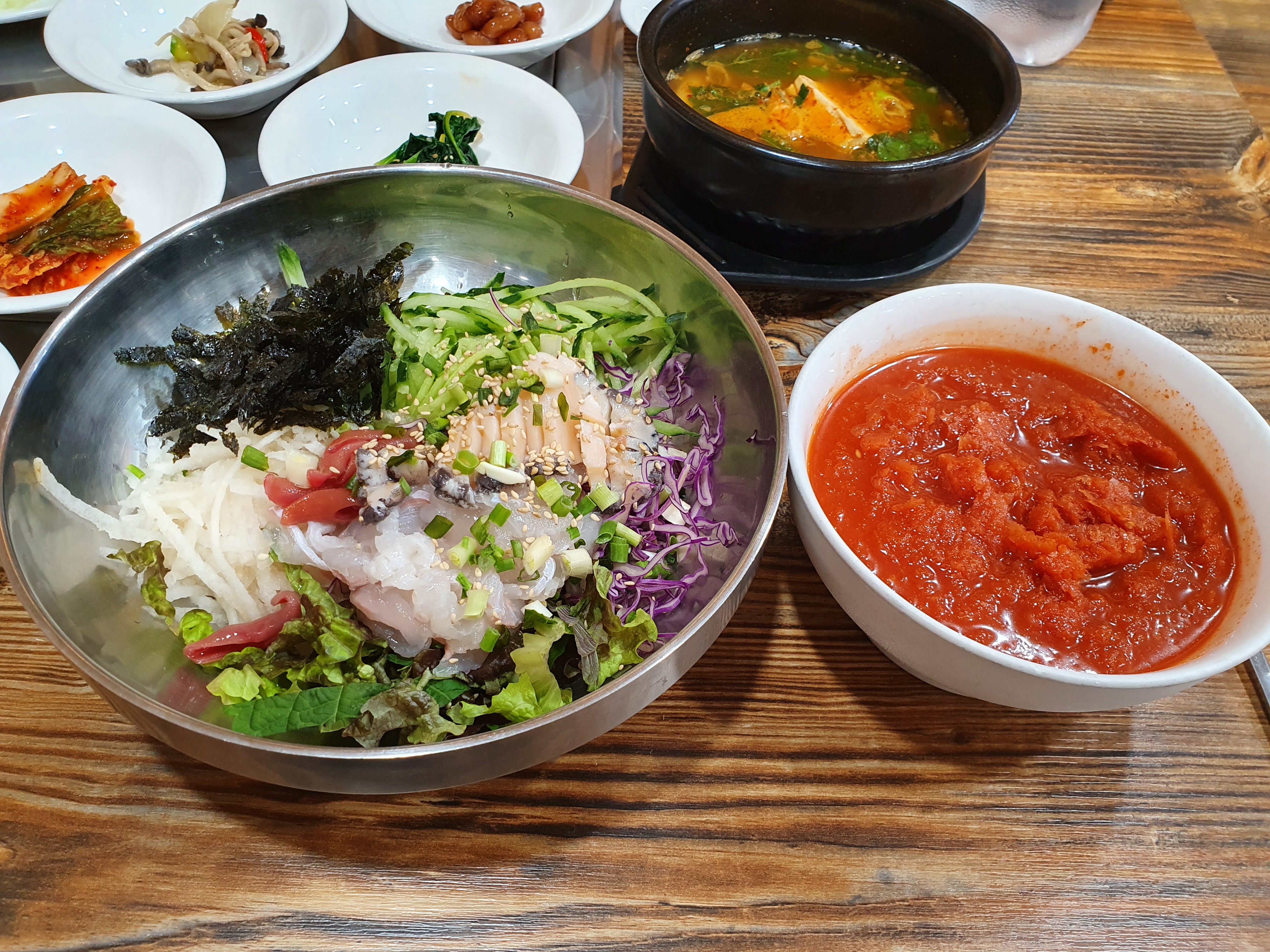 저의 황제물회가 한상 차려졌습니다. 매운탕도 함께 나와요! 밥이랑 면이랑 선택할 수 있어서 저는 면을 선택했어요.
