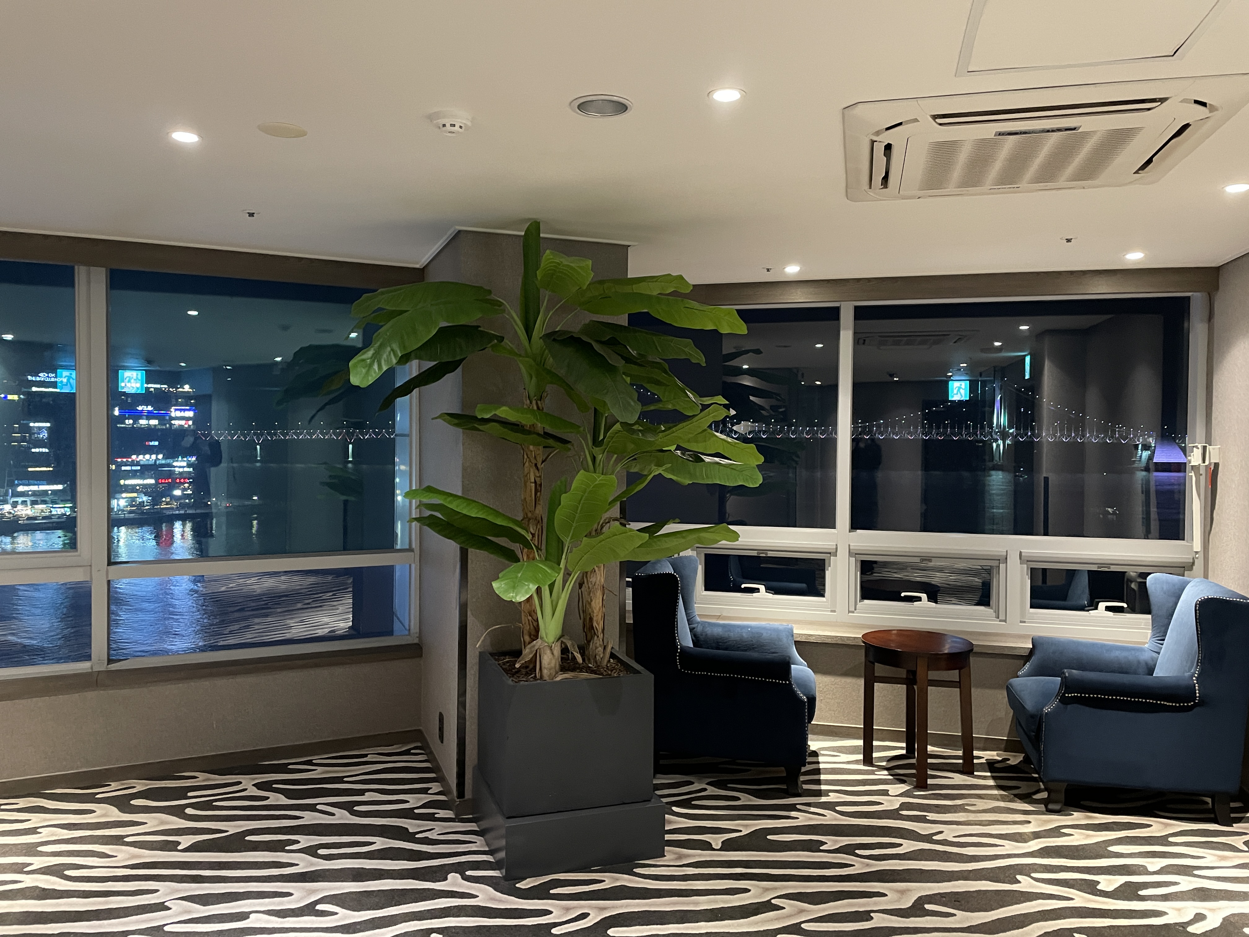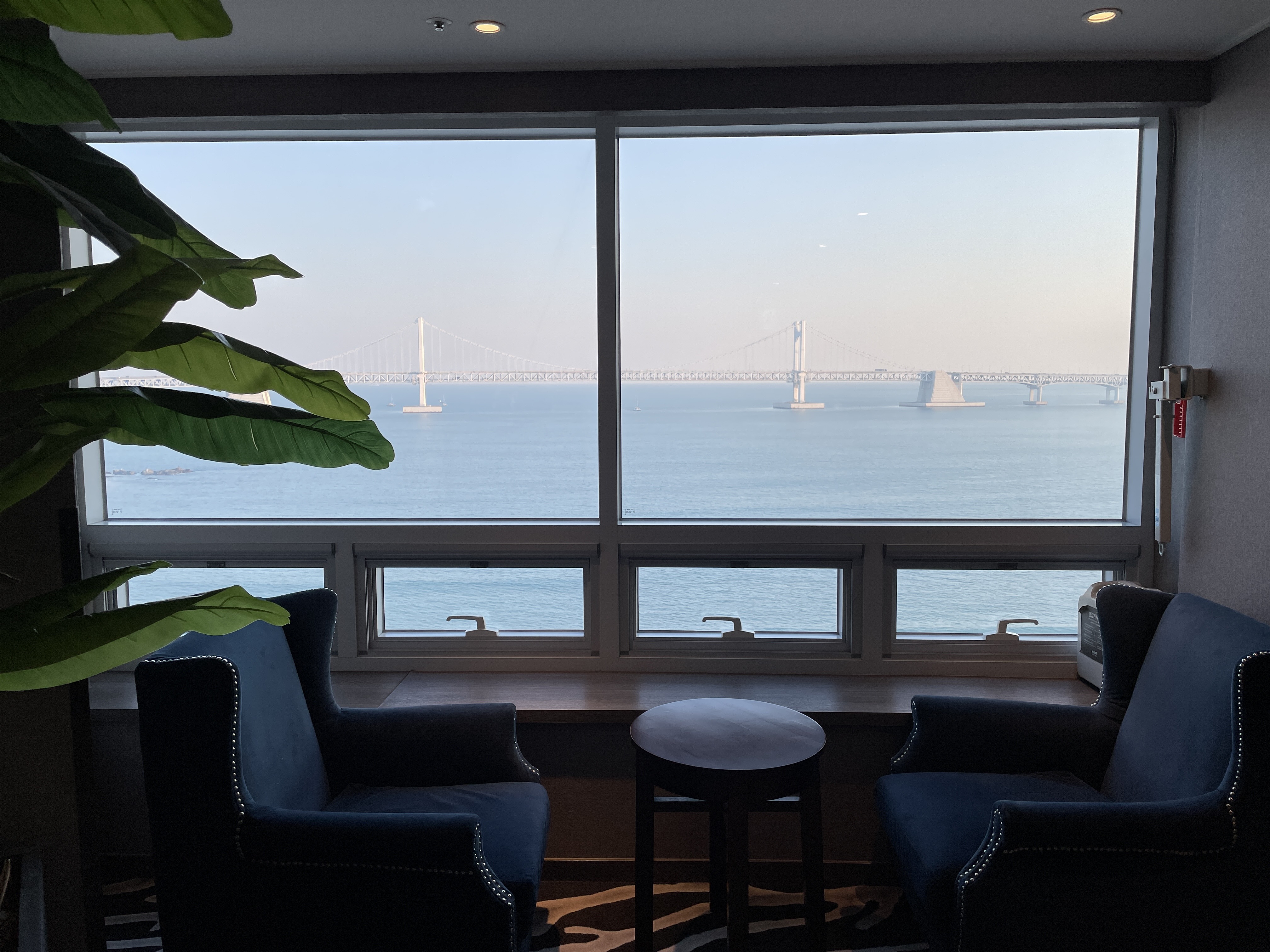 비록 객실에는 창문이 없어서 광안리 오션뷰, 광안대교뷰를 볼 수 없지만 객실에서 나와 엘리베이터로 가는 길에 이렇게 멋진 뷰를 복도에서 만나실 수 있습니다. 테이블과 의자도 있어서 잠시 쉬어갈 수 있어요.