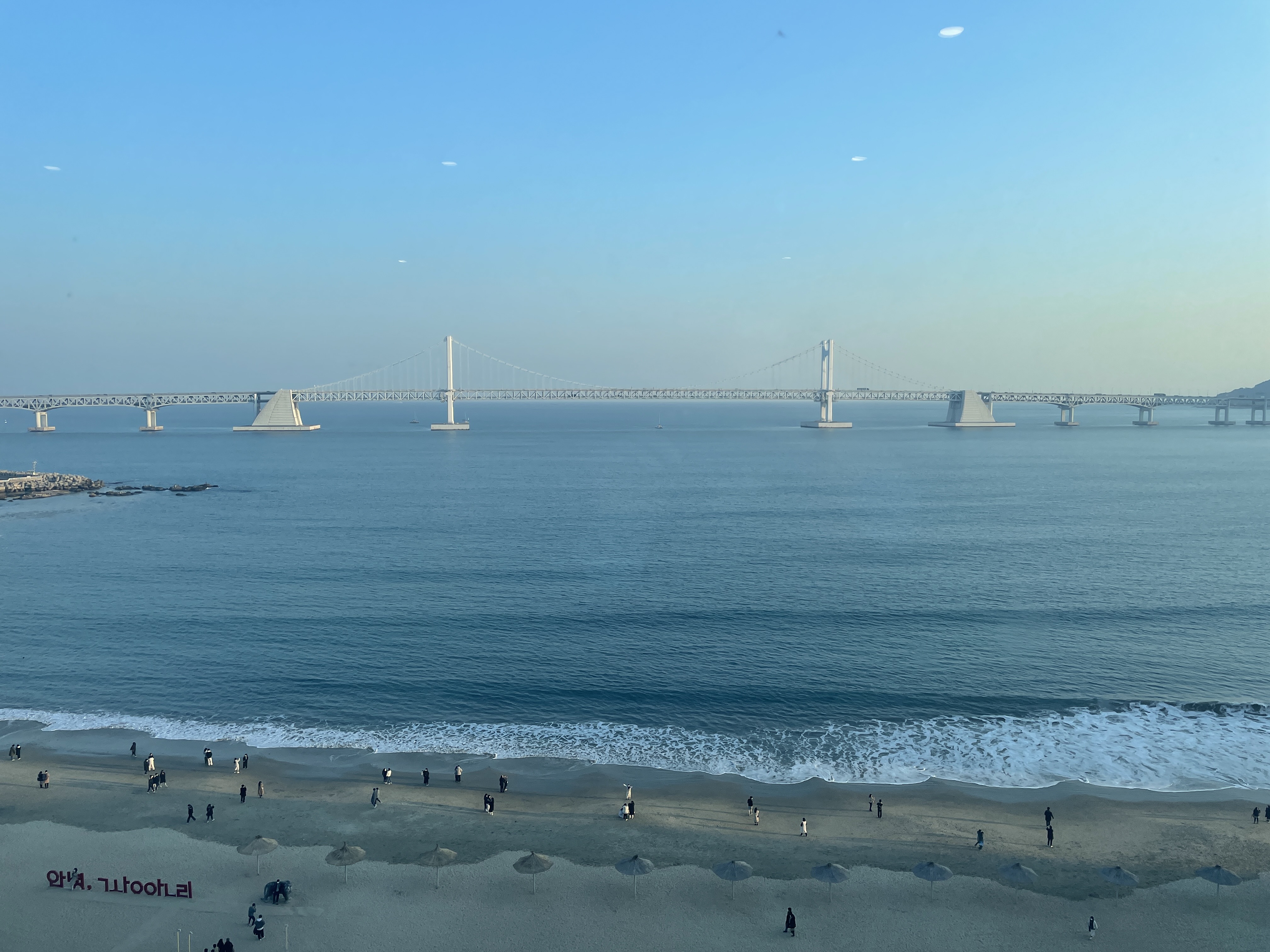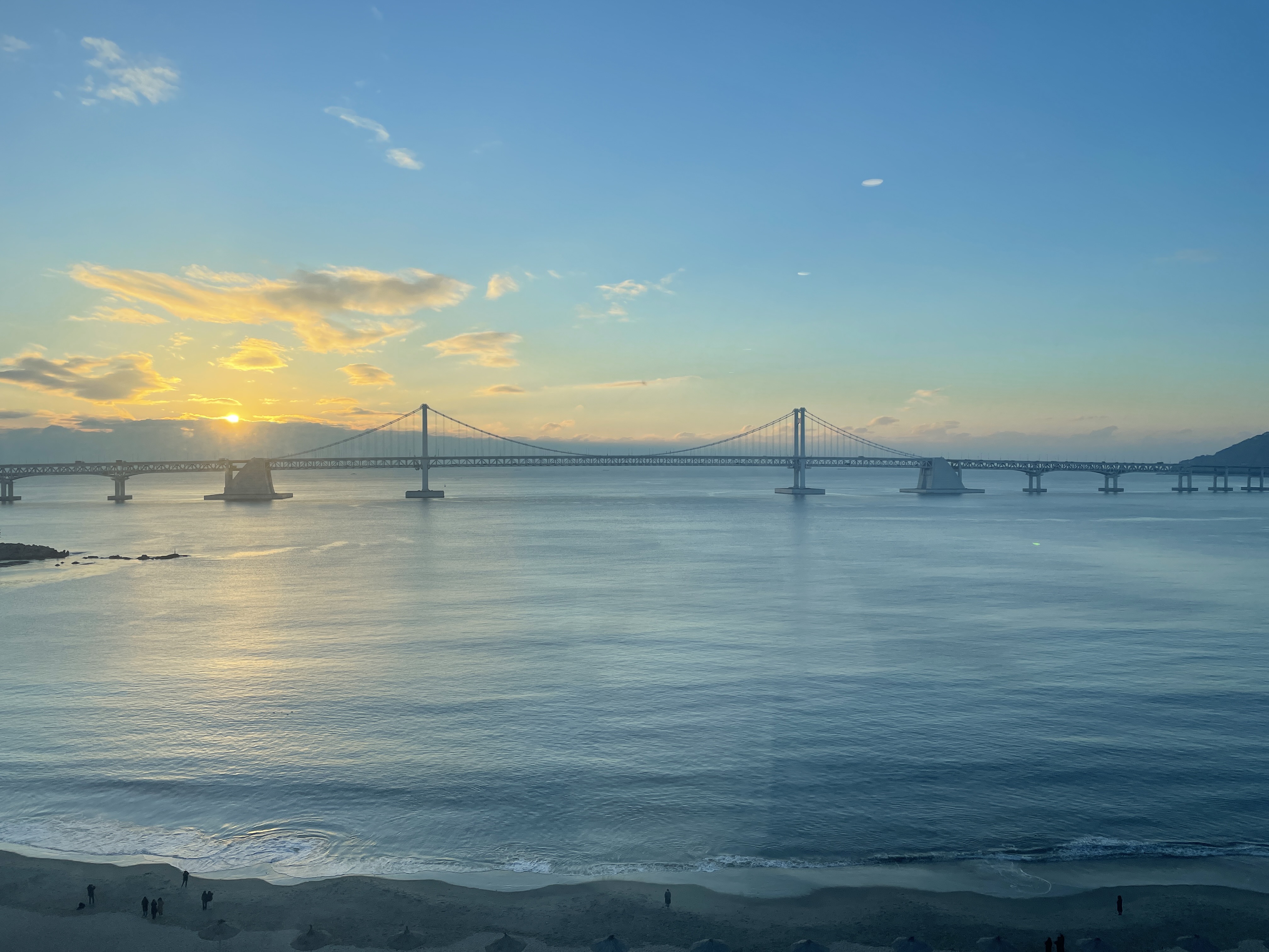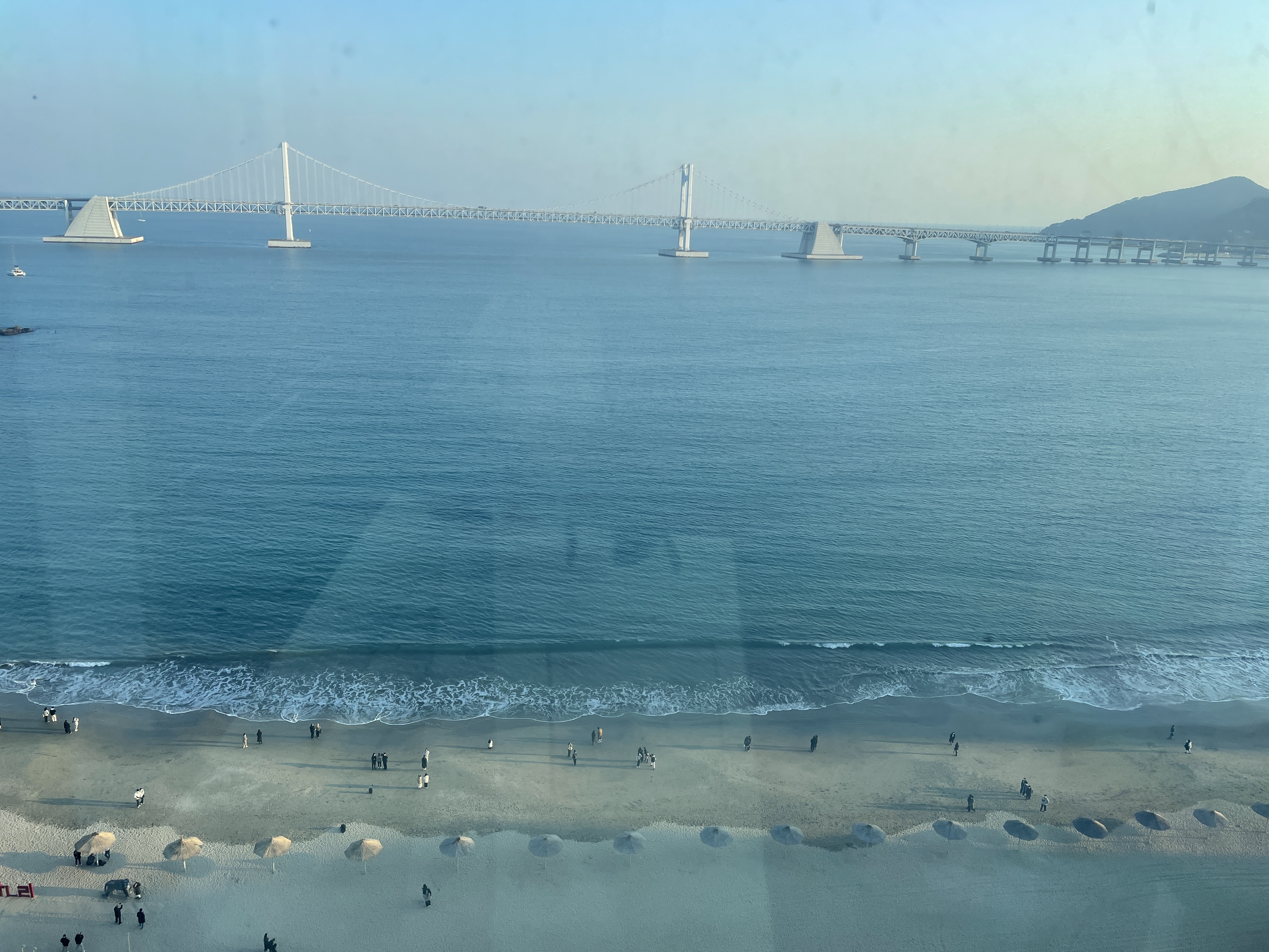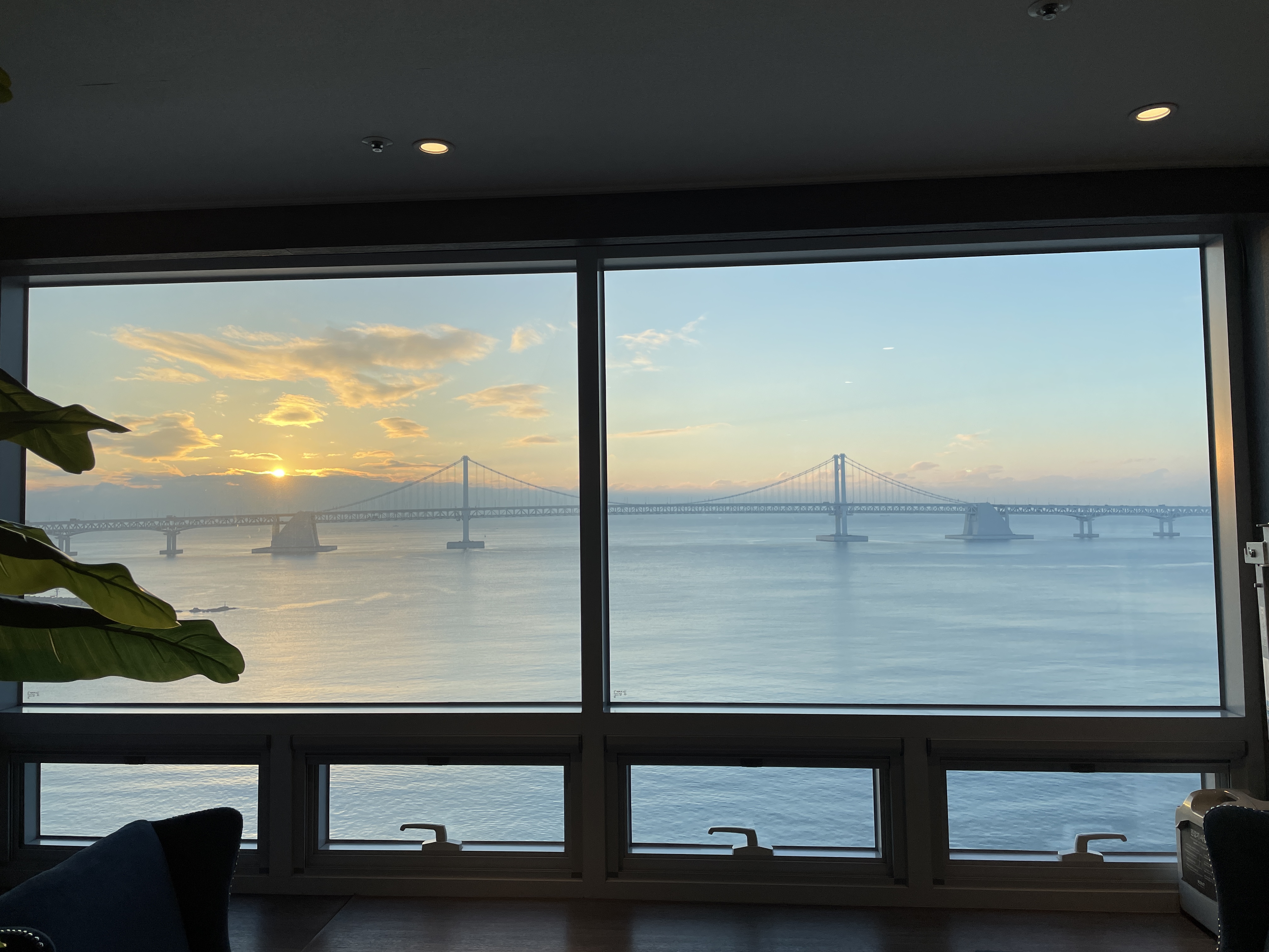 아침에 조식먹으러 15층 스카이 라운지에 가는 길에 복도에서 찍어본 광안대교뷰입니다. 이제 막 해가 떠오르는 때에 찍었는데 이 곳에서 스테이하니 광안리의 모든 시간, 시간대별로 달라지는 모습을 즐길 수 있어서 참 좋아요.