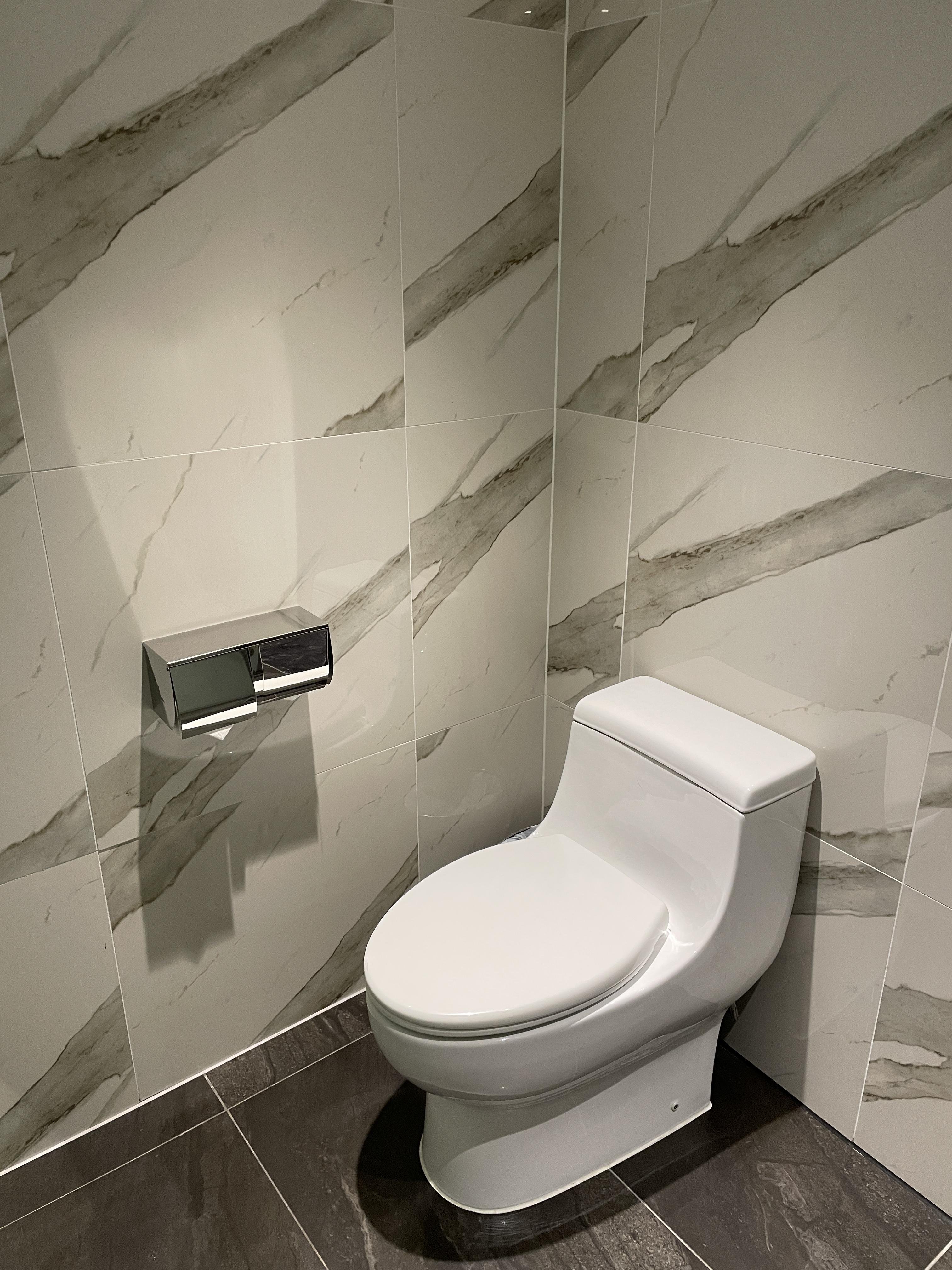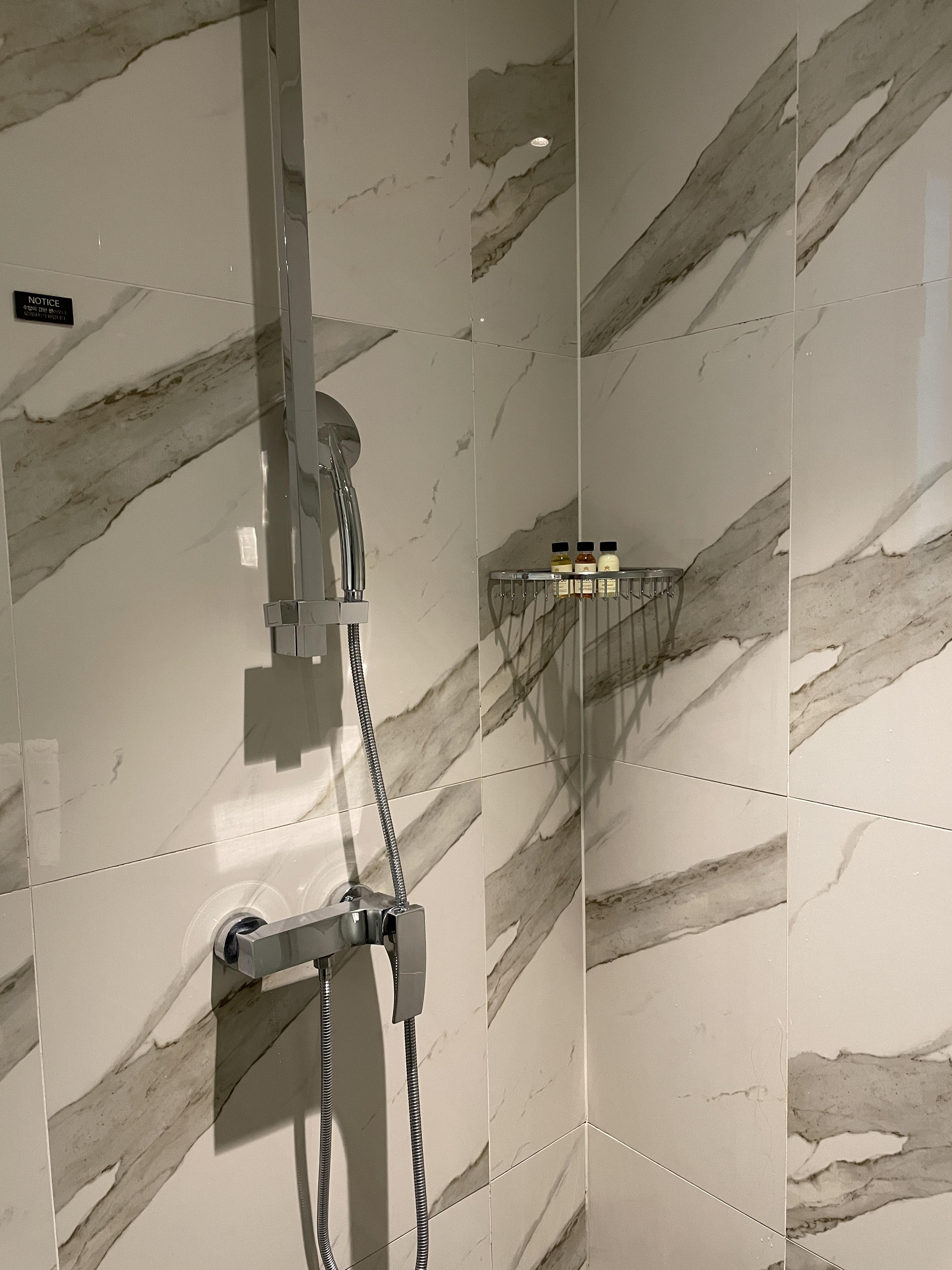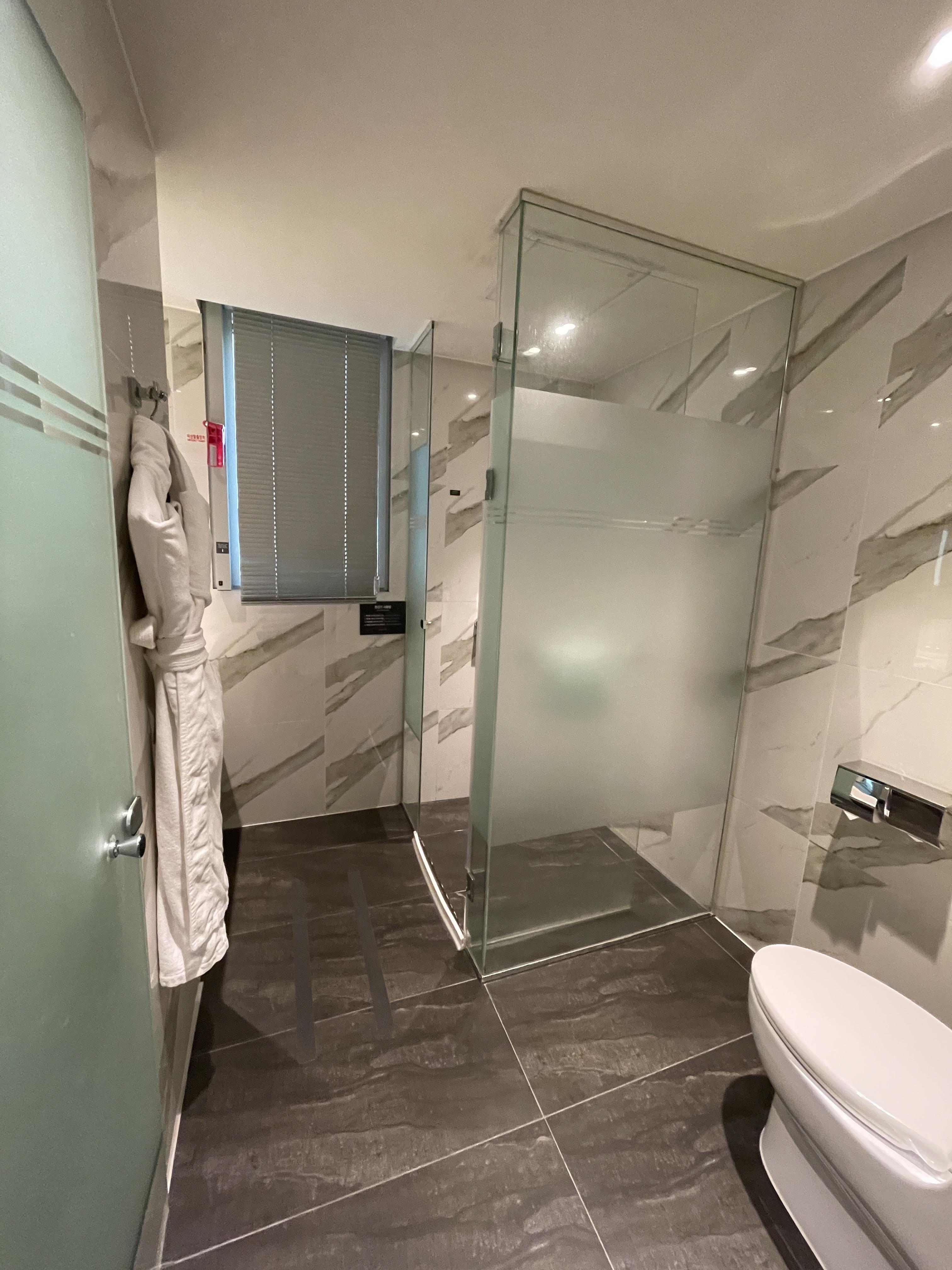 샤워부스 내부와 화장실입니다. 샤워부스 내부 바닥이 너무 차가워서 세면대 아래에 있는 욕실 매트를 깔고 이용했는데 꽤 괜찮았습니다. 그리고 수압이 굉장히 센 편이라서 처음 물을 틀 때 조심해야 해요. 변기에 따로 비데는 설치되어 있지 않지만 크게 불편하진 않았습니다.