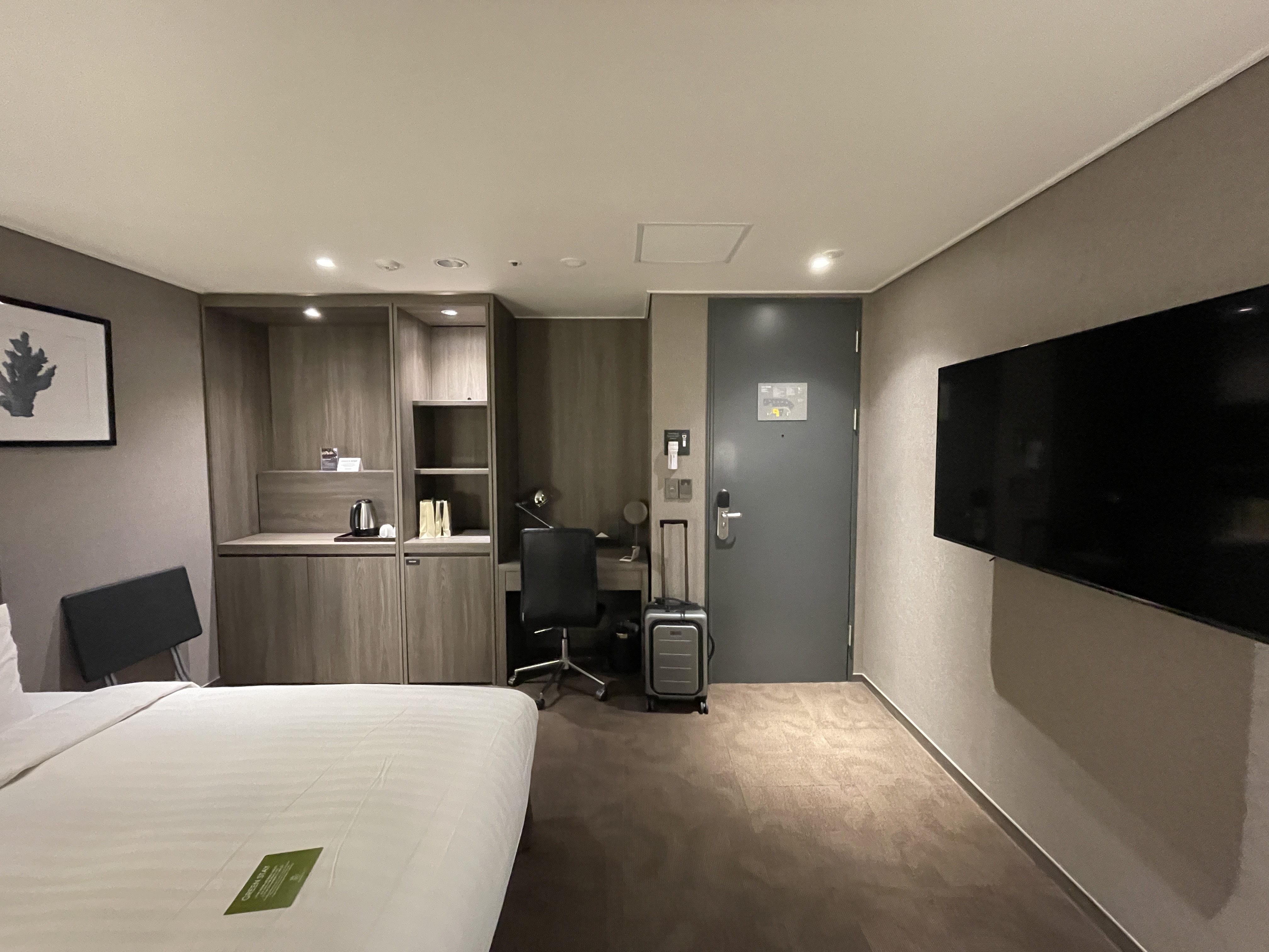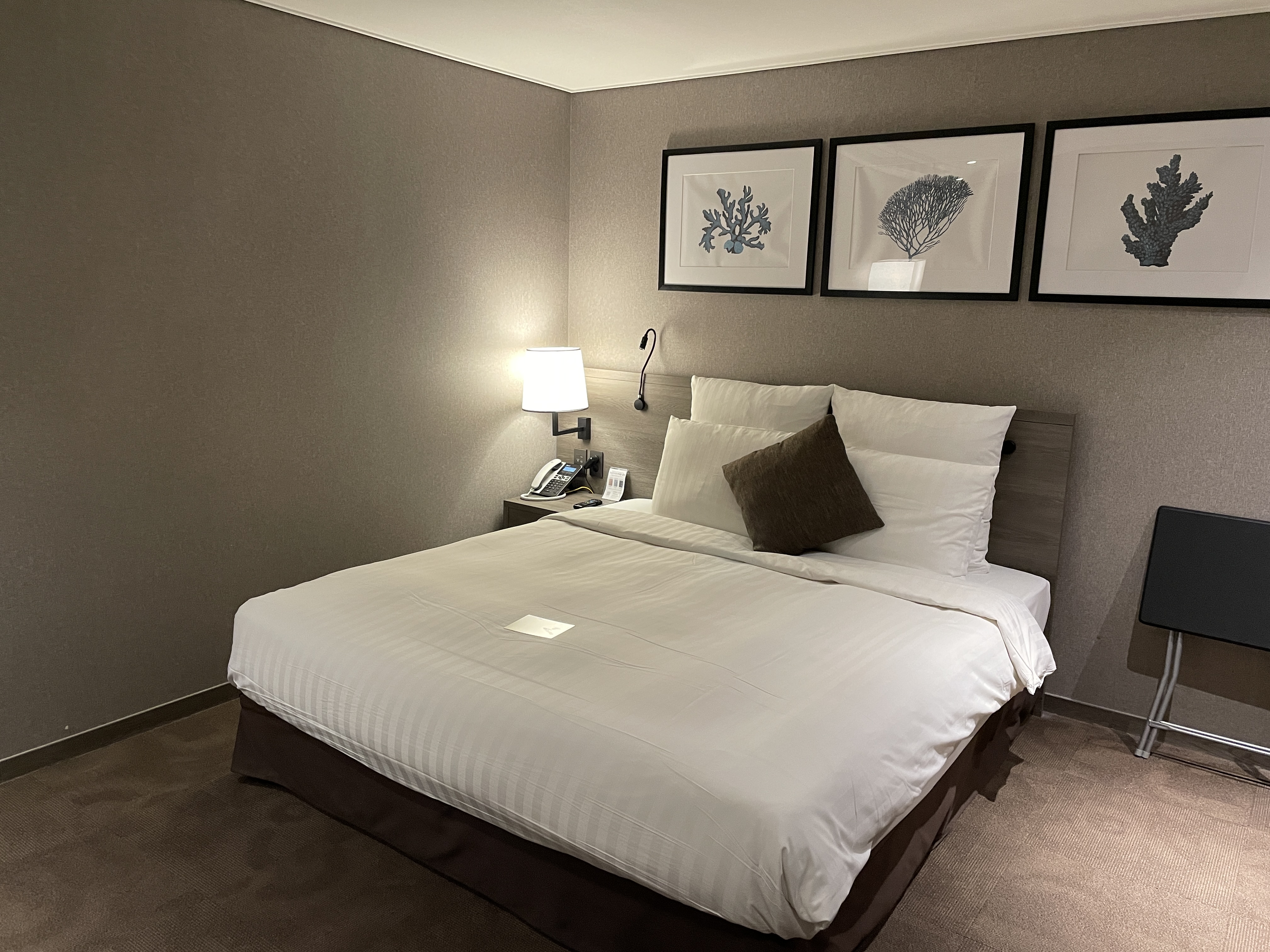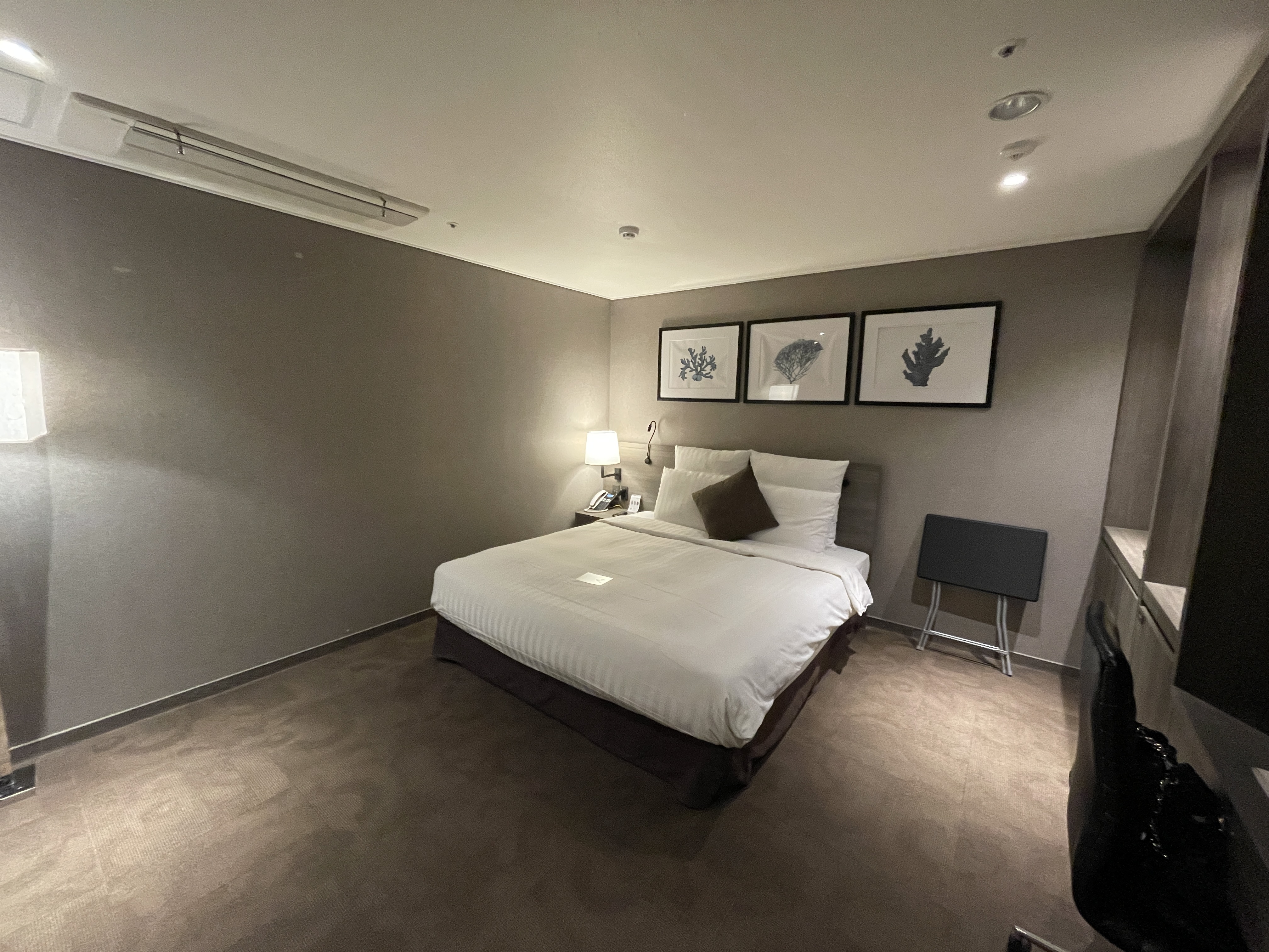 객실은 스탠다드 더블룸으로 꽤 넓은 편이라서 캐리어를 펼쳐놓아도 왔다갔다하는데 전혀 불편함이 없었고 침대도 크고 푹신해 숙면을 취할 수 있었어요. 조명은 좀 어두운 편이긴 하지만 업무를 볼 때 데스크에 스탠드가 있기 때문에 스탠드를 사용하시면 됩니다.