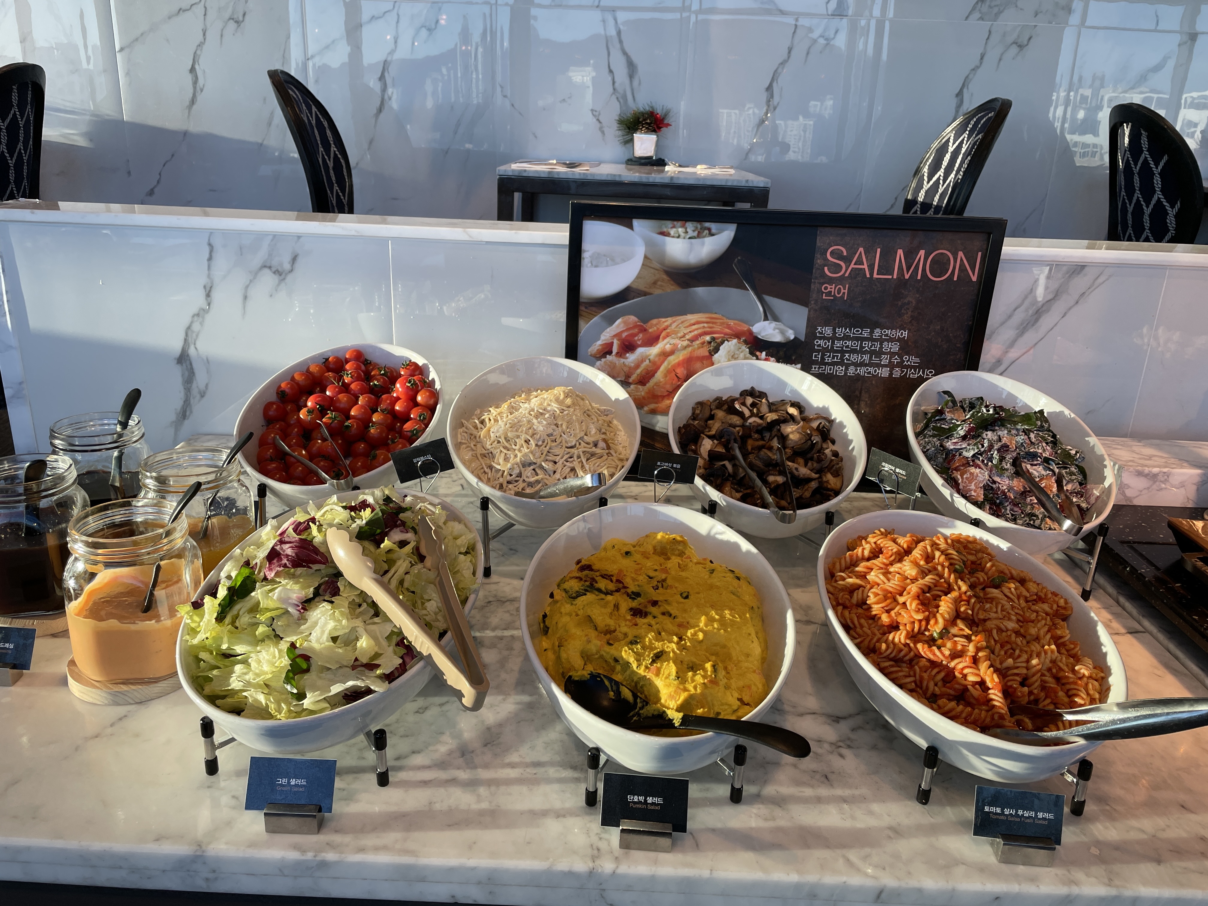 빵 섹션, 샐러드 섹션, 따뜻한 음식 섹션, 한식 섹션 등으로 나눠져 있는데 여기 연어샐러드가 정말 맛있습니다. 훈제연어의 맛과 향이 굉장이 우수하고 연어가 많이 들어가 있어요. 다른 음식들은 대부분 애슐리에서 먹어보았던 음식들일텐데 조식에서 애슐리 음식을 만날 수 있다는 것은 굉장히 행복합니다.