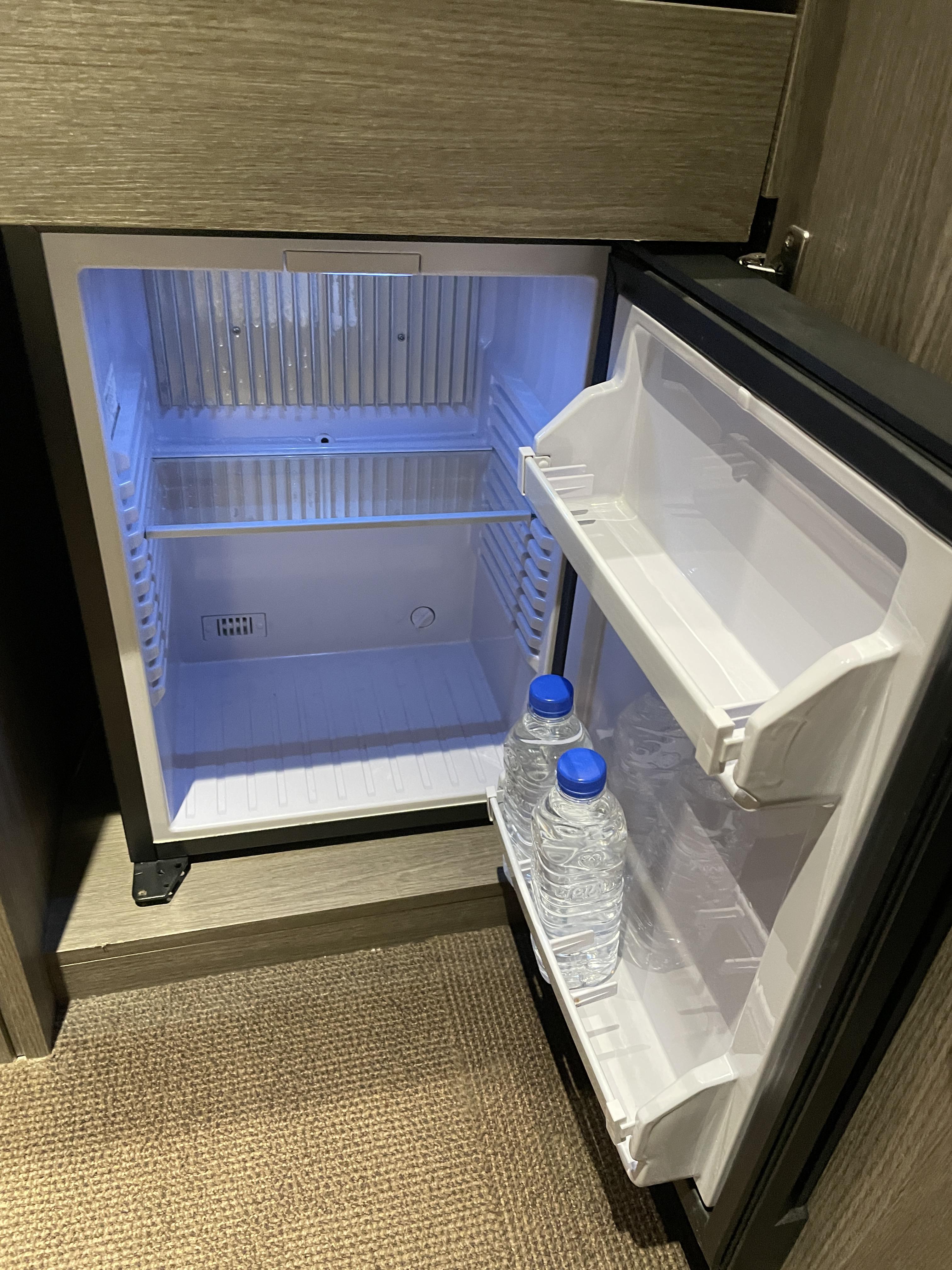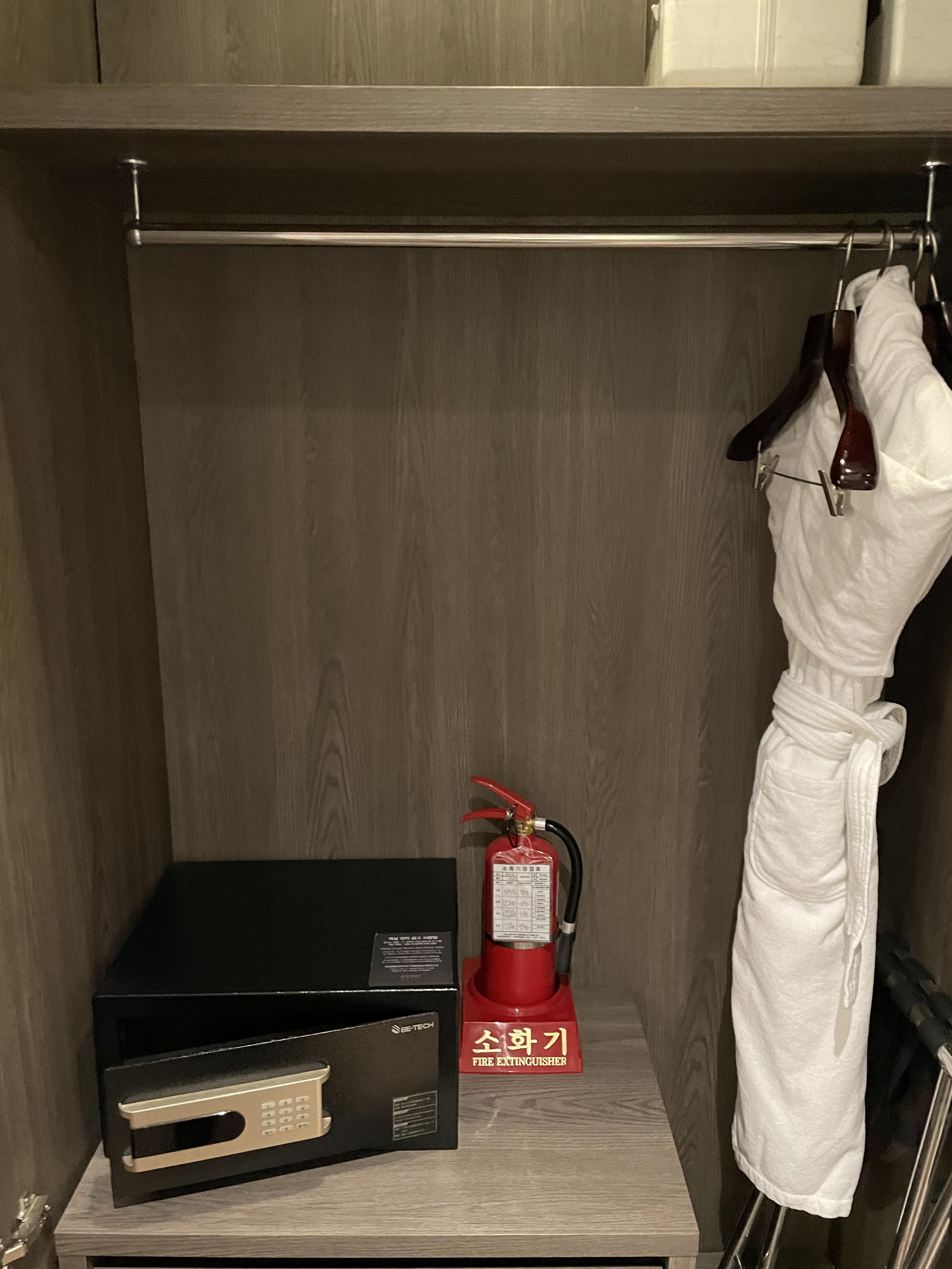 옷장 내부에는 소화기와 금고가 있는데 금고 사용방법은 금고 윗쪽에 자세히 적혀있습니다. 샤워가운은 객실 당 두 개가 준비되어 있으니 참고하십시오. 냉장고 내에는 생수 두 병이 준비되어 있고 박당 2병씩 채워지는 시스템입니다.