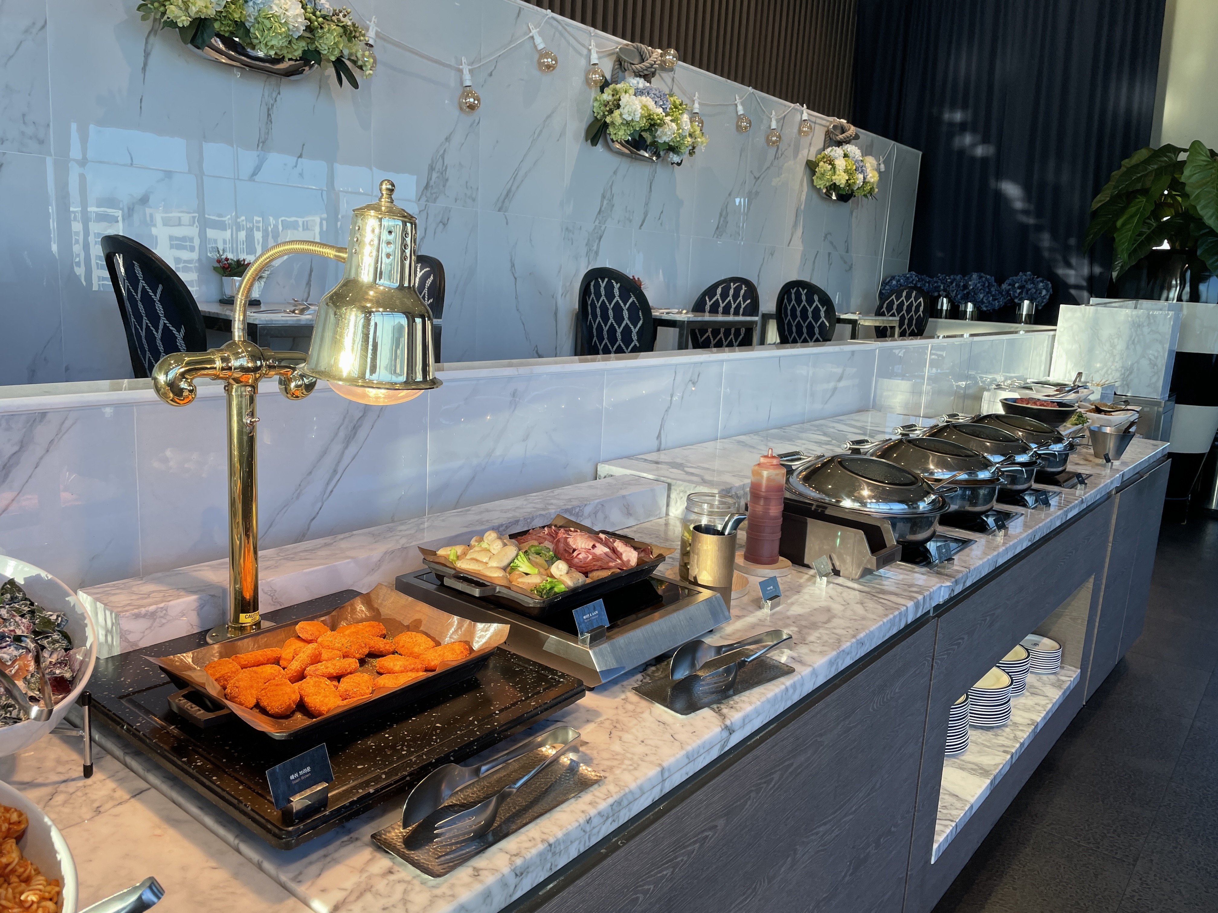 15층 스카이라운지에서 조식을 먹을 수 있는데 QR코드 체크인, 온도 체크 후 직원분께 이용방법에 대해 안내받을 수 있습니다. 음식을 가져올 때는 마스크와 위생장갑을 꼭 착용하고 가져와야 해요. 15층 스카이라운지는 아름다운 뷰를 보는데 더할나위 없이 좋습니다.