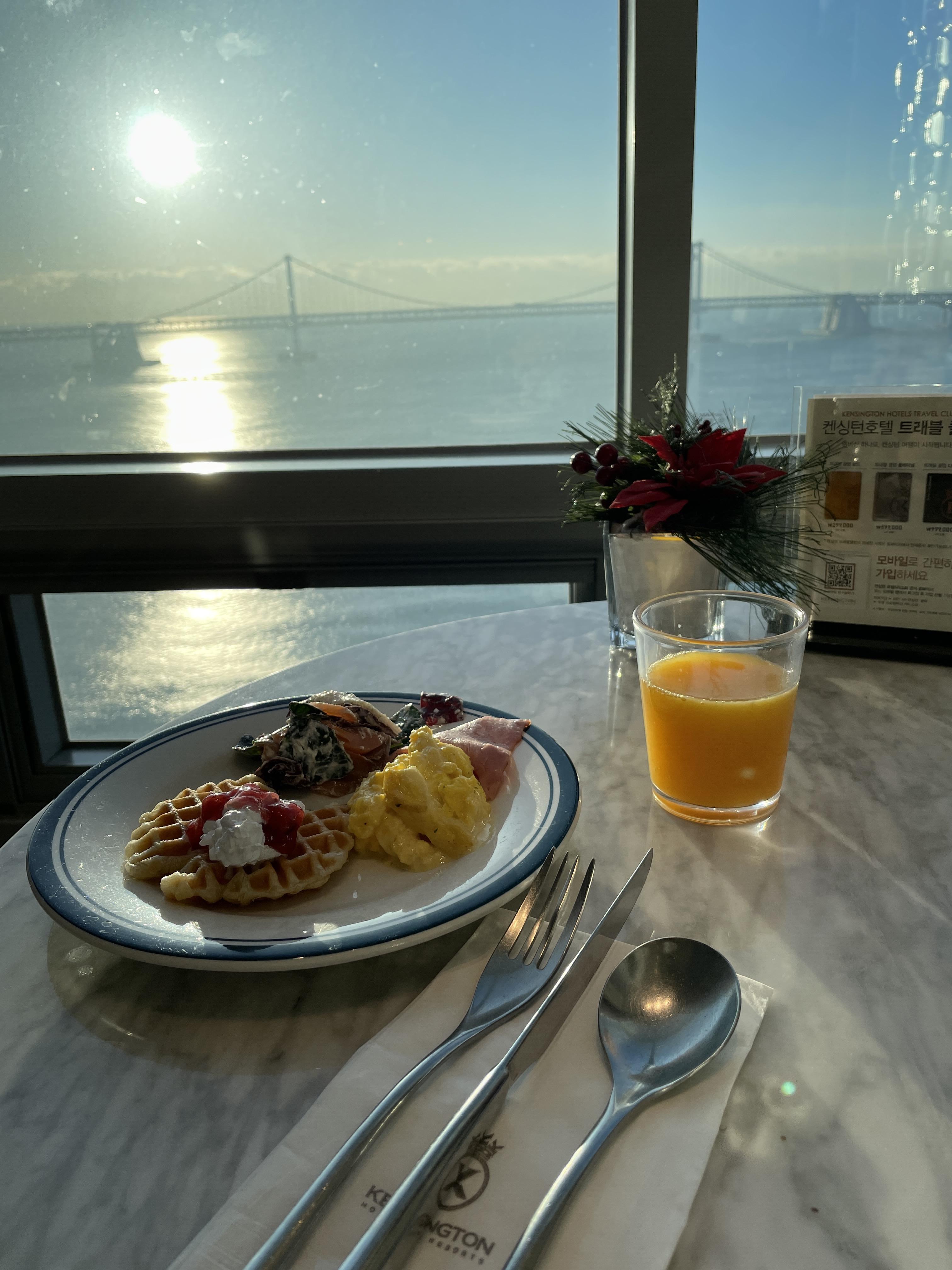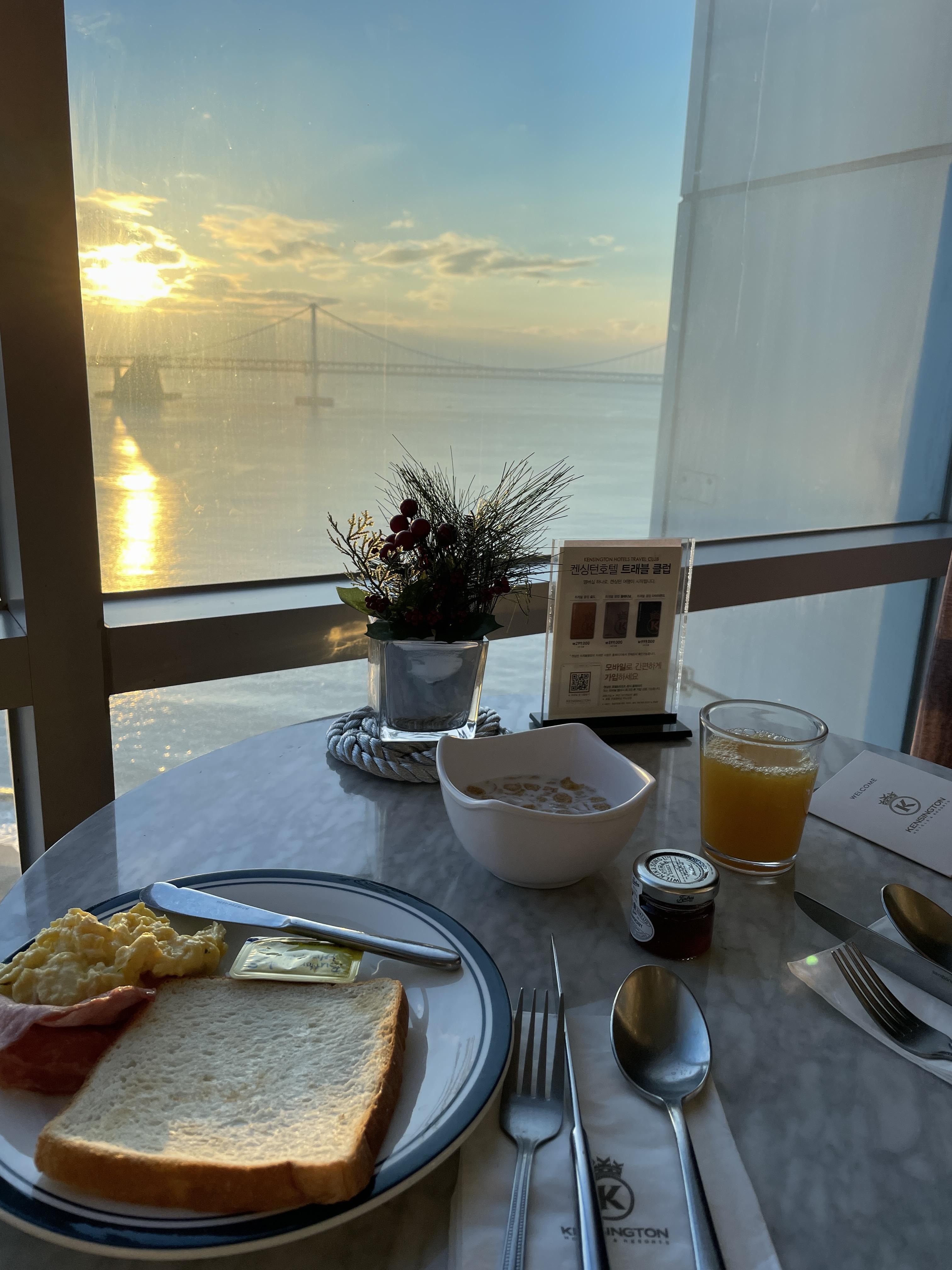 둘째날 아침, 저의 조식인데 아침이라 눈이 조금 부시긴 하지만 광안대교를 바라보면서 멋진 뷰와 함께 맛있는 음식을 먹을 수 있어서 행복했어요. 켄트호텔은 벌써 두 번째 방문인데 늘 실망시키지 않는 것 같습니다.