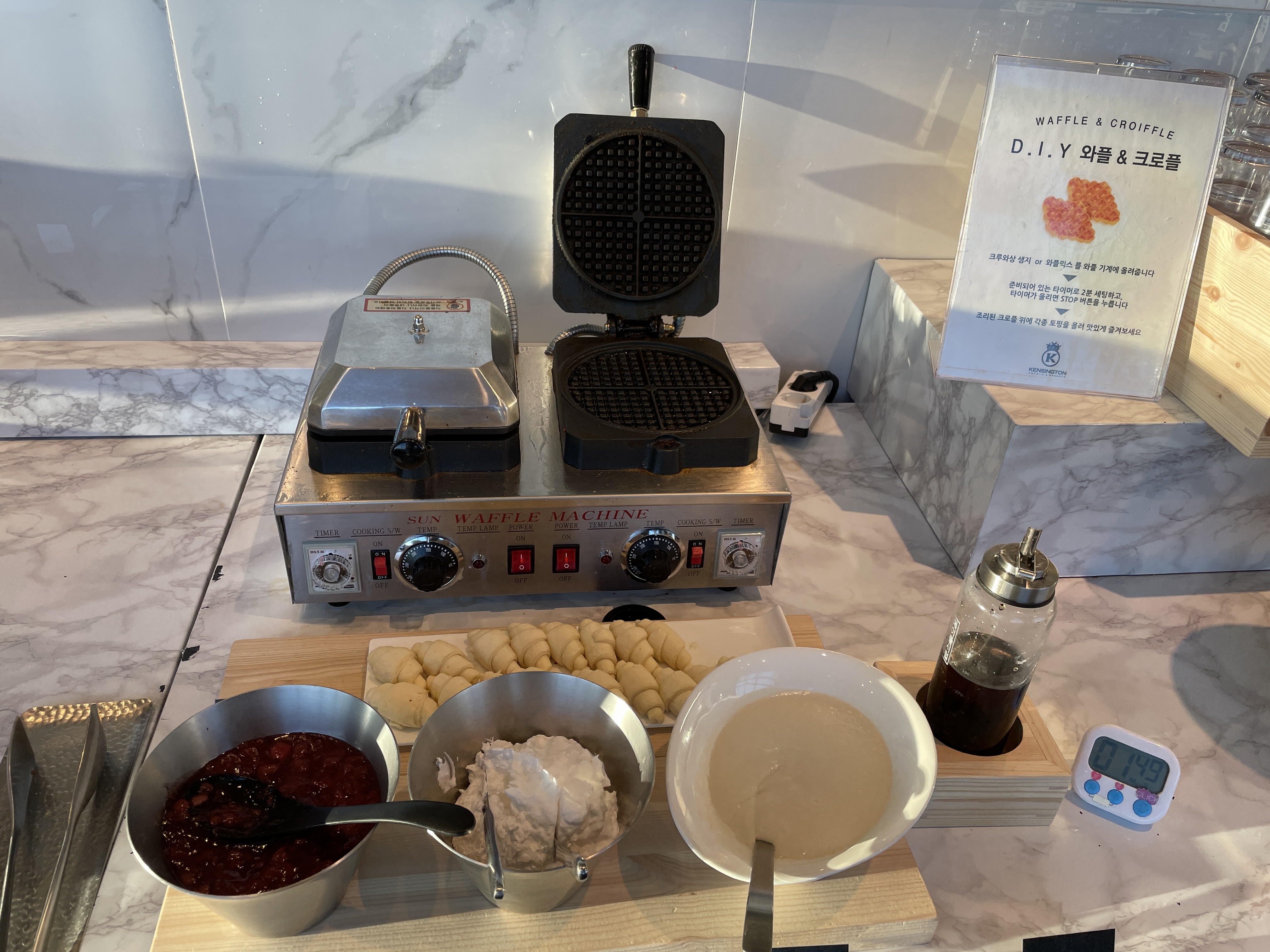 그리고 DIY로 와플 또는 크로플을 만들어 먹을 수 있는 섹션이 있어요. 크로플을 만들어 먹기 위해 크로와상 생지가 함께 준비되어 있는데 크로플을 사랑하는 저로서는 그냥 지나칠 수 없었습니다. 스스로 만들어 먹는 재미가 쏠쏠해요.