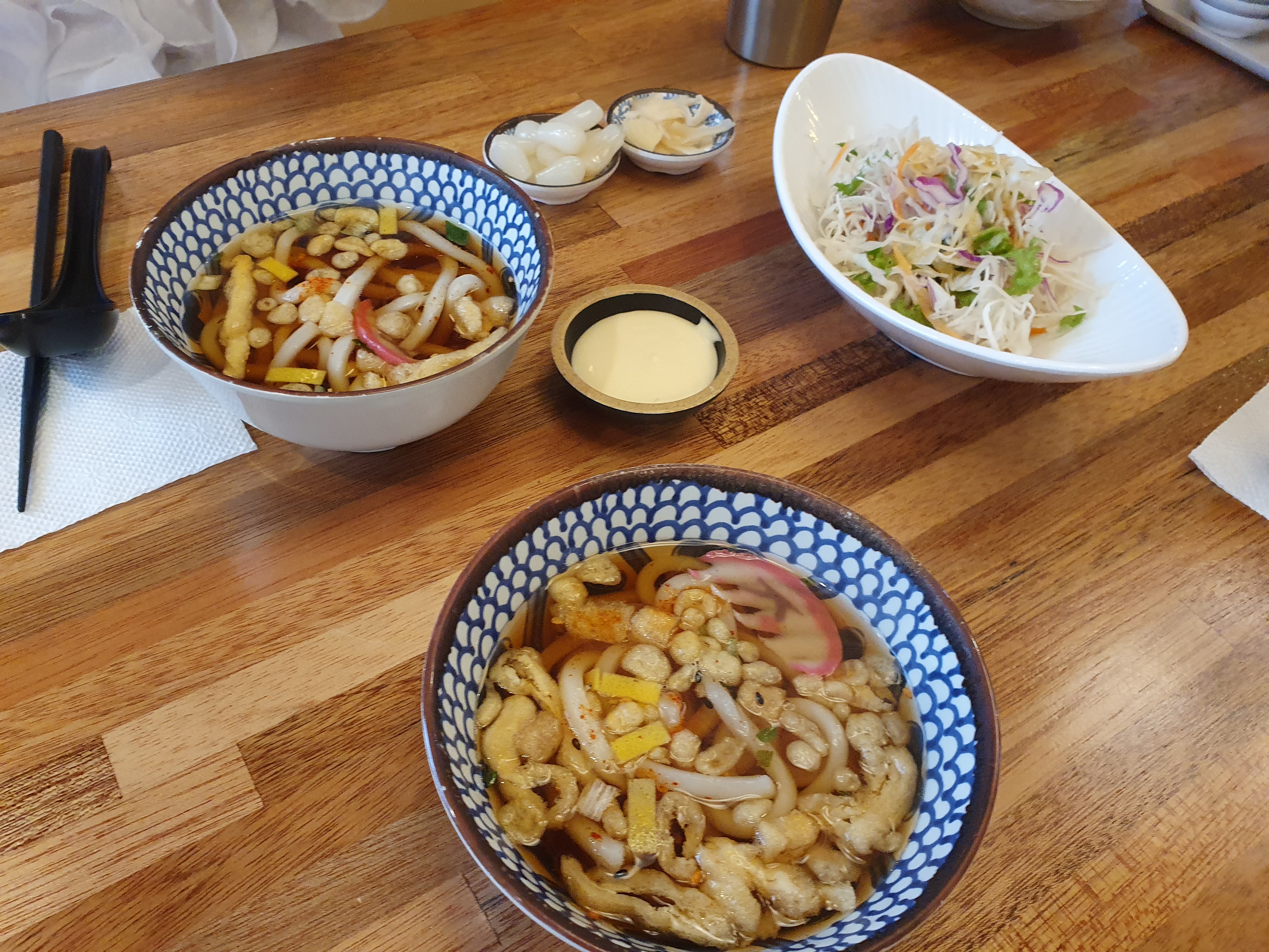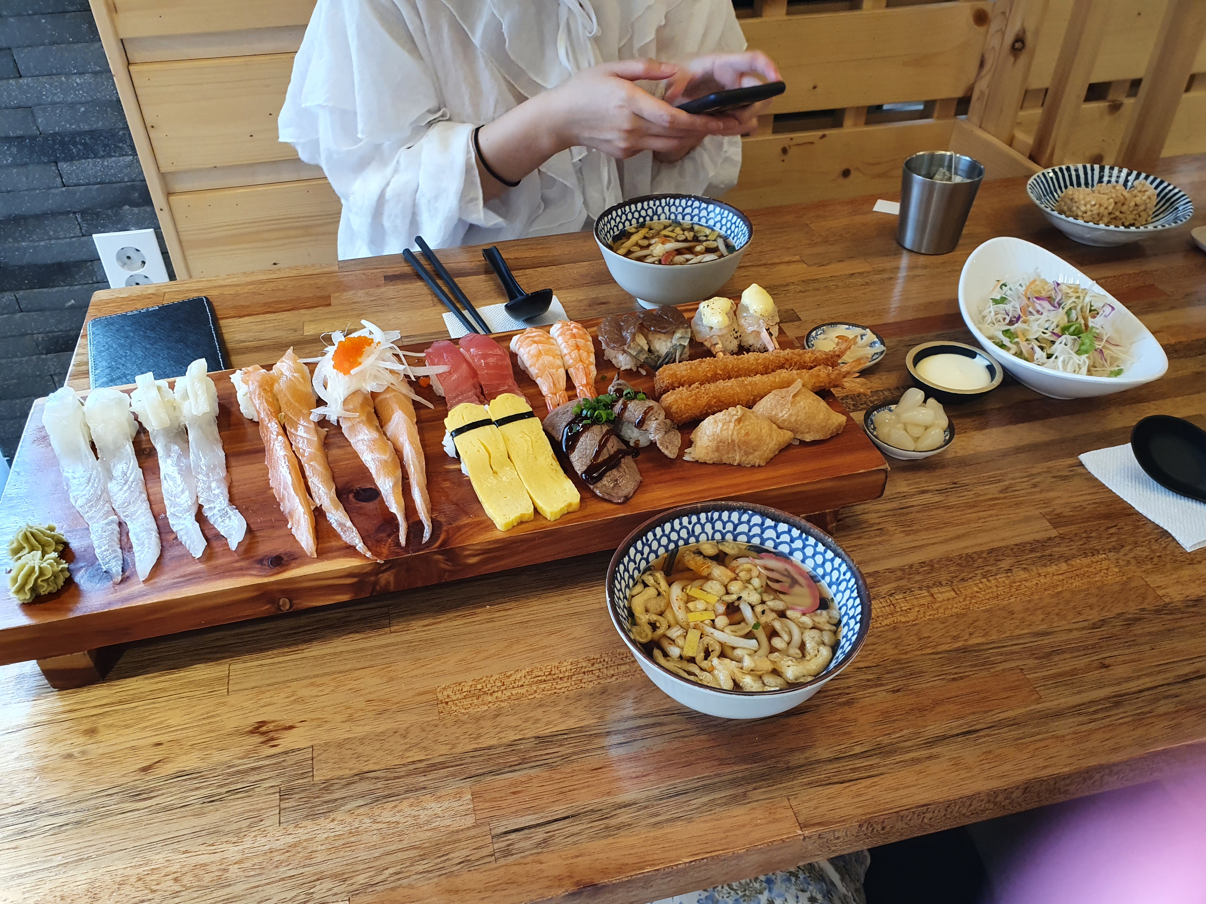 음식이 차례대로 나왔는데, 따끈한 우동과 초밥과 함께 곁들여 먹을 샐러드, 새우튀김을 찍어먹는 소스가 나왔어요. 우동이 뜨끈하니 국물맛이 끝내주더라구요.
