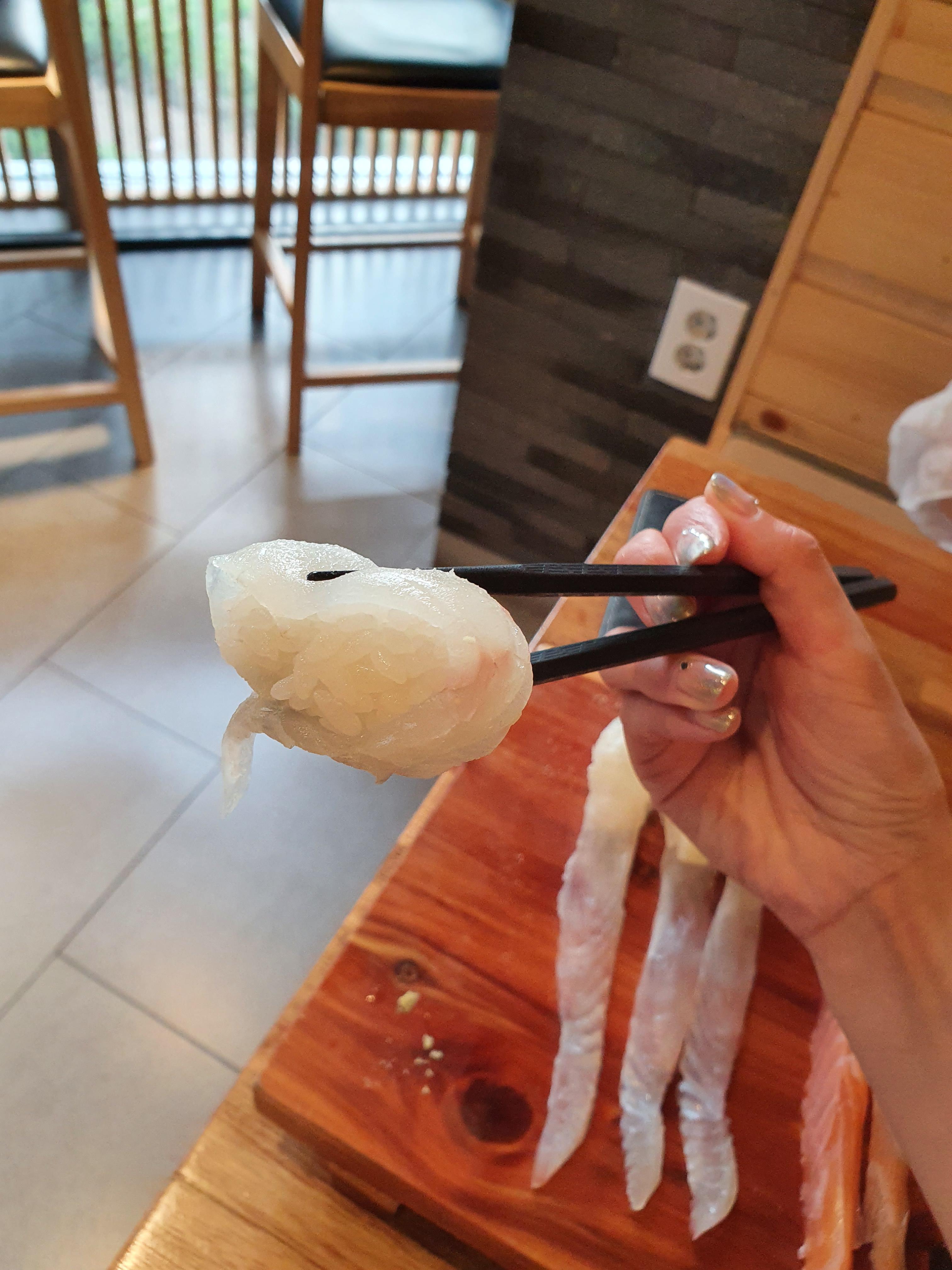 음식이 나오고 나니 오우 왜 긴꼬리초밥이라고 이름을 붙였는지 딱 알겠네요! 광어, 연어, 참치, 새우, 불초밥, 계란초밥, 유부초밥 이렇게 나왔는데 저의 원픽은 연어였어요.