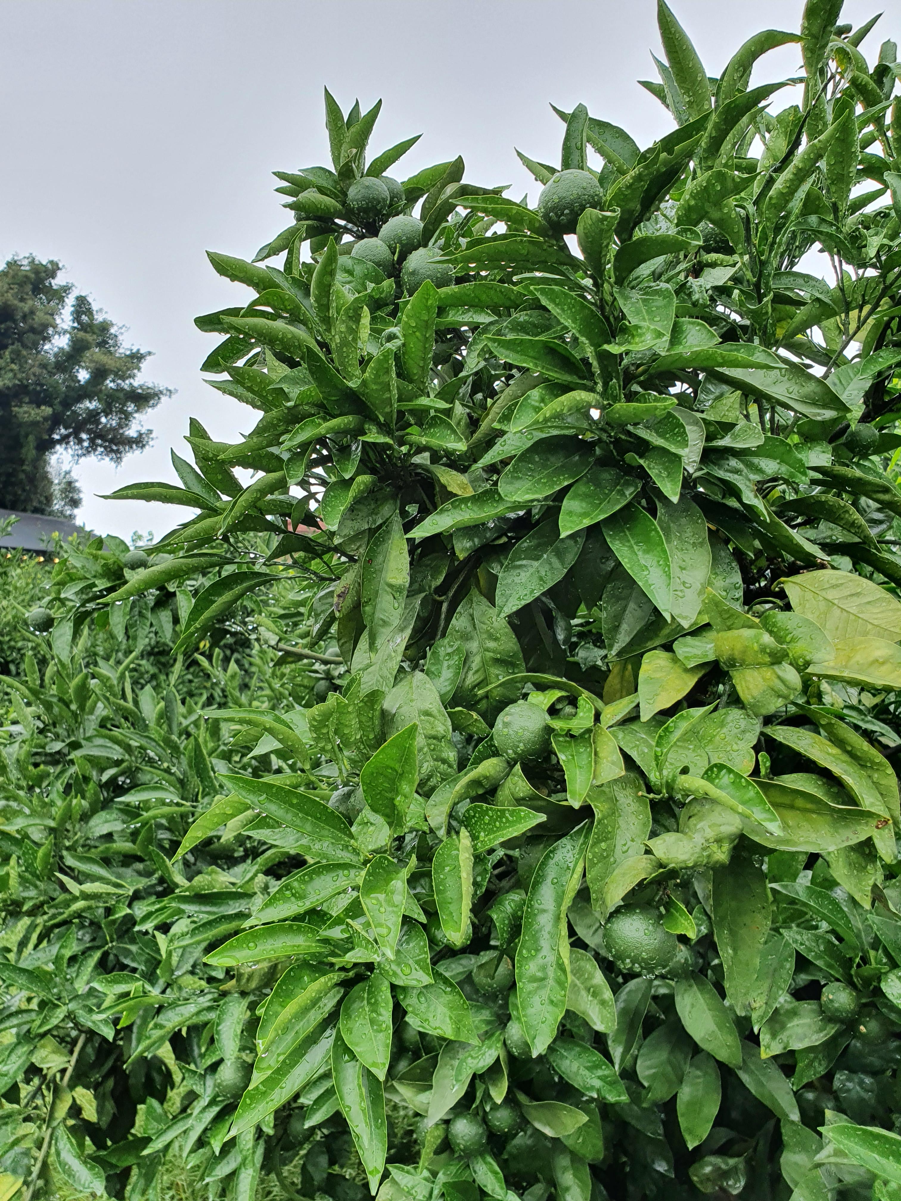 오잉! 초록색 나뭇잎 사이로 열매 보이시나요? 귤인가봐요. 아직 안익어서 청귤상태인 것 같은데 새벽에 비가 와서 그런지 빗물이 맺혀 있어서 더 싱그러워 보여요.