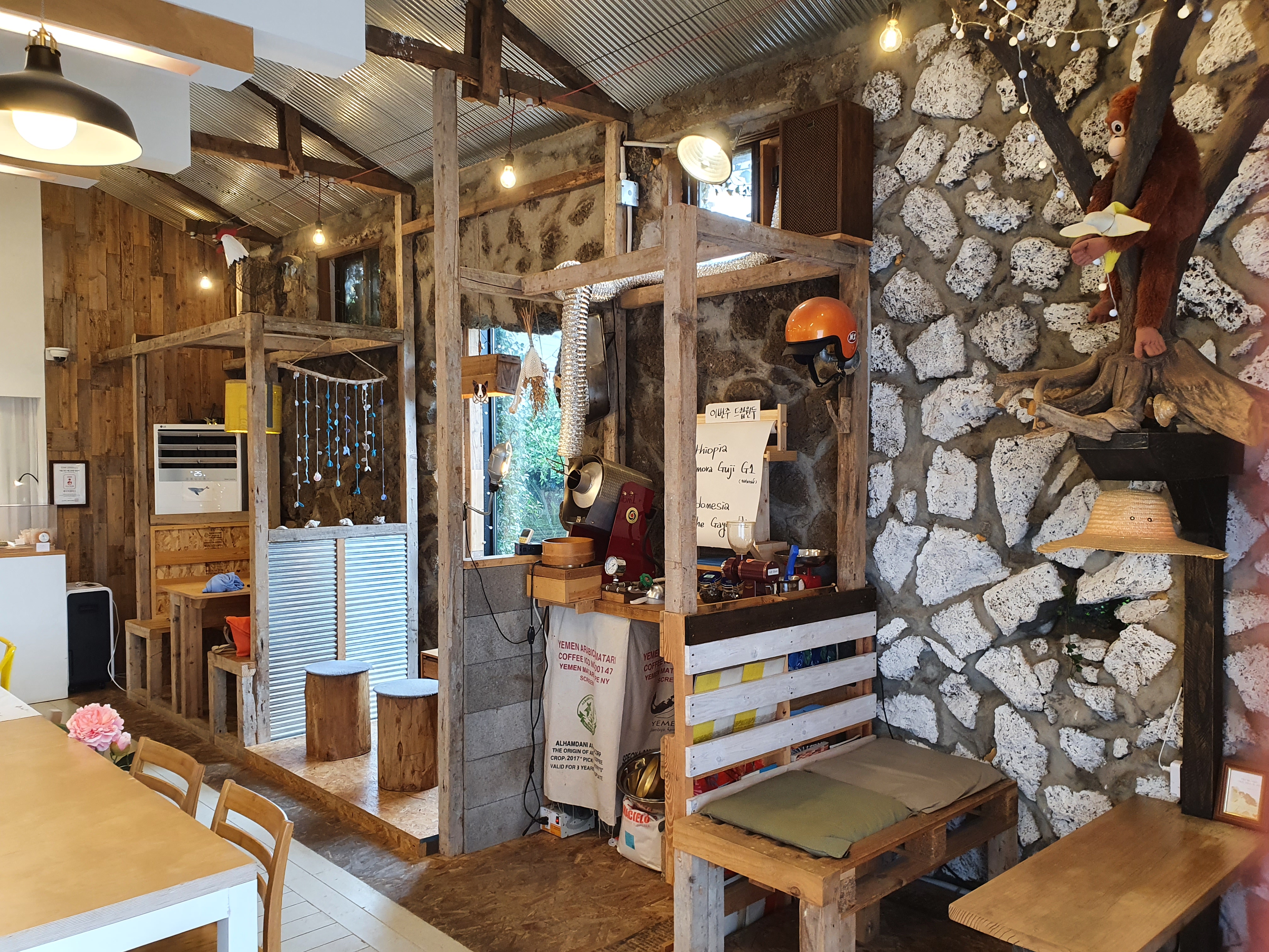 카페 내부도 꽤나 자연친화적입니다. 돌로 인테리어한 벽과 나믄 테이블과 나무의자에요.