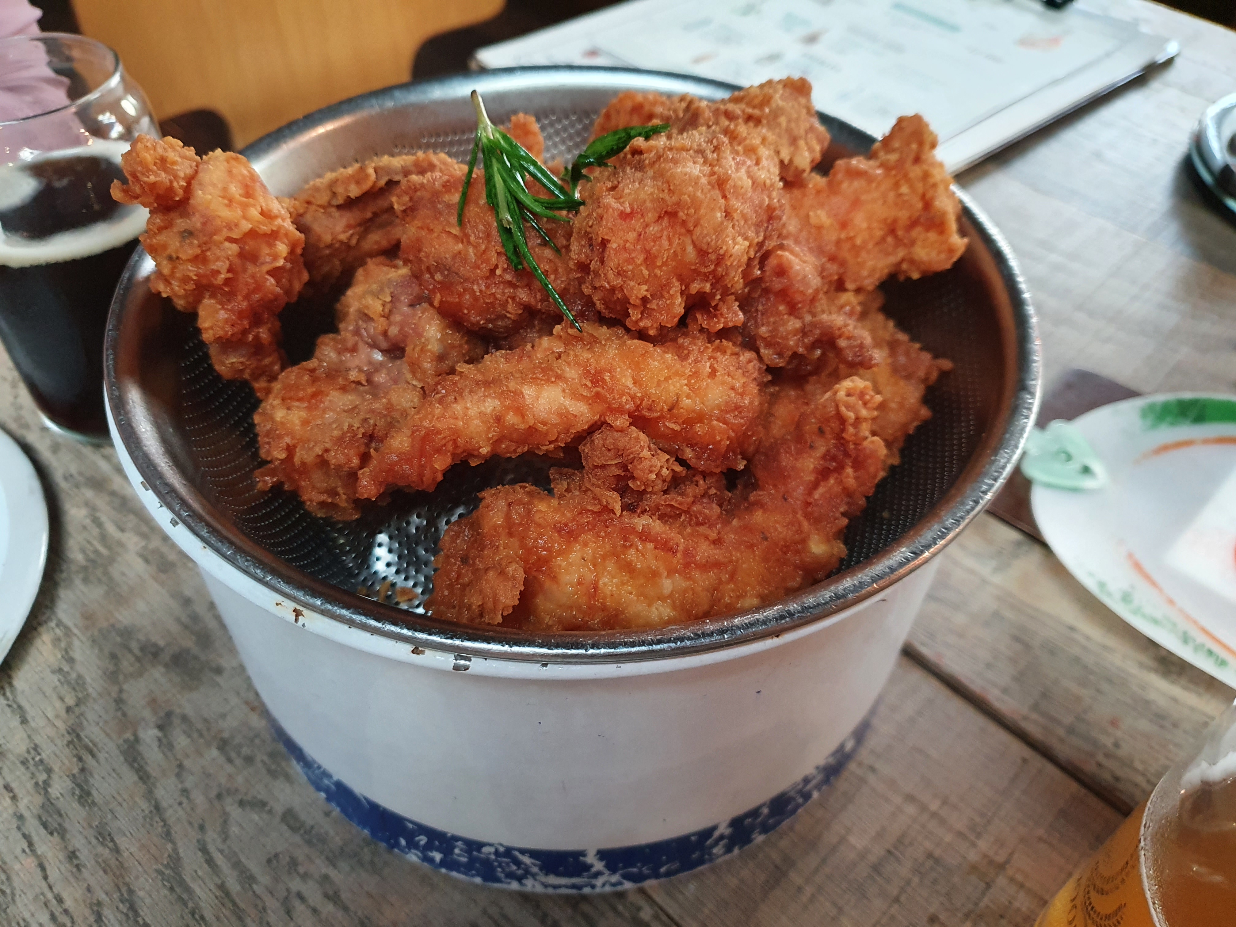 맥주가 먼저 나오고 차례대로 음식이 나왔는데요, 치킨 비주얼이... 장난아니죠? 저희는 이렇게 시켜서 네명이서 먹었어요. 부족함 없이 딱 맞았답니다. 저녁식사를 하고 오시는거라면 감자튀김만 시켜도 될 것 같아요.