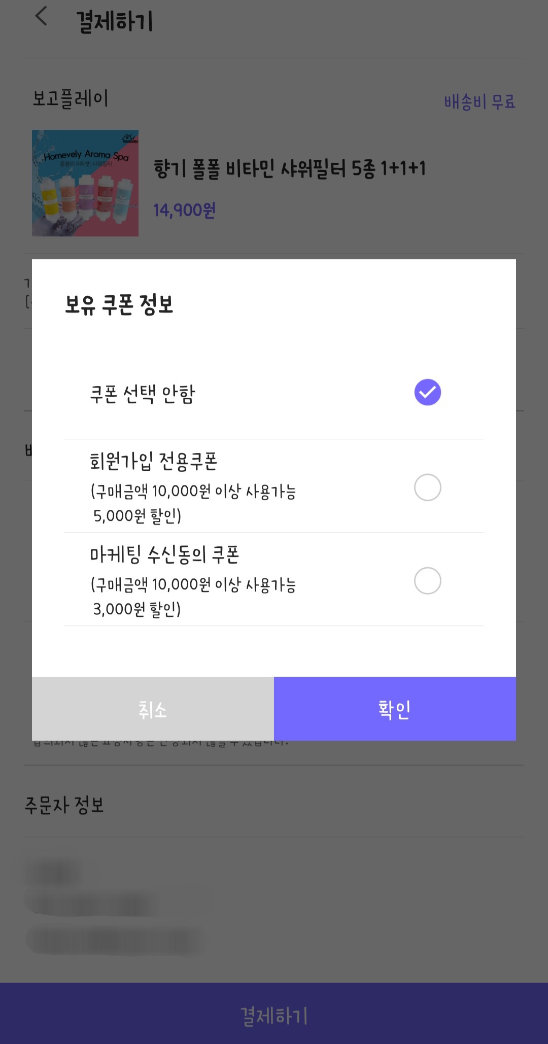 구매하기를 누르면 결제창이 뜨는데 쿠폰이나 배송비요청사항 등을 선택할 수 있습니다.