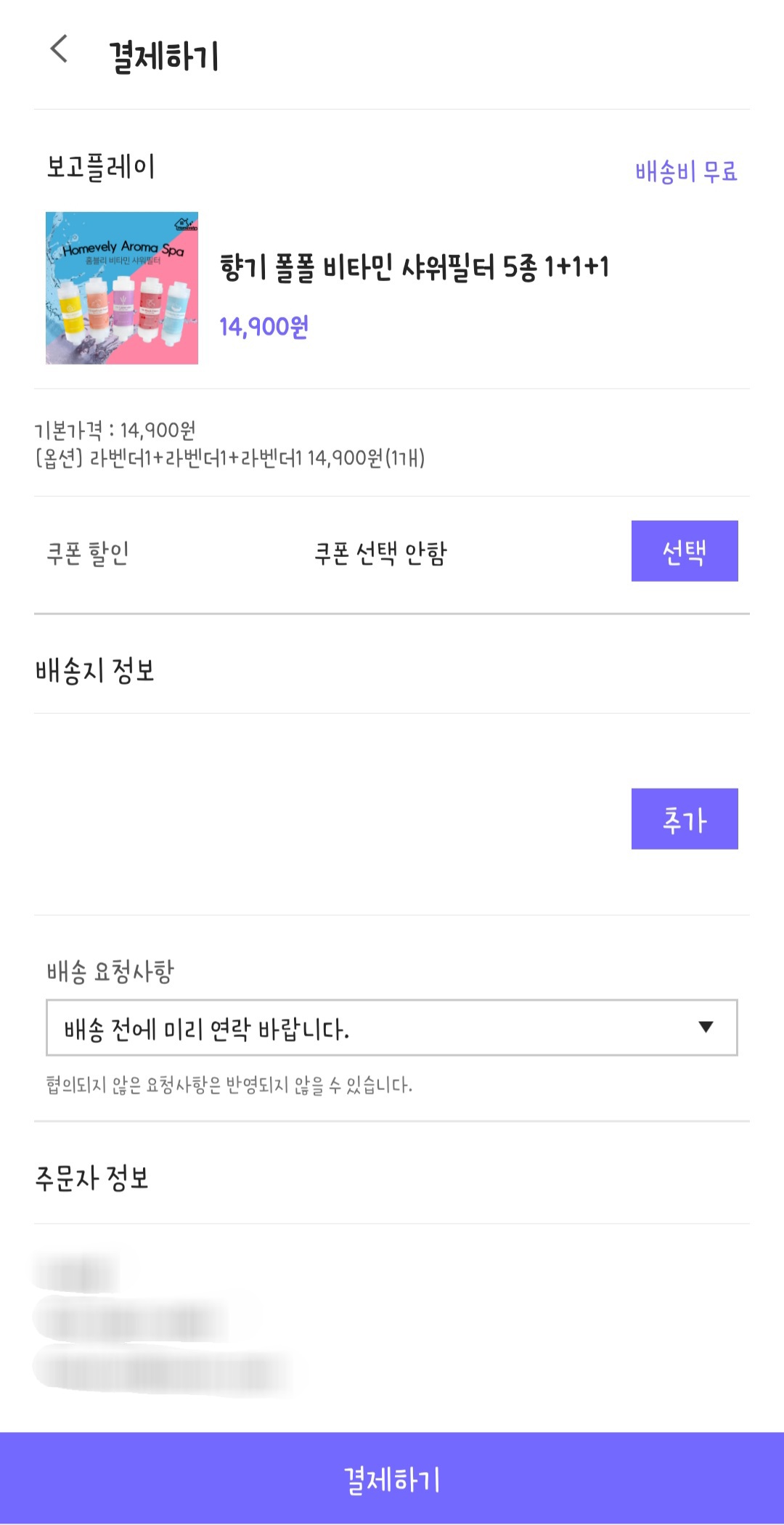 구매하기를 누르면 결제창이 뜨는데 쿠폰이나 배송비요청사항 등을 선택할 수 있습니다.