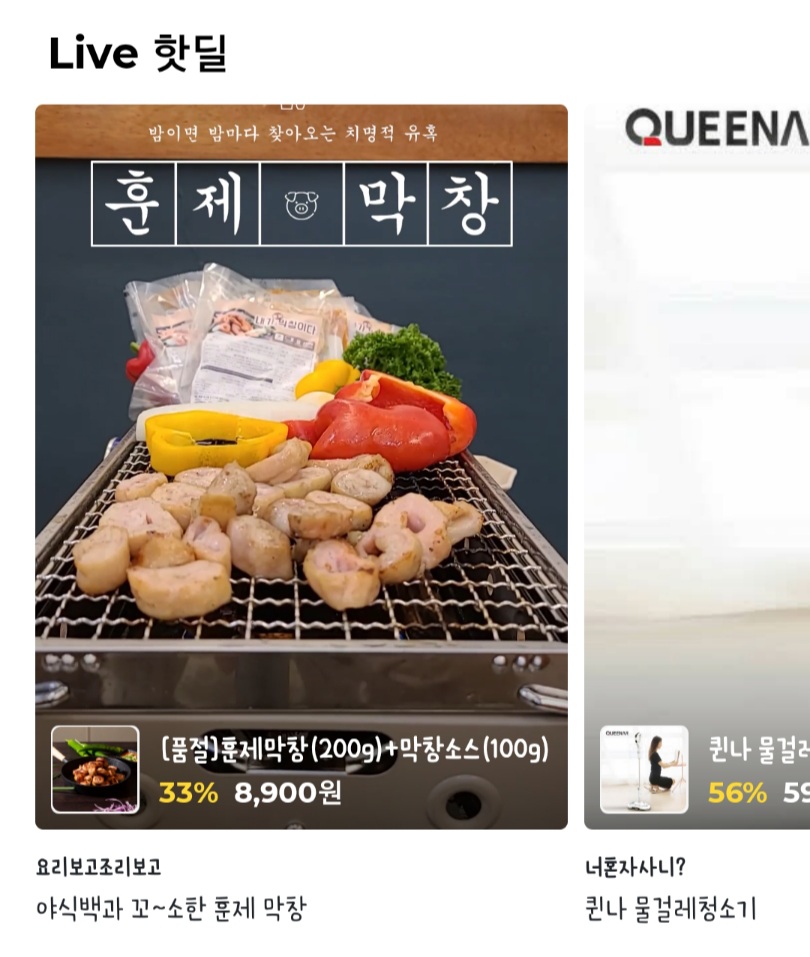 가입을 하고 앱을 둘러보면 현재 live로 판매되고 있는 제품들이 쭉 보입니다. 관심있는게 생기면 눌러서 라이브 방송을 보실 수 있어요.