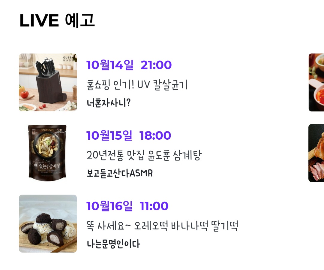 그리고 그 아래에는 라이브방송 예고가 안내되는데 날짜와 시간을 확인하시고 관심가는 상품이 방송되는 시간에 들어가보면 되겠죠?