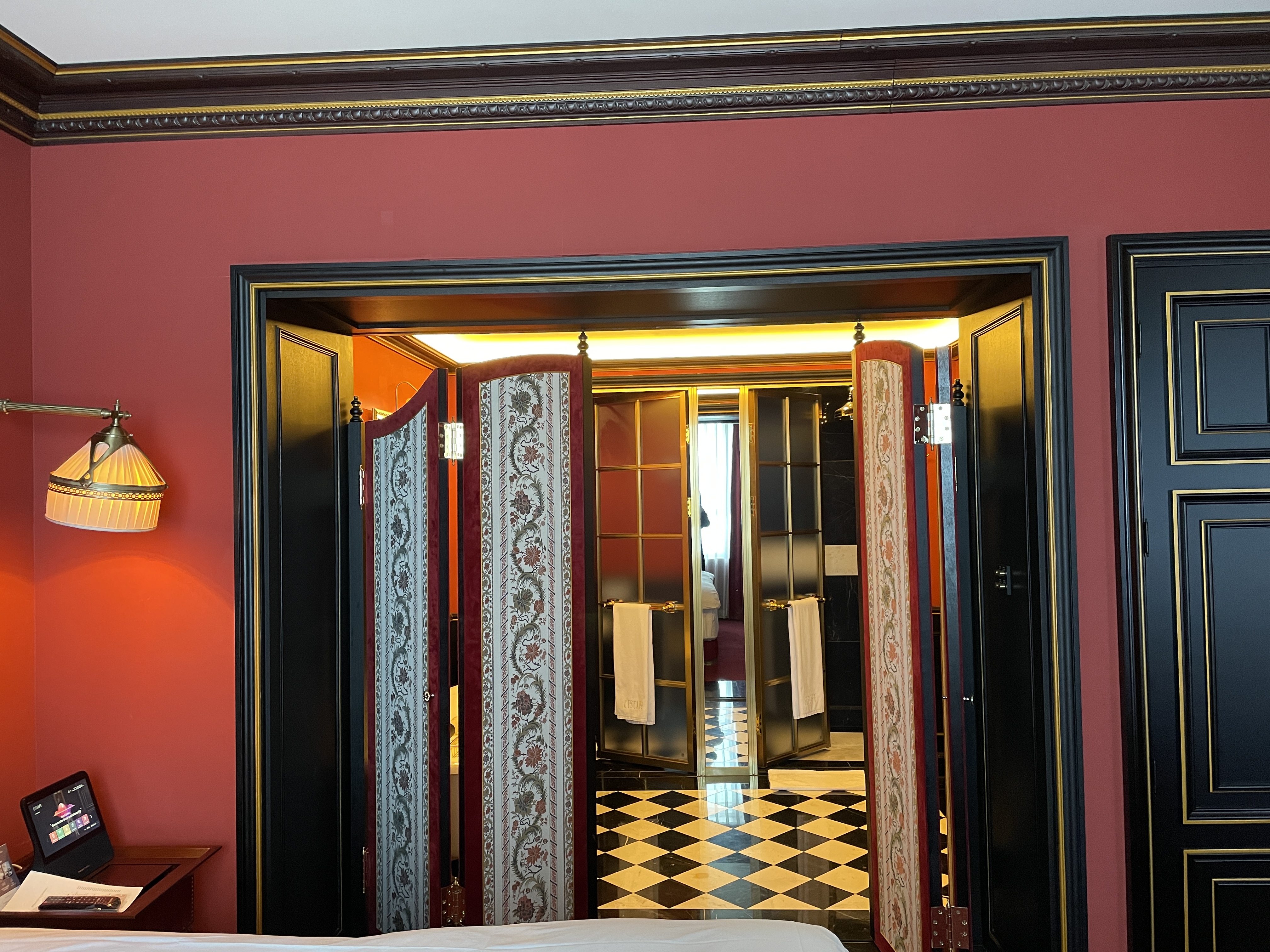 여기는 욕실입니다. 저런 병풍은 정말 브리저튼이나 마리 앙투아네트 영화에서나 보던 건데 실제로 이렇게 사용해보다니 신기했습니다. 사실 저 병풍은 안쳐도 무방하긴 하지만 화장실과 샤워부스 유리가 생각보다 많이 비쳐서 병풍을 치고 사용하는 것을 추천드립니다.