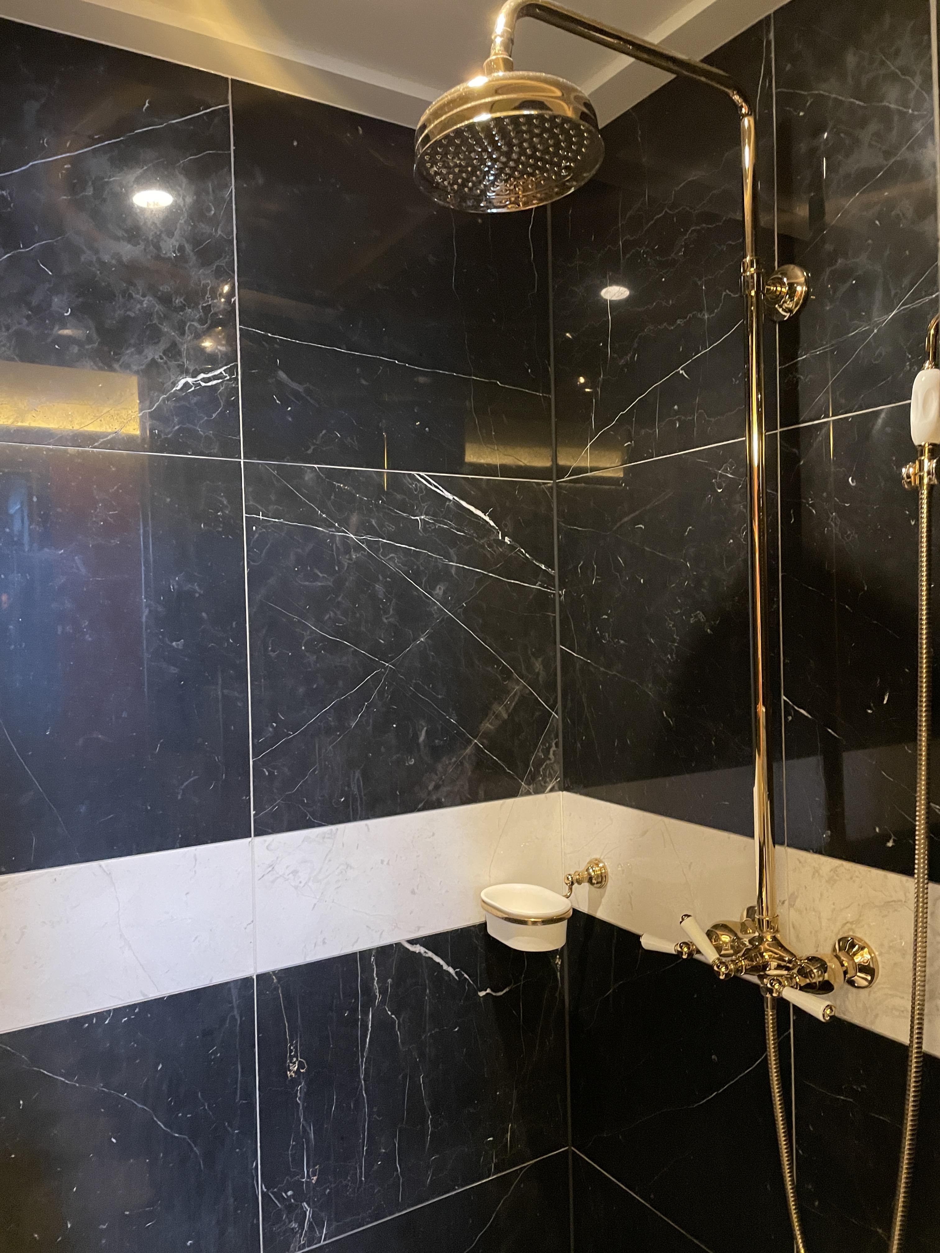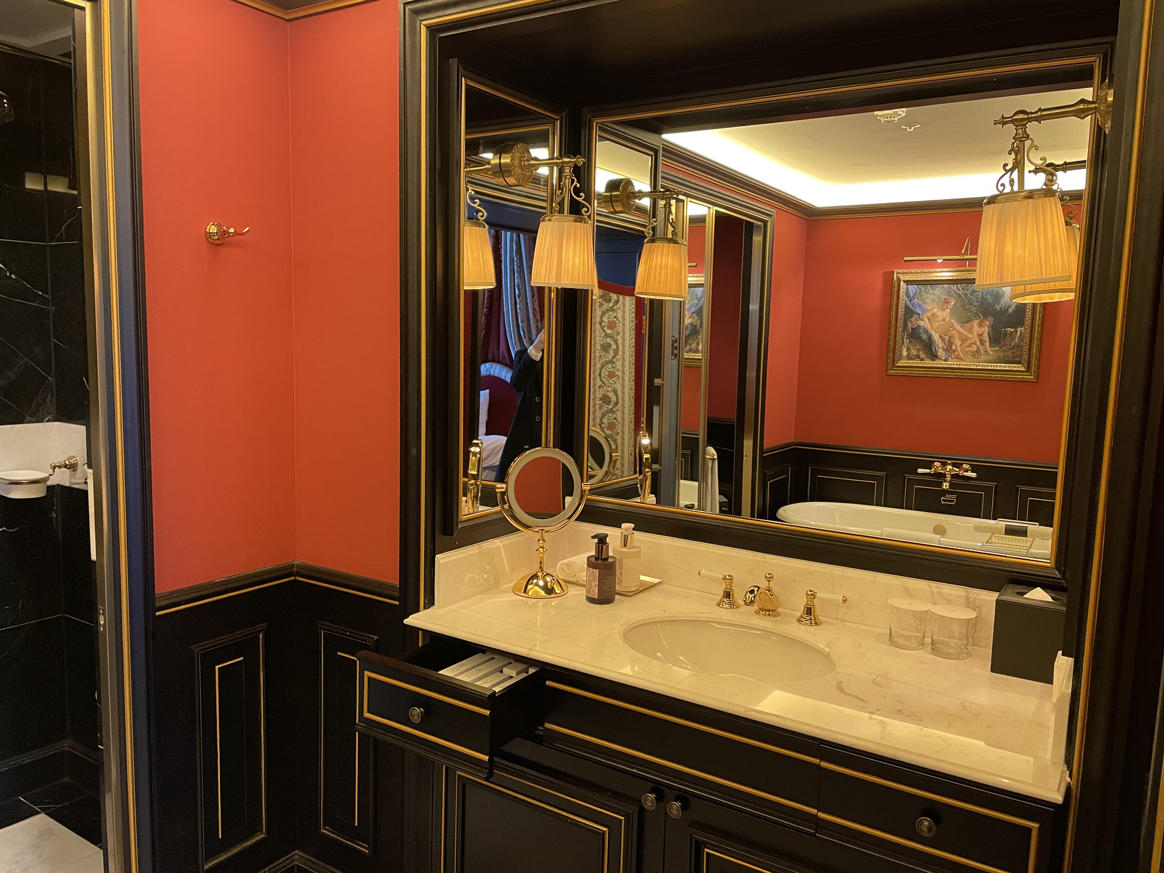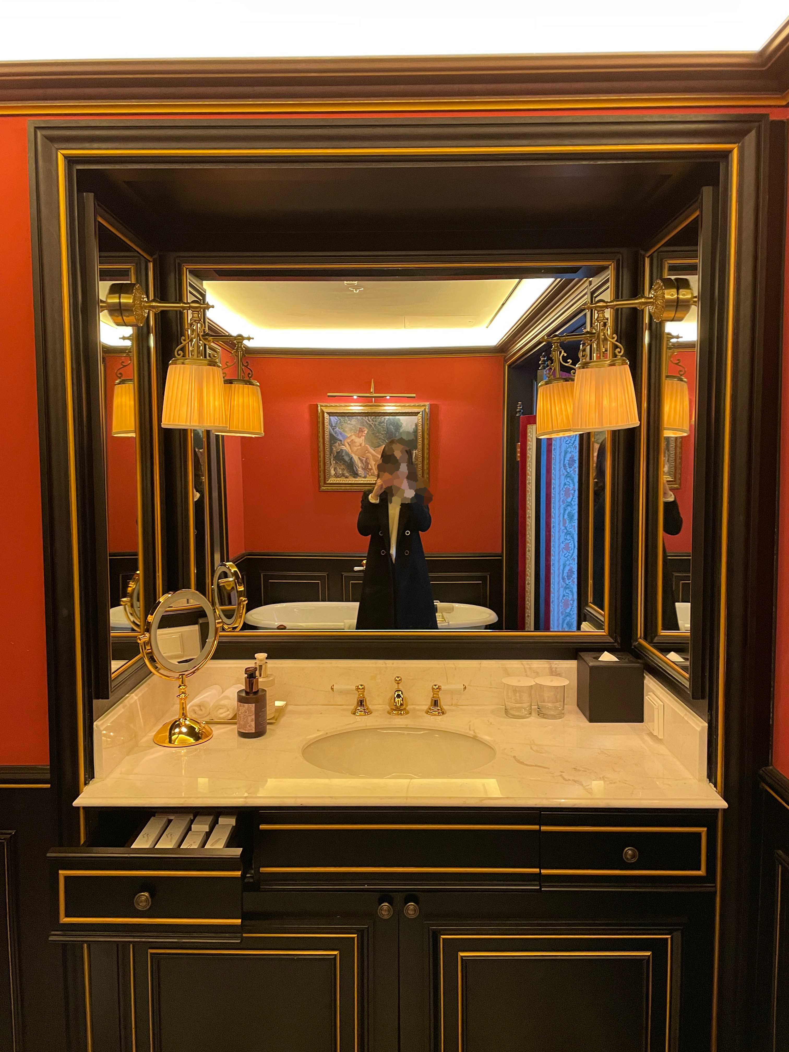 여기는 욕실입니다. 저런 병풍은 정말 브리저튼이나 마리 앙투아네트 영화에서나 보던 건데 실제로 이렇게 사용해보다니 신기했습니다. 사실 저 병풍은 안쳐도 무방하긴 하지만 화장실과 샤워부스 유리가 생각보다 많이 비쳐서 병풍을 치고 사용하는 것을 추천드립니다.