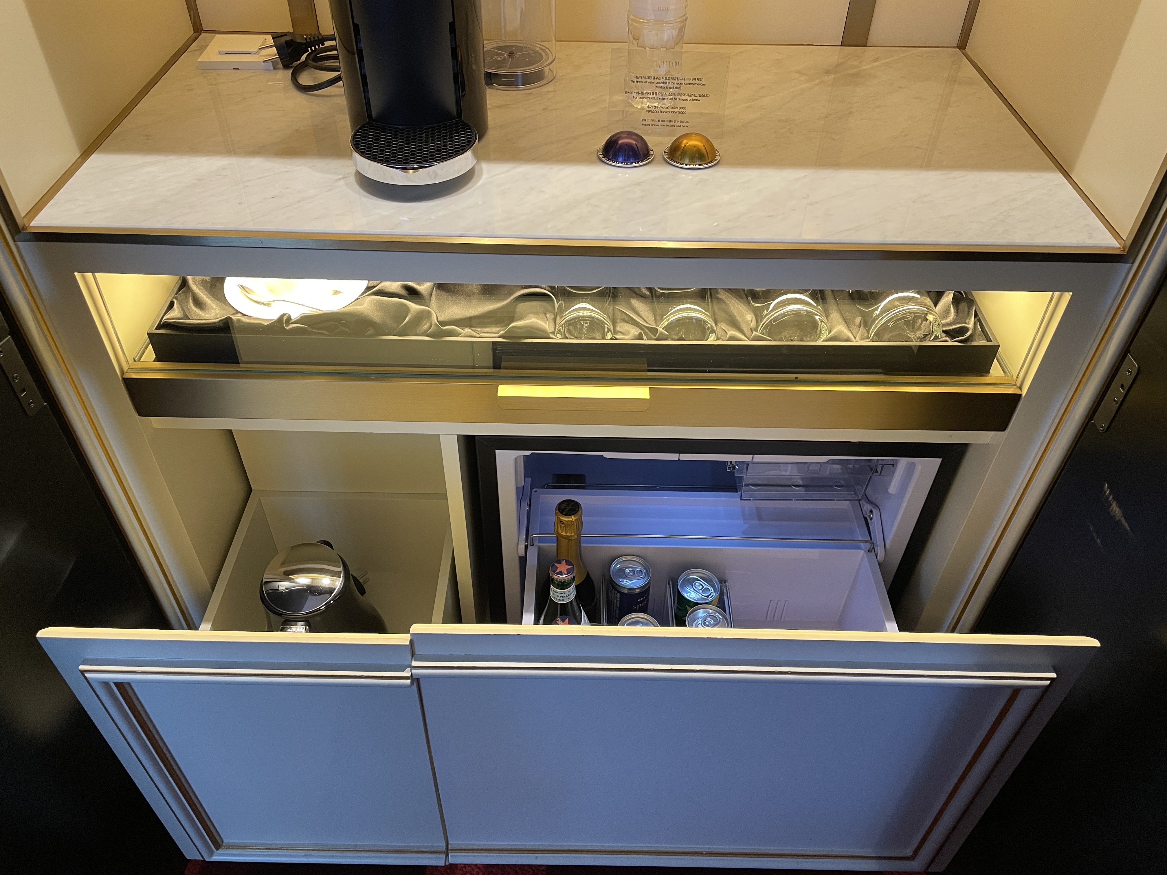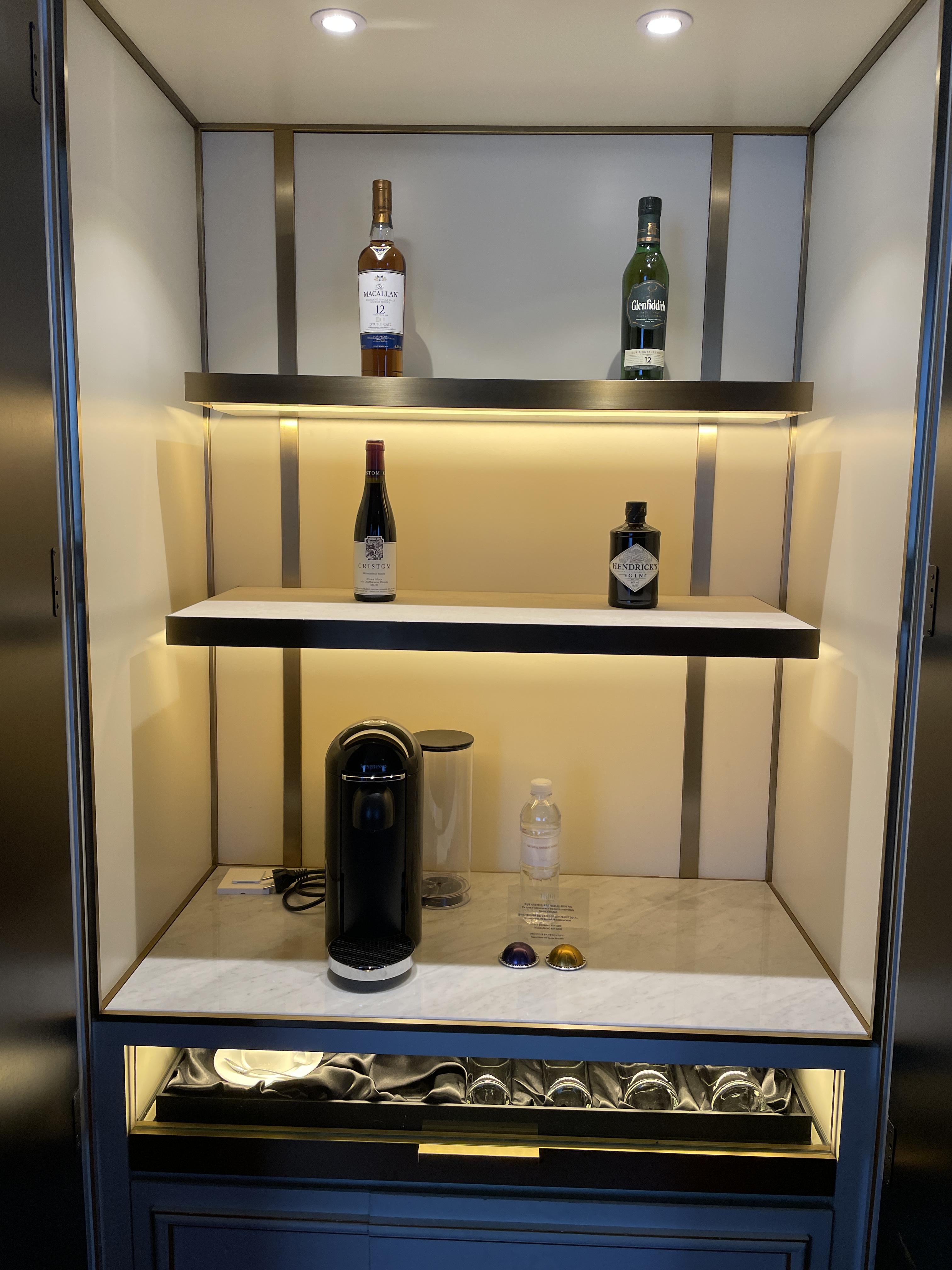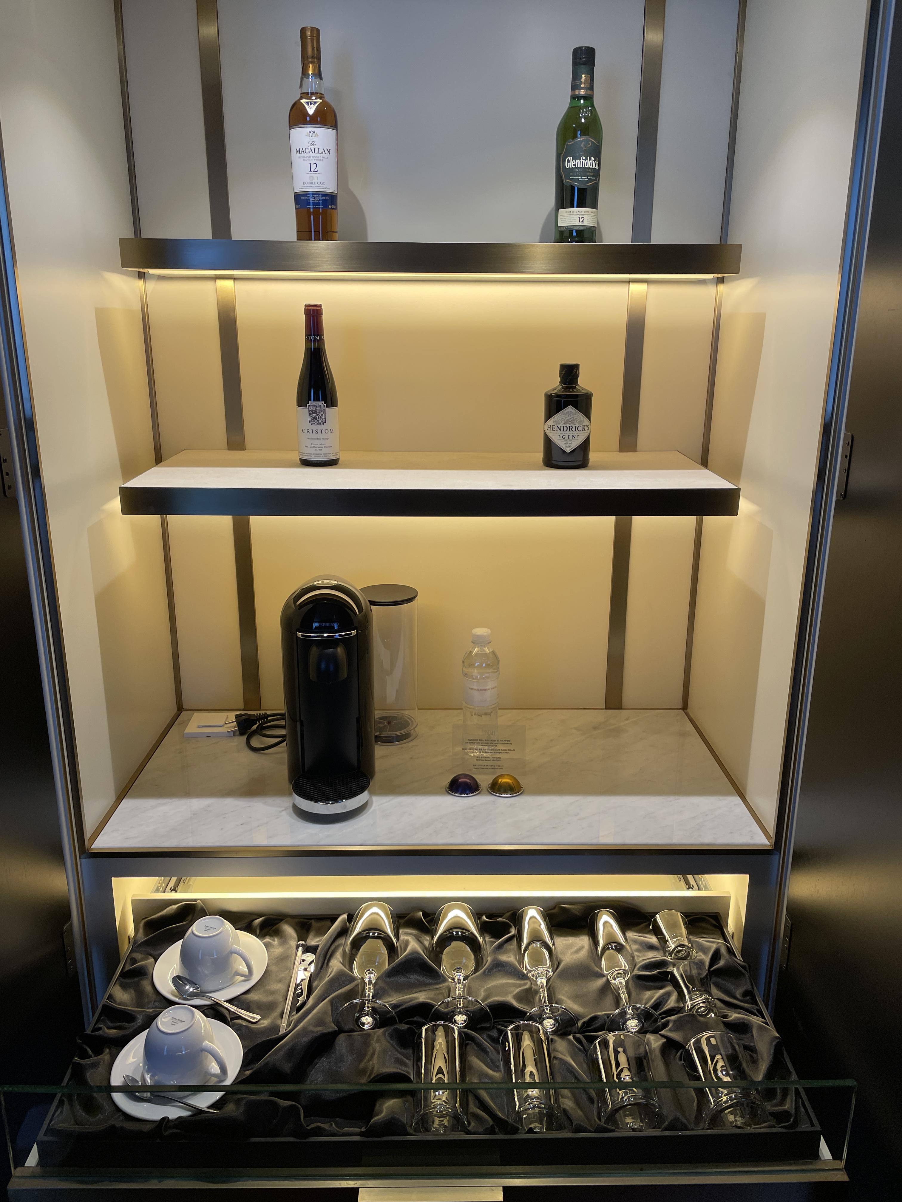 화장실 옆쪽 벽장을 열어보면 위스키와 와인, 커피머신, 물, 와인잔 등이 보입니다. 구비되어 있는 주류는 유료이기 때문에 가격을 확인하고 드시면 되겠고 커피머신은 커피 캡슐 두 개까지 무료로 사용할 수 있습니다. 와인잔이 담겨있는 서랍 아랫부분을 열어보면 커피포트와 냉장고가 준비되어 있어요.