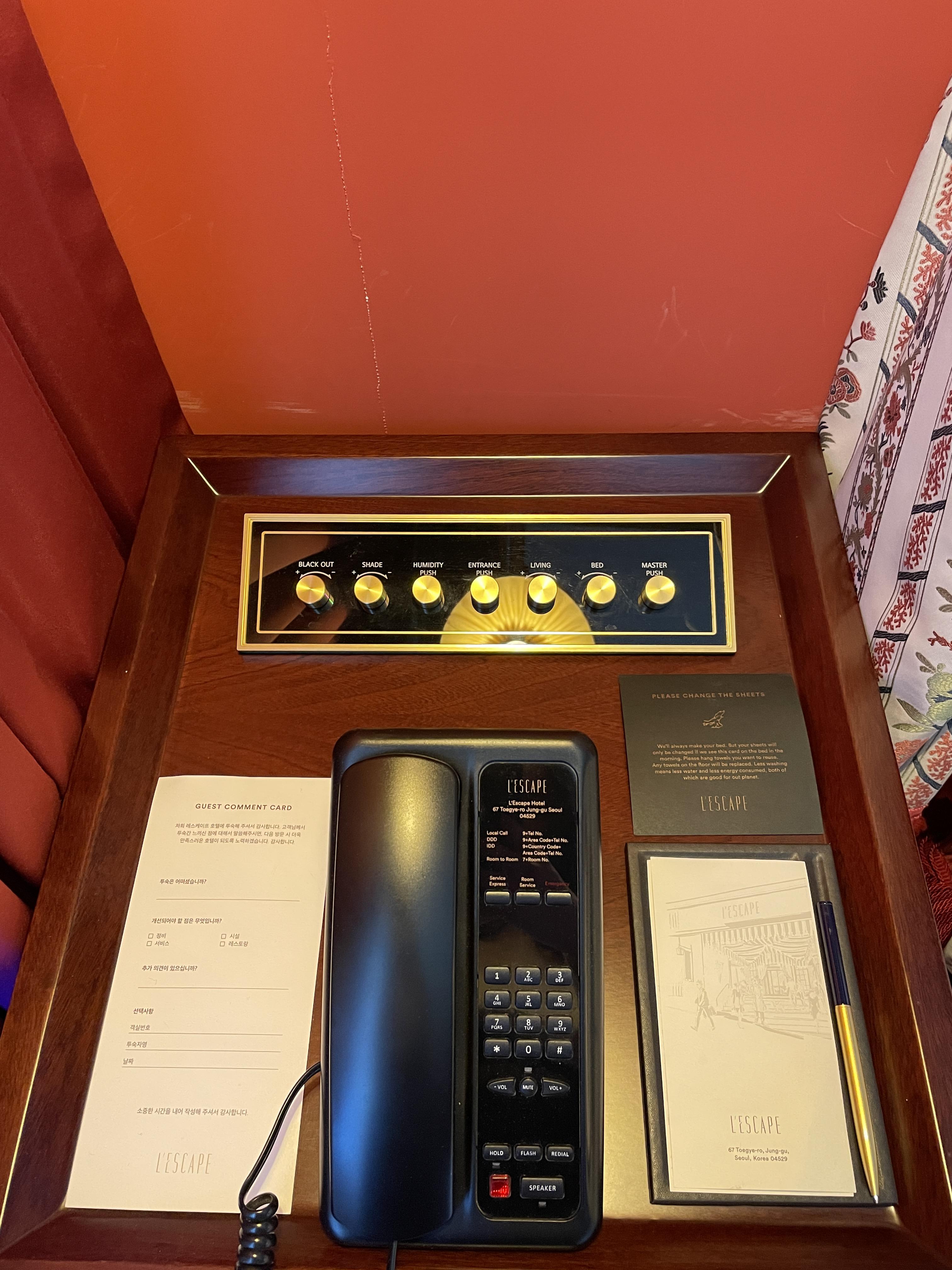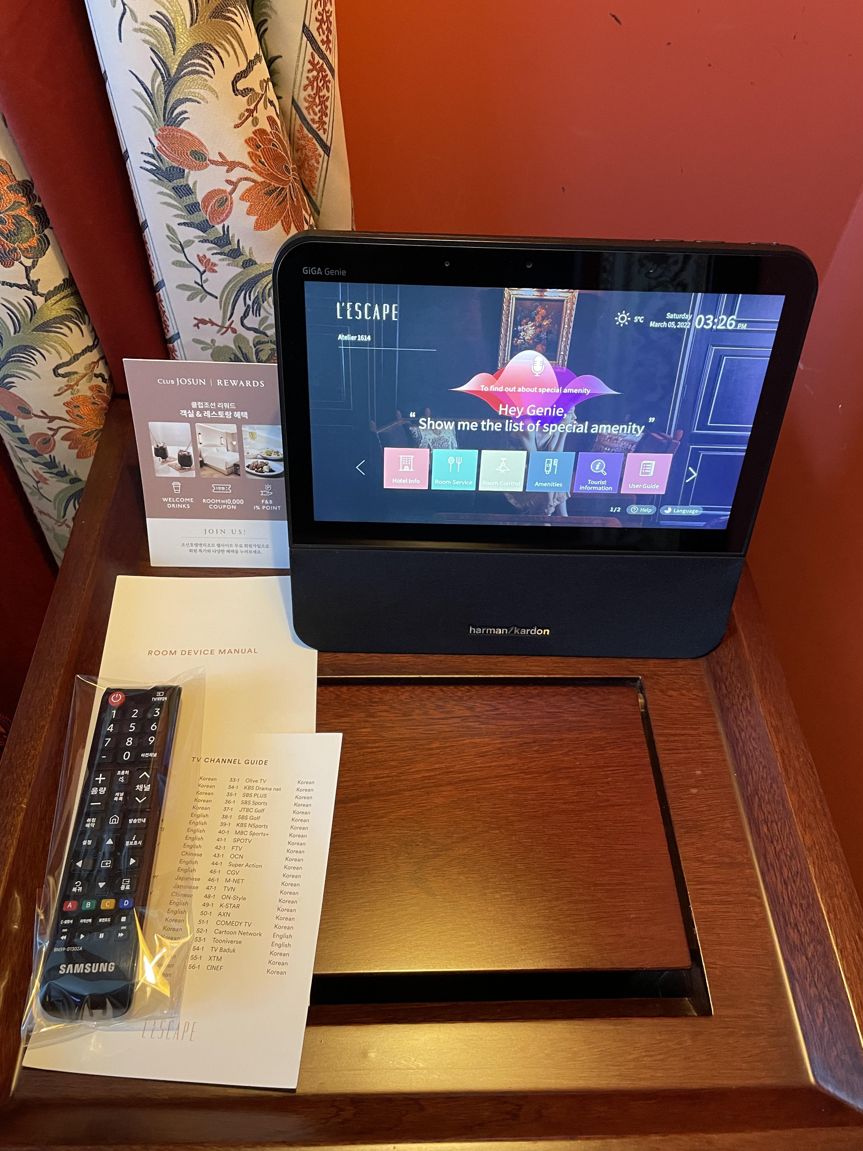 레스케이프 호텔은 기가 지니가 객실을 편리하게 사용할 수 있도록 도와주는데, 전자동 커튼 조절, 객실 내 조명 조절, 객실 온도 조절 등을 할 때 유용하게 활용할 수 있습니다. 침대 옆 협탁에 조명과 커튼을 수동으로 조절할 수 있는 컨트롤러도 있습니다.