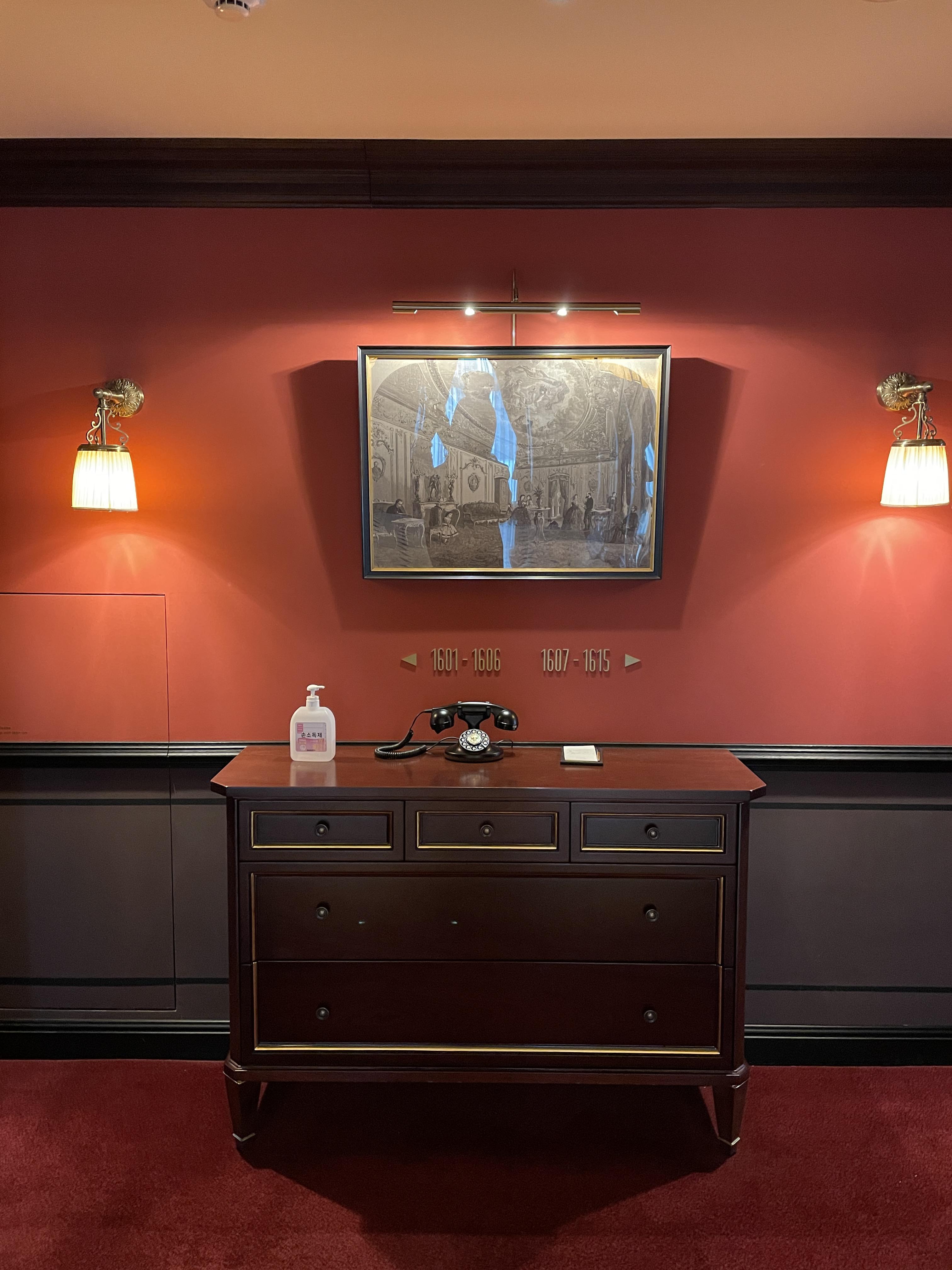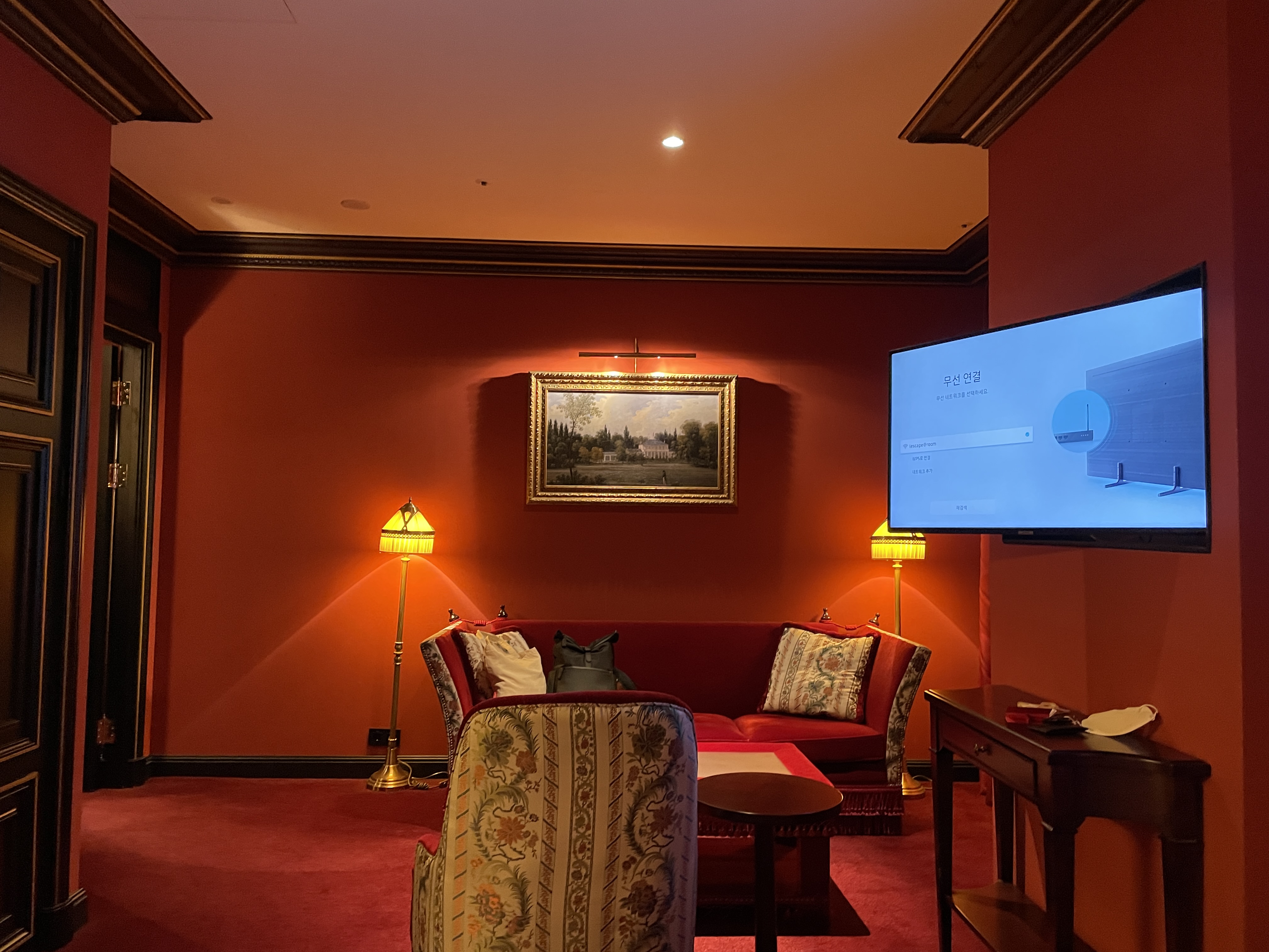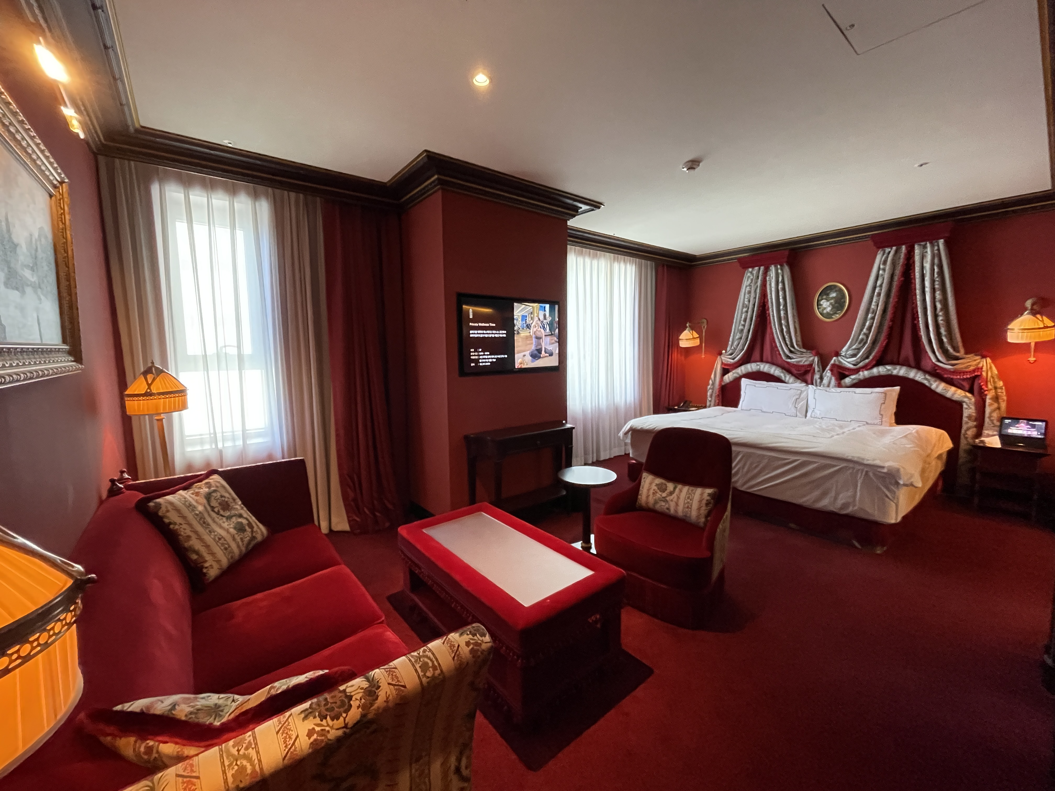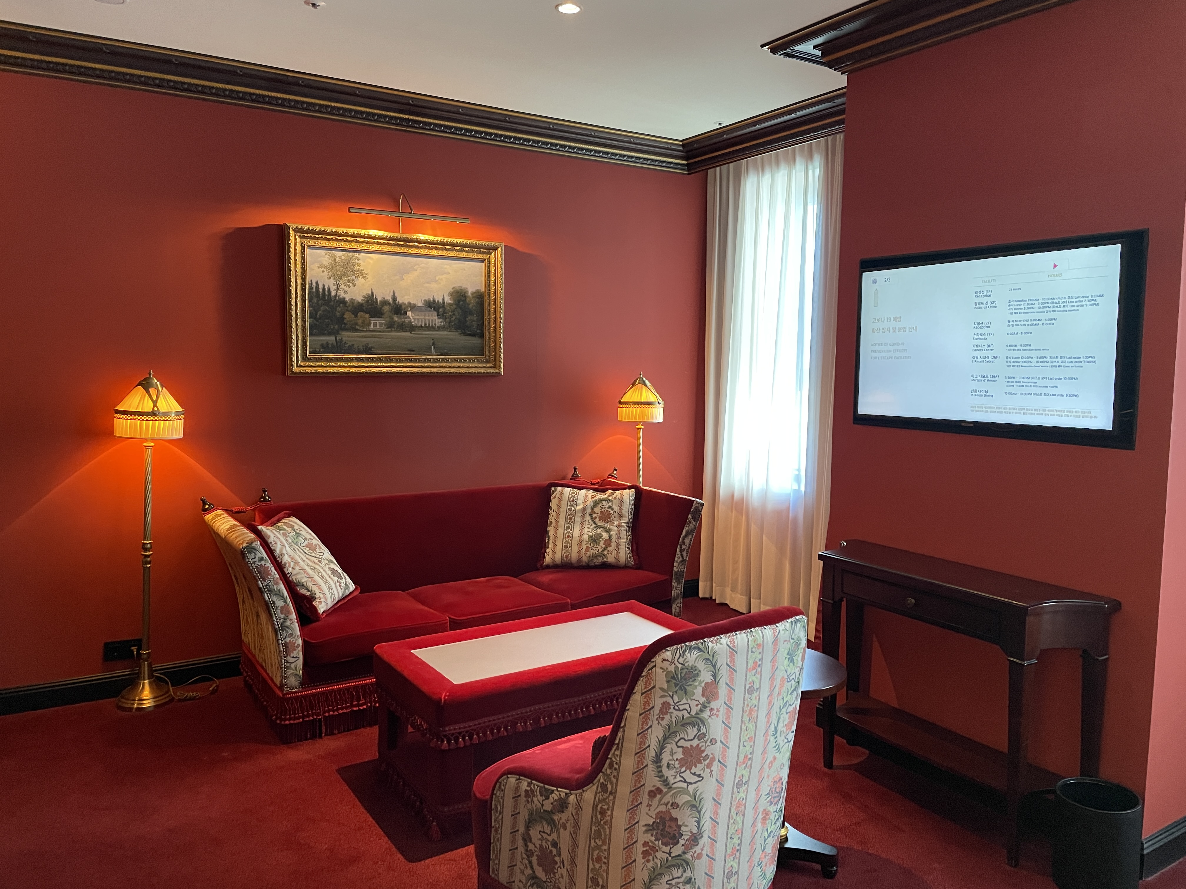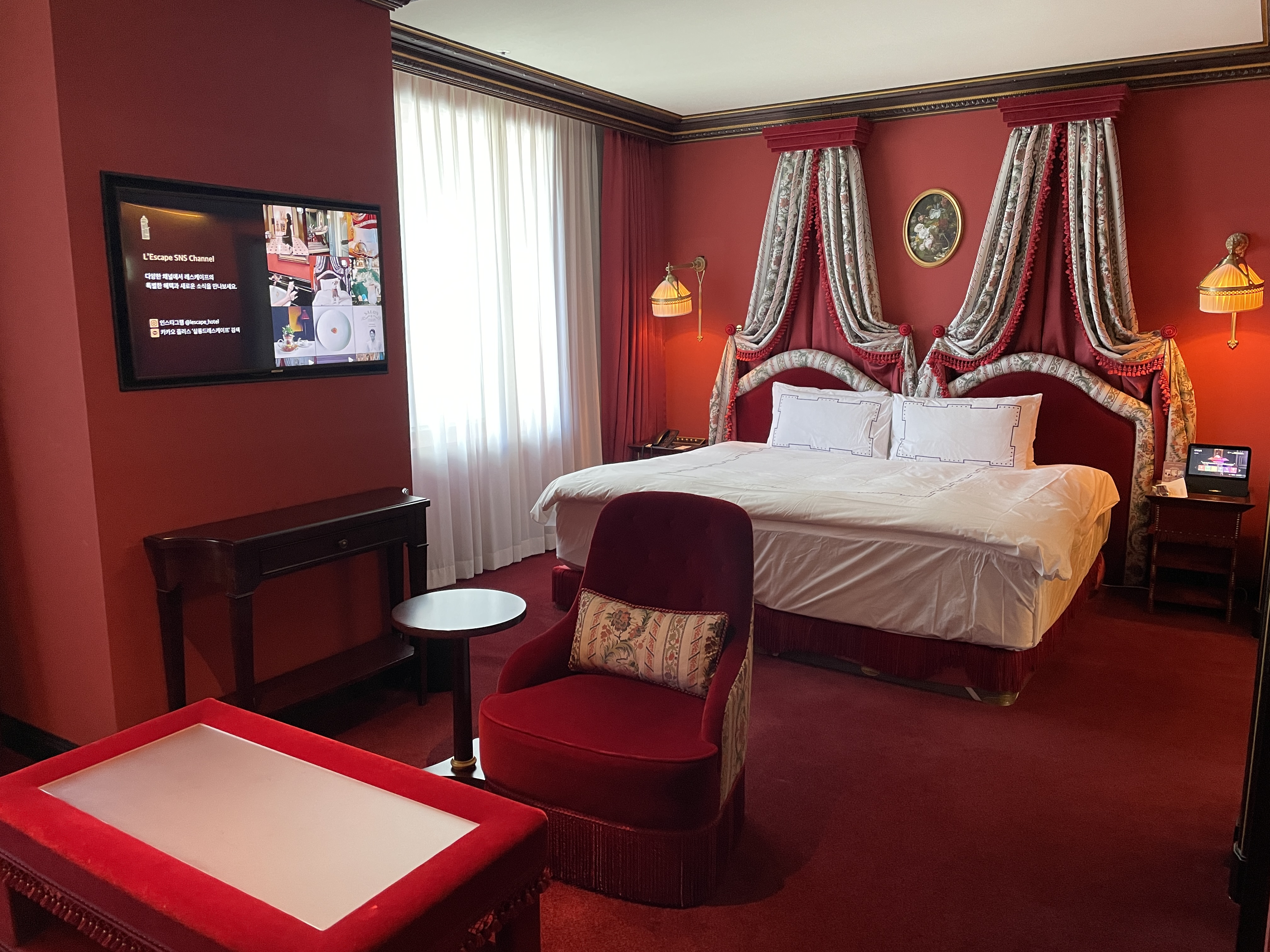 레스케이프 호텔의 특징은 객실 곳곳에 유럽풍 그림이 걸려있다는 건데요, 이런 그림을 보는 재미도 쏠쏠합니다. 벽지로 레드톤, 소파와 테이블도 레드톤으로 일관적인 컬러감을 나타내 사진이 참 고풍스럽게 나옵니다.