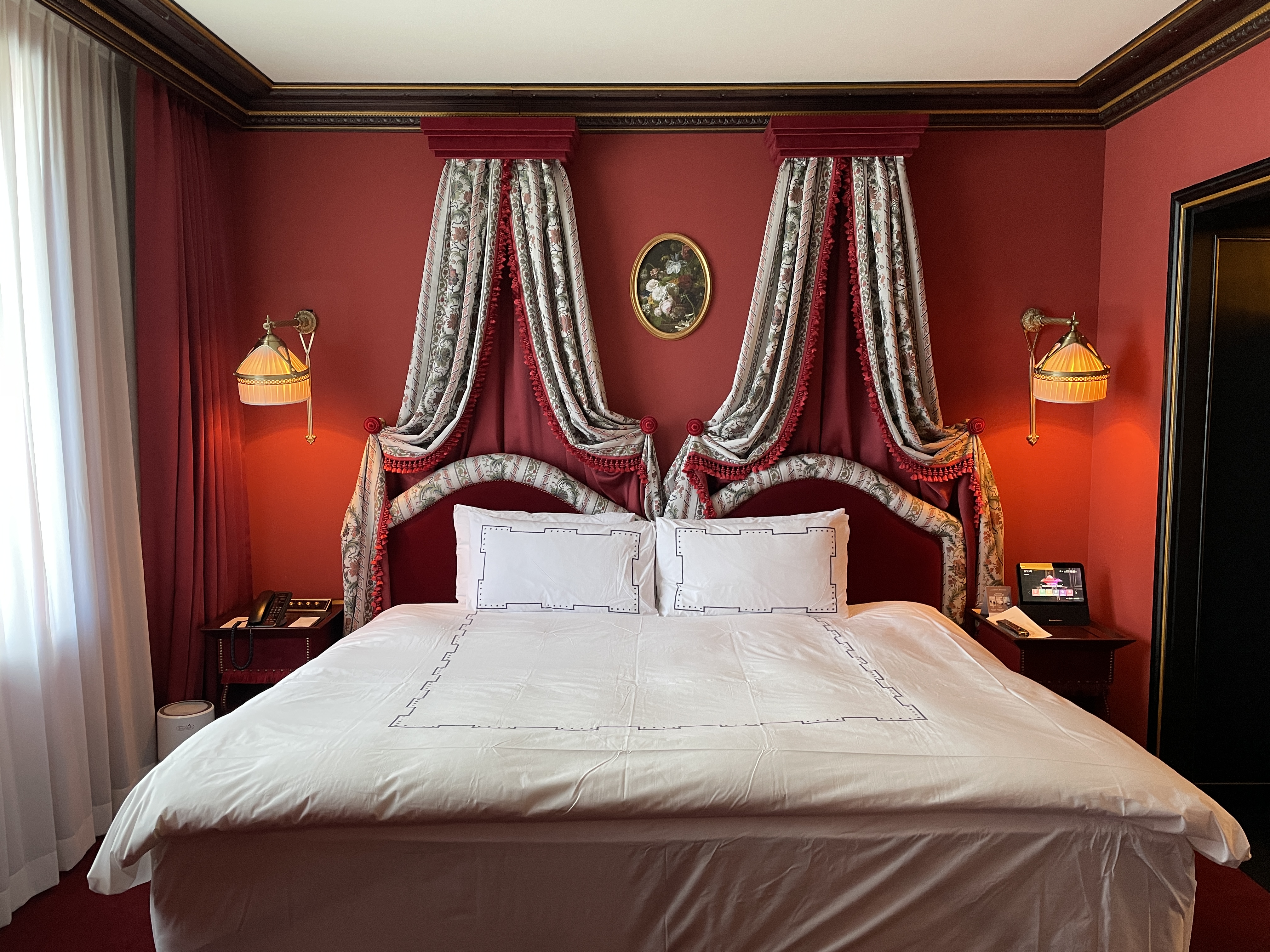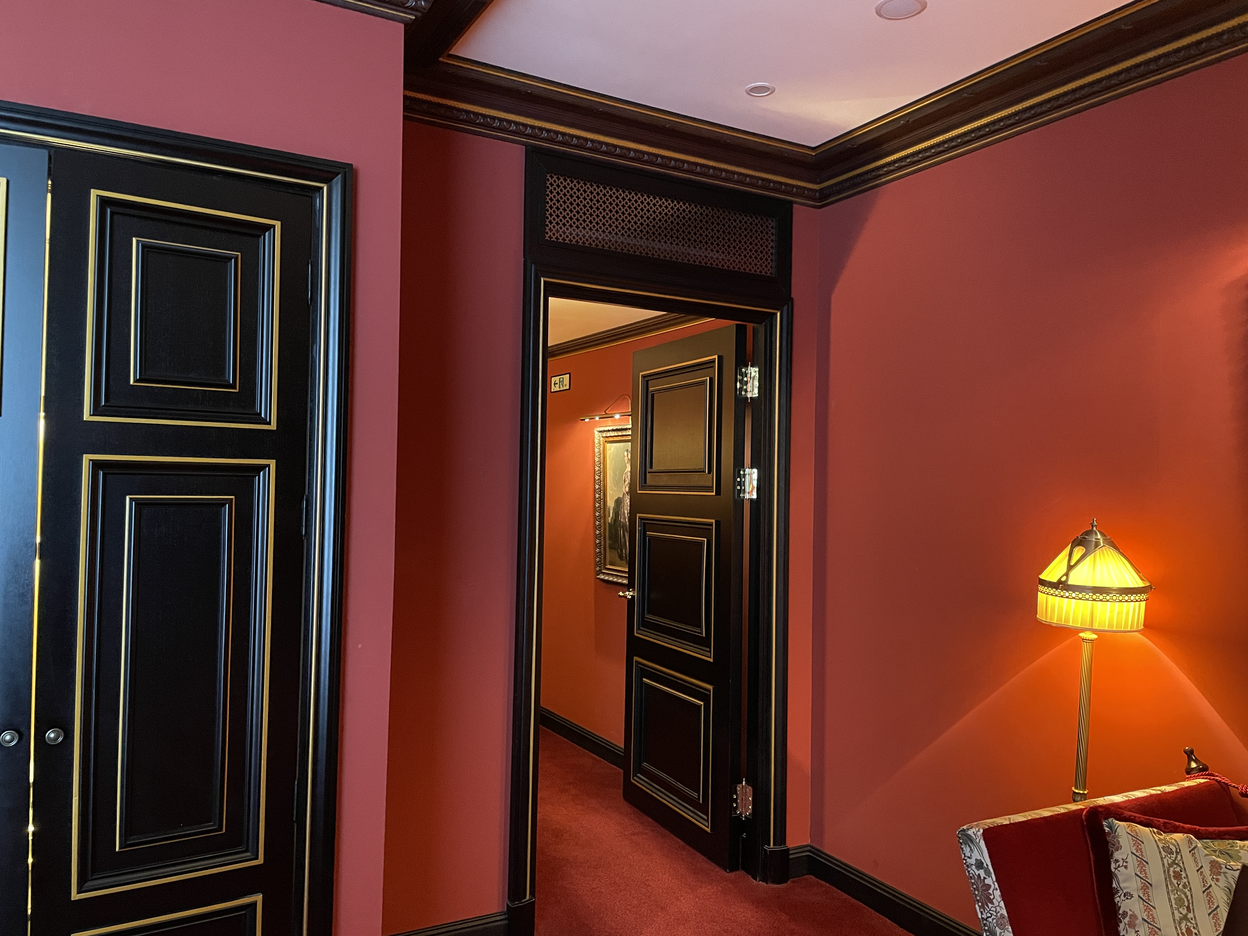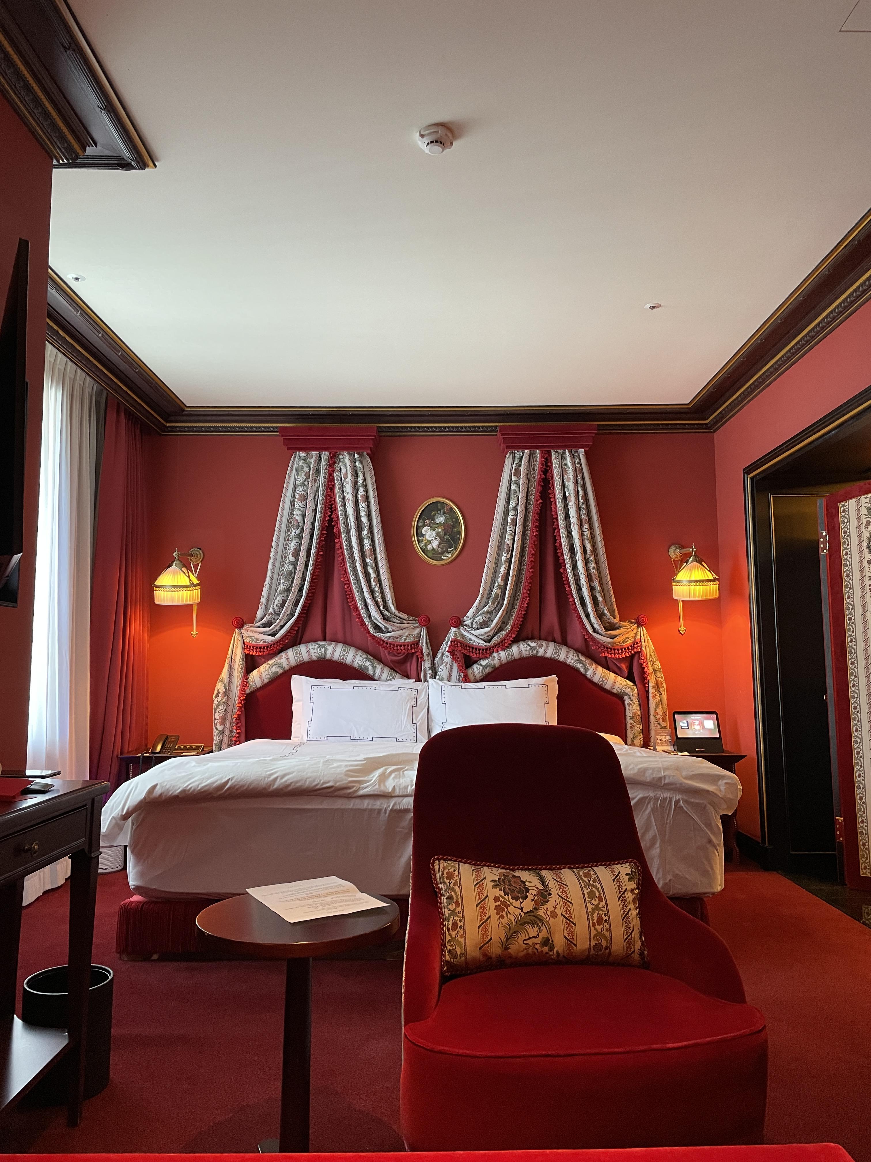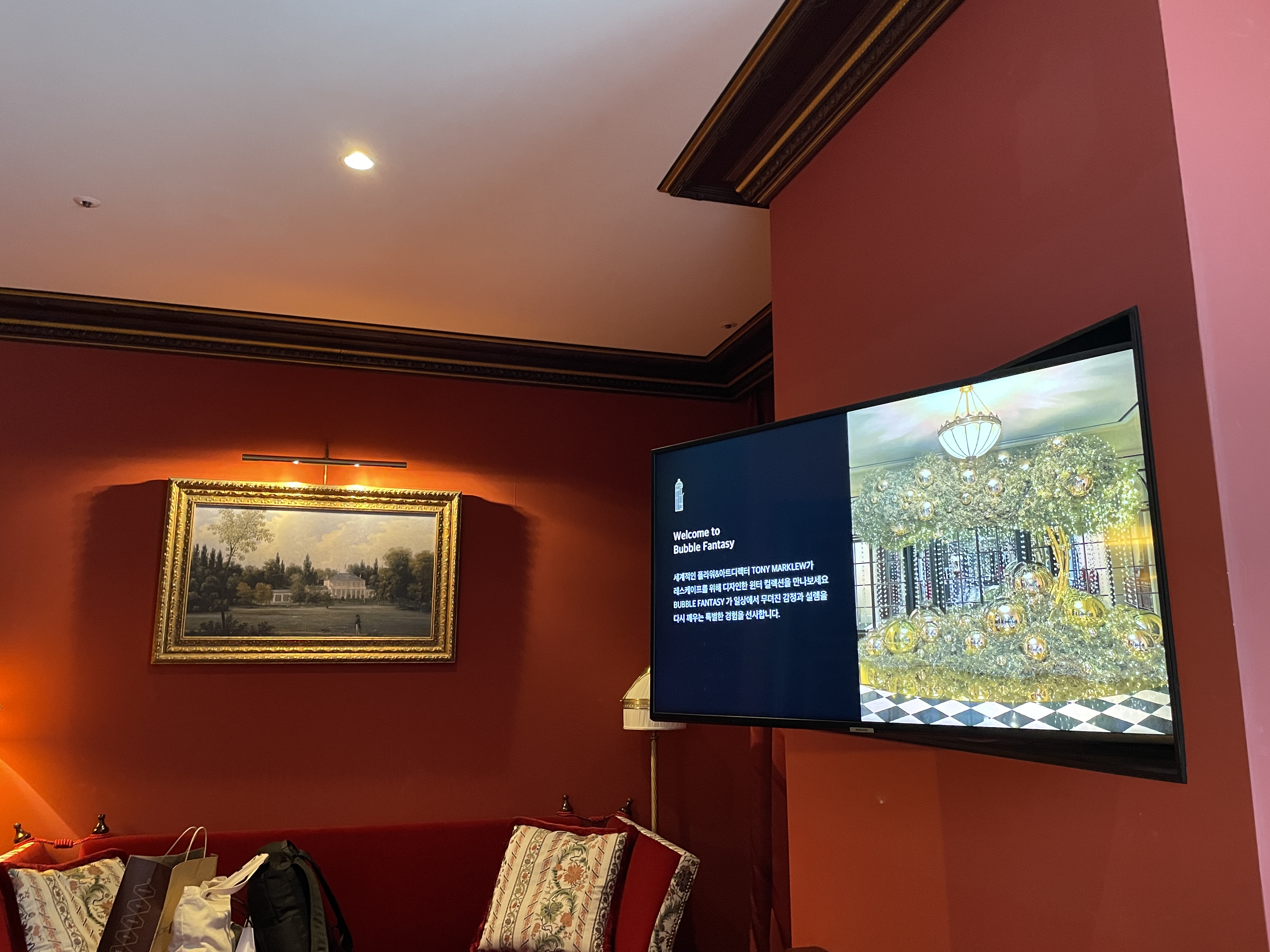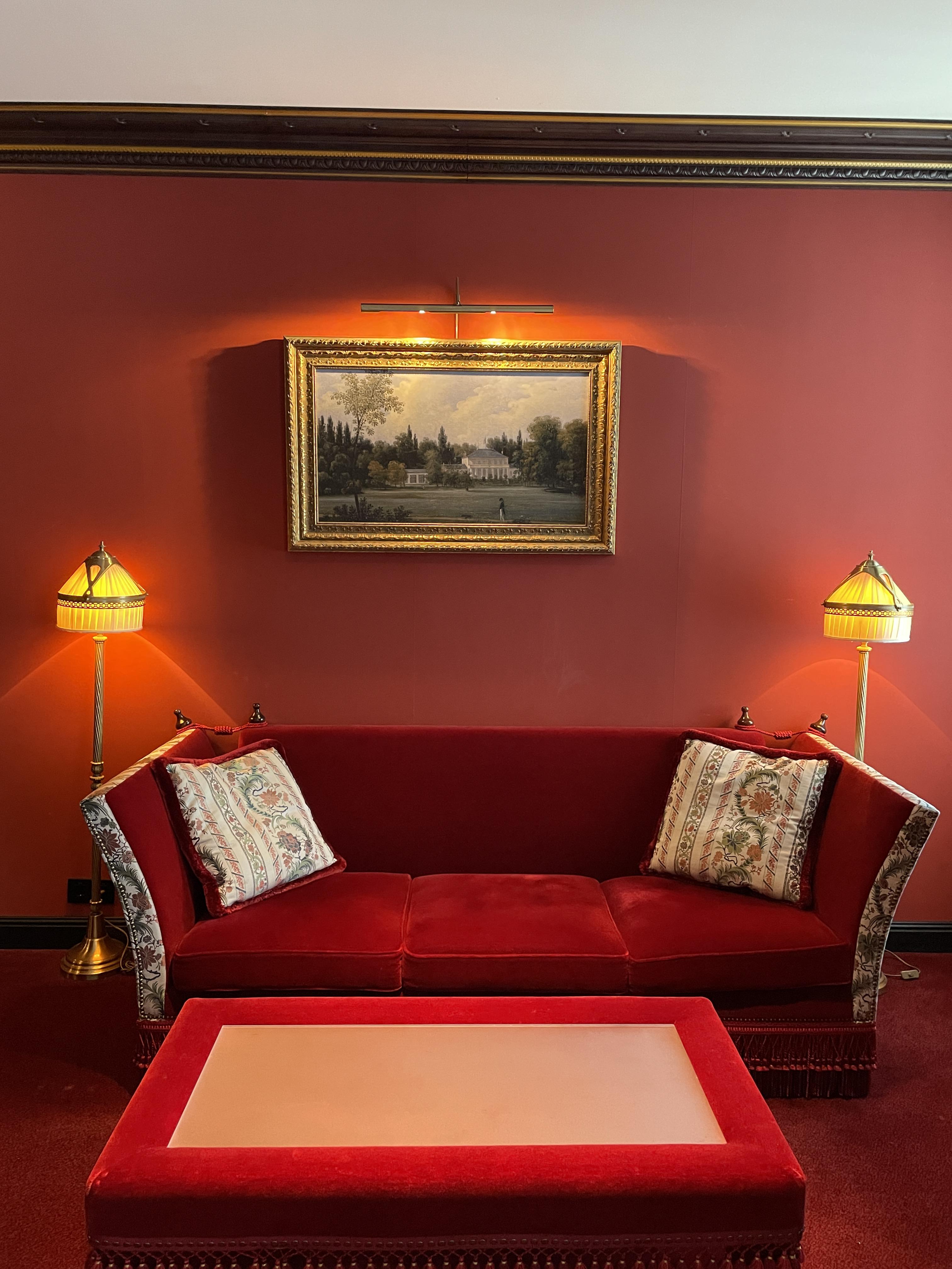 레스케이프 호텔의 특징은 객실 곳곳에 유럽풍 그림이 걸려있다는 건데요, 이런 그림을 보는 재미도 쏠쏠합니다. 벽지로 레드톤, 소파와 테이블도 레드톤으로 일관적인 컬러감을 나타내 사진이 참 고풍스럽게 나옵니다.