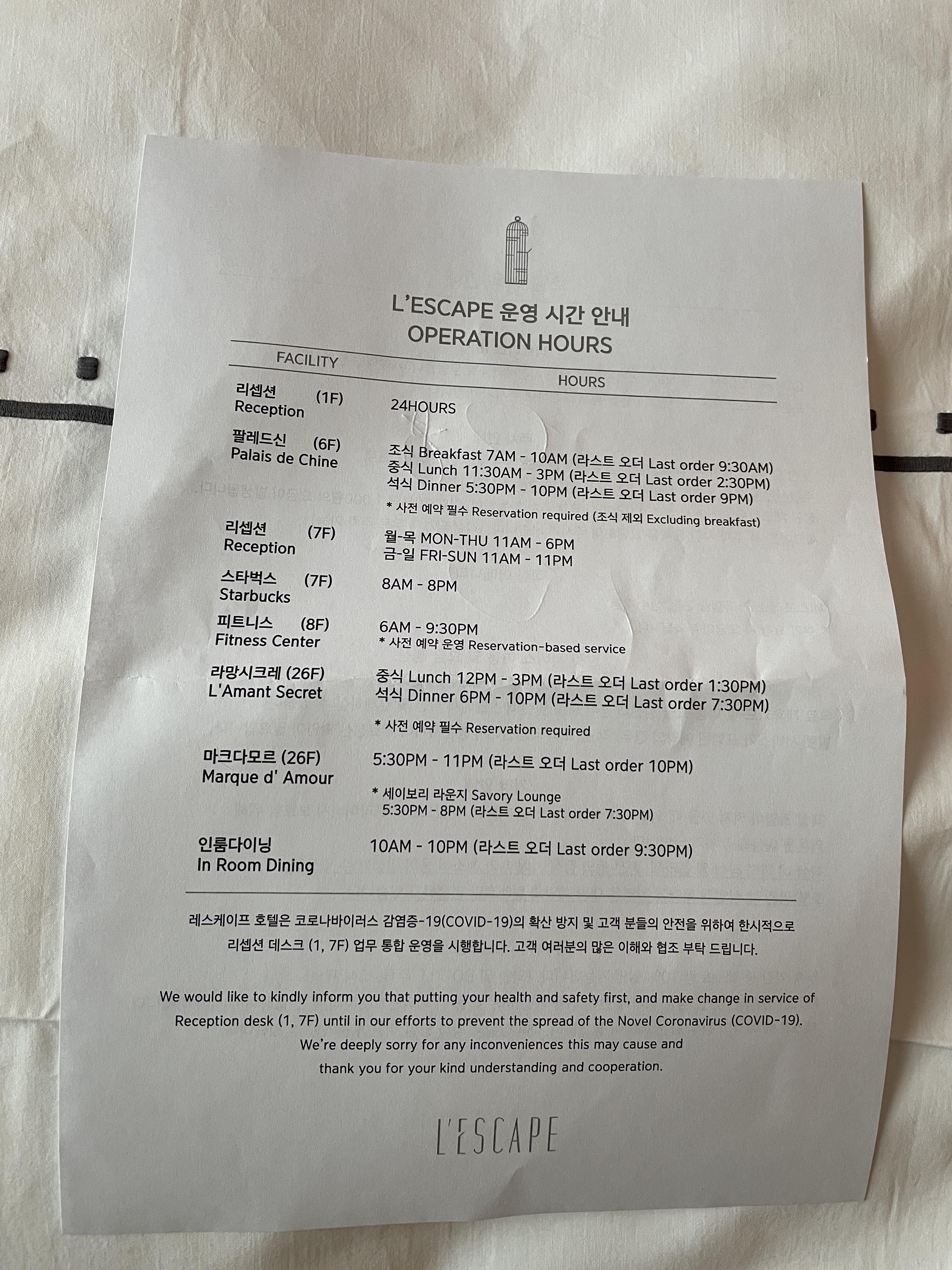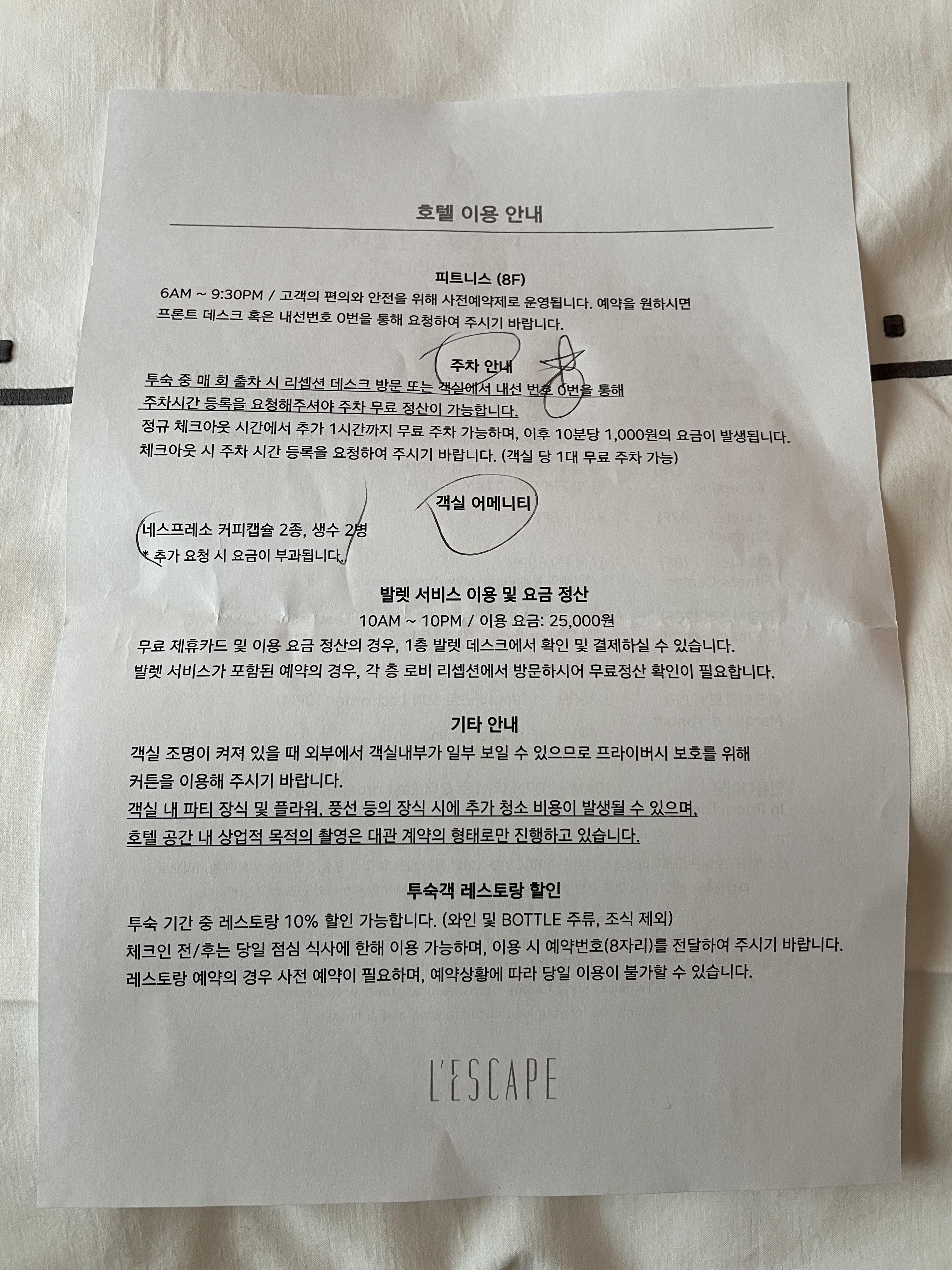 혹시 몰라 찍어둔 호텔 안내서입니다. 체크아웃은 11시이지만 요청할 경우 주차는 12시까지 무료로 가능해요. 체크아웃 후에 스타벅스 리저브 매장을 이용하실 분들은 참고하세요! 저희는 7층에 리저브 매장에서 음료 마시면서 11시에 맞춰서 7층 리셉션에서 체크아웃을 했는데 체크아웃 5초 만에 가능하니 이용하시기 바랍니다 : )