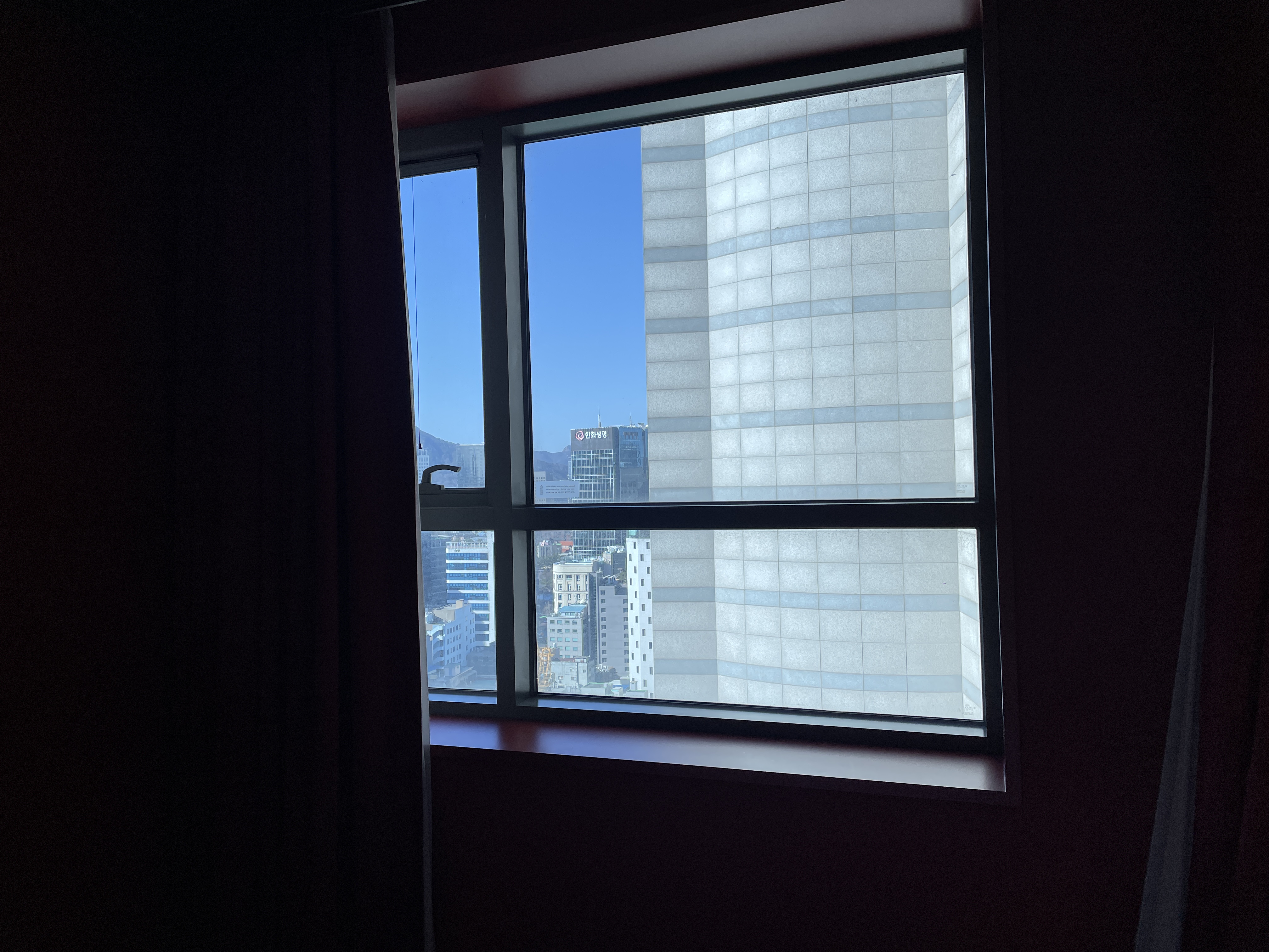 레스케이프 호텔의 단점은 뷰가 정말 안 좋다는 것입니다. 어딜 봐도 다 벽에 막혀 있고 그나마 옆으로 좀 돌려보아야 건물벽 막히지 않고 멀리 있는 건물이 보여요. 뷰를 1순위로 생각하는 분들이라면 레스케이프 호텔은 피하시는 게 좋겠습니다.