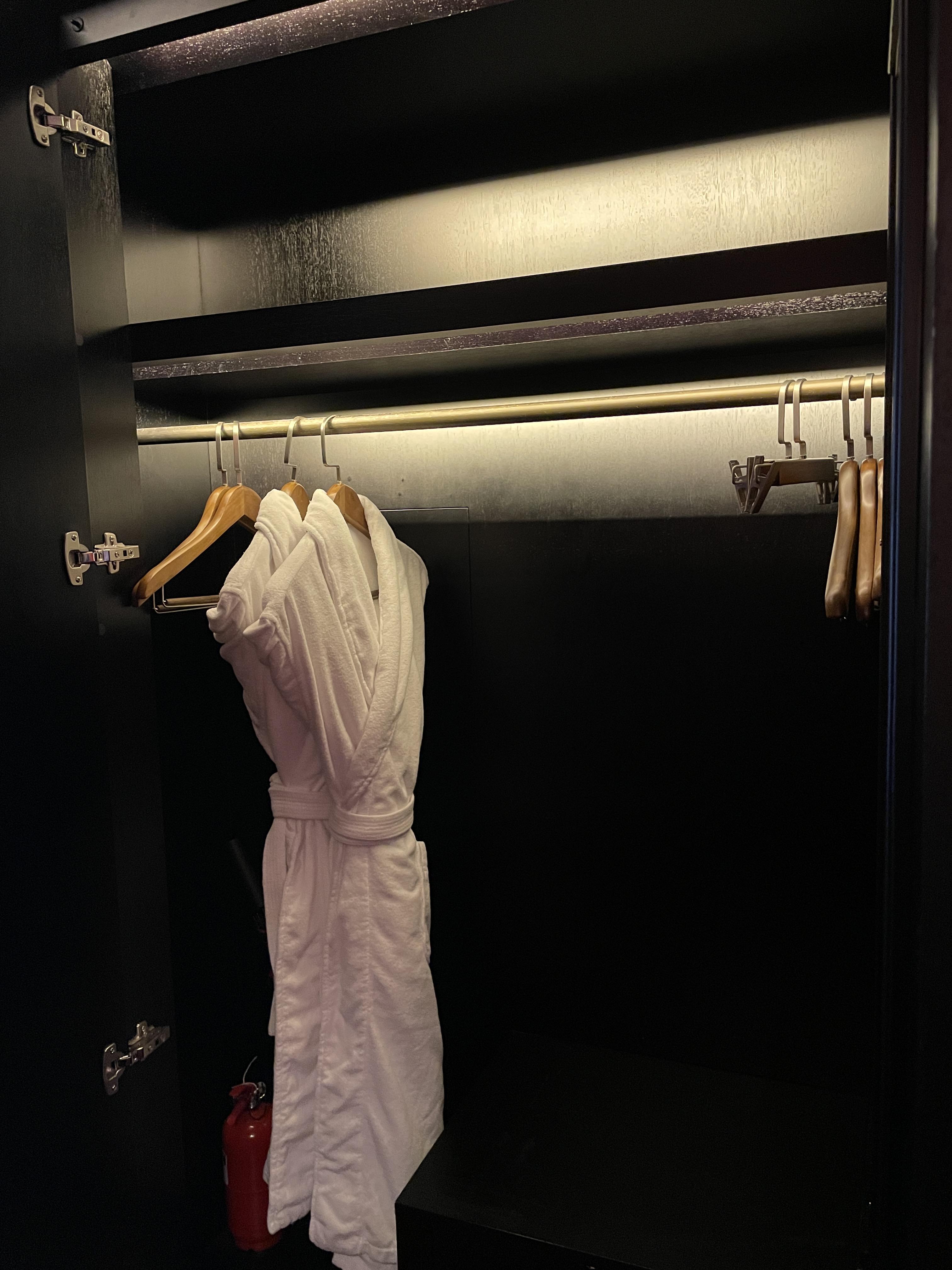 호텔 객실 문을 열고 들어오면 중문이 있다고 말씀드렸는데 중문을 열고 들어가기 전에 옷장이 있어요. 옷장 안에는 샤워가운과 슬리퍼, 금고가 준비되어 있습니다. 옷장 맞은편에는 왼쪽처럼 우아한 유럽 여성의 초상화가 걸려있습니다.