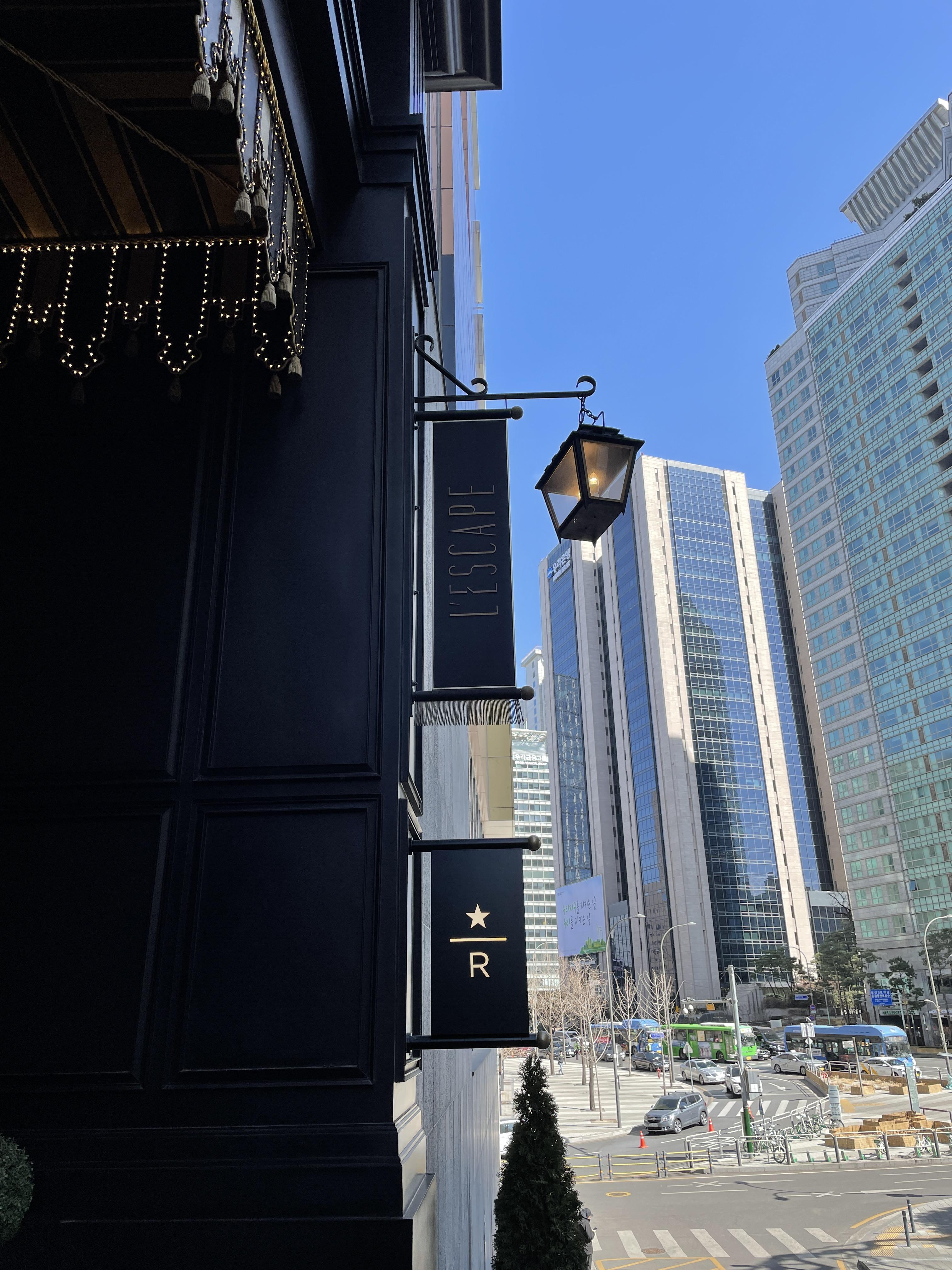 레스케이프 호텔 도착! 레스케이프 호텔 7층에는 스타벅스 리저브 매장이 있어서 리저브 간판도 함께 붙어있어요. 호텔 입구가 회현역 바로 앞이긴 한데 약간 언덕배기에 위치해 있어서 조금 어색했어요.