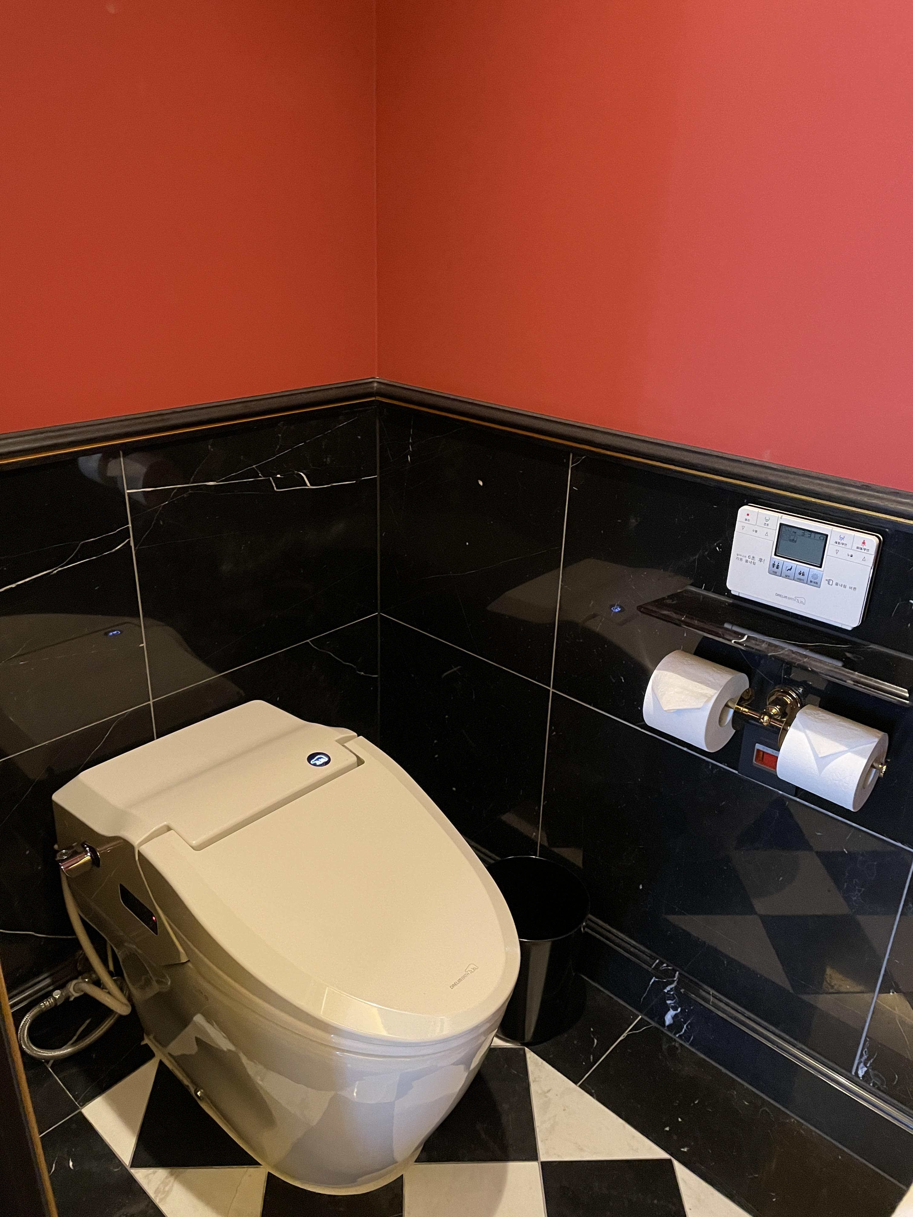 화장실과 샤워부스는 따로 분리가 되어 있고 변기에는 비데가 설치되어 있어 편리하게 사용하실 수 있습니다. 샤워부스 안에 들어가면 벽에 샴푸, 트리트먼트, 샤워젤, 바디로션이 붙어 있어요. 샤워부스의 물 온도 조절도 미세하게 해야 해서 조금 귀찮았지만 1박만 사용하는 것이니 괜찮았습니다.
