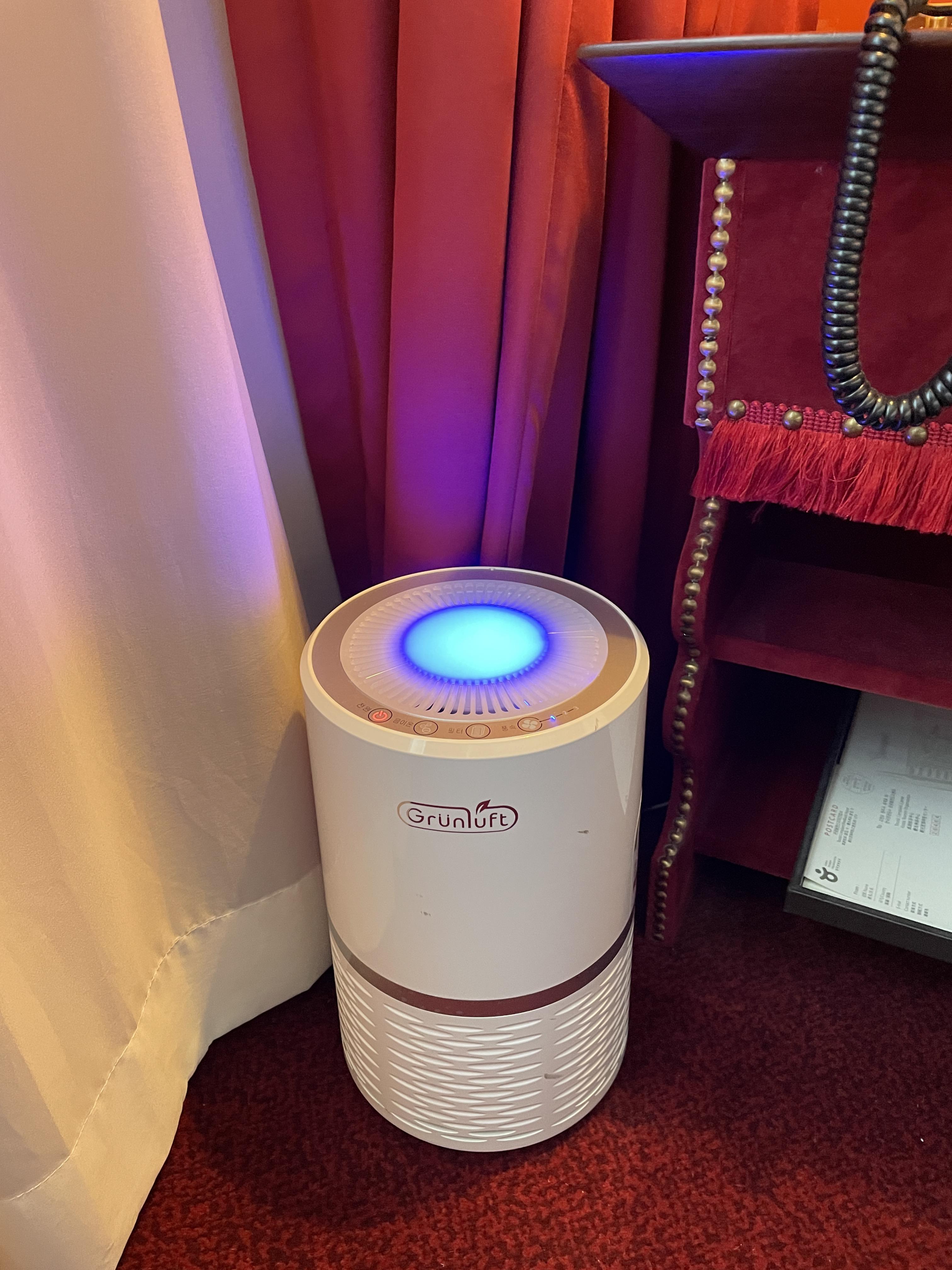 그리고 공기청정기도 준비되어 있는데 아무래도 객실 자체가 다 패브릭으로 되어 있다 보니 공기청정기는 필수인 것 같습니다. 밤새 켜놔도 시끄럽지 않으니 켜도 주무셔도 될 것 같아요!