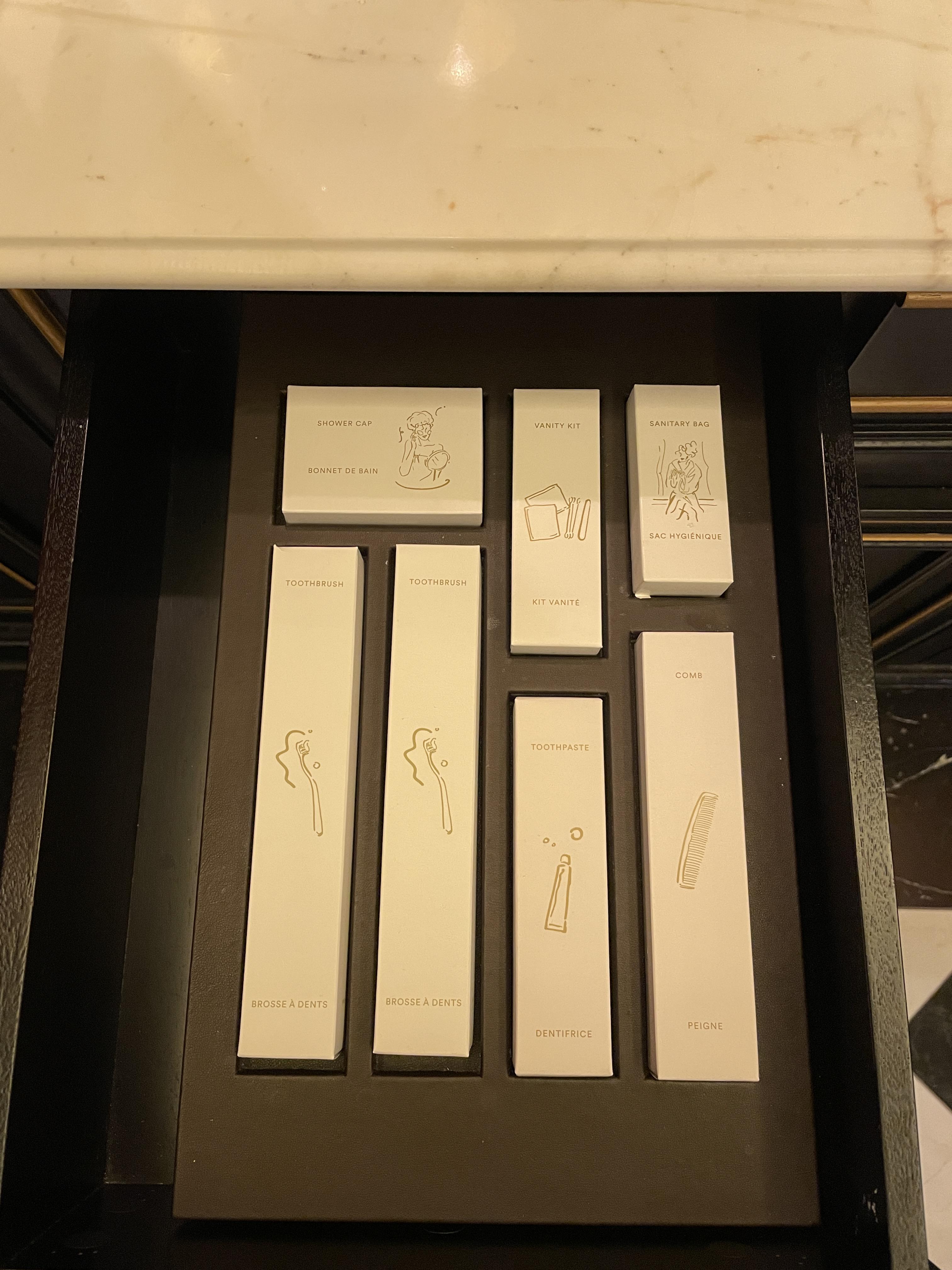 세면대 왼쪽 서랍을 열어보면 칫솔, 치약, 빗, 샤워캡, 위생봉투, 면봉, 화장솜 등의 객실 용품이 준비되어 있는데 치약이 무려 마비스 치약! 이탈리아 여행 갈 때 사 오던 마비스 치약을 여기서 만나서 반가웠습니다. 세면대 오른쪽 서랍에는 보시는 바와 같이 헤어드라이어가 준비되어 있습니다.