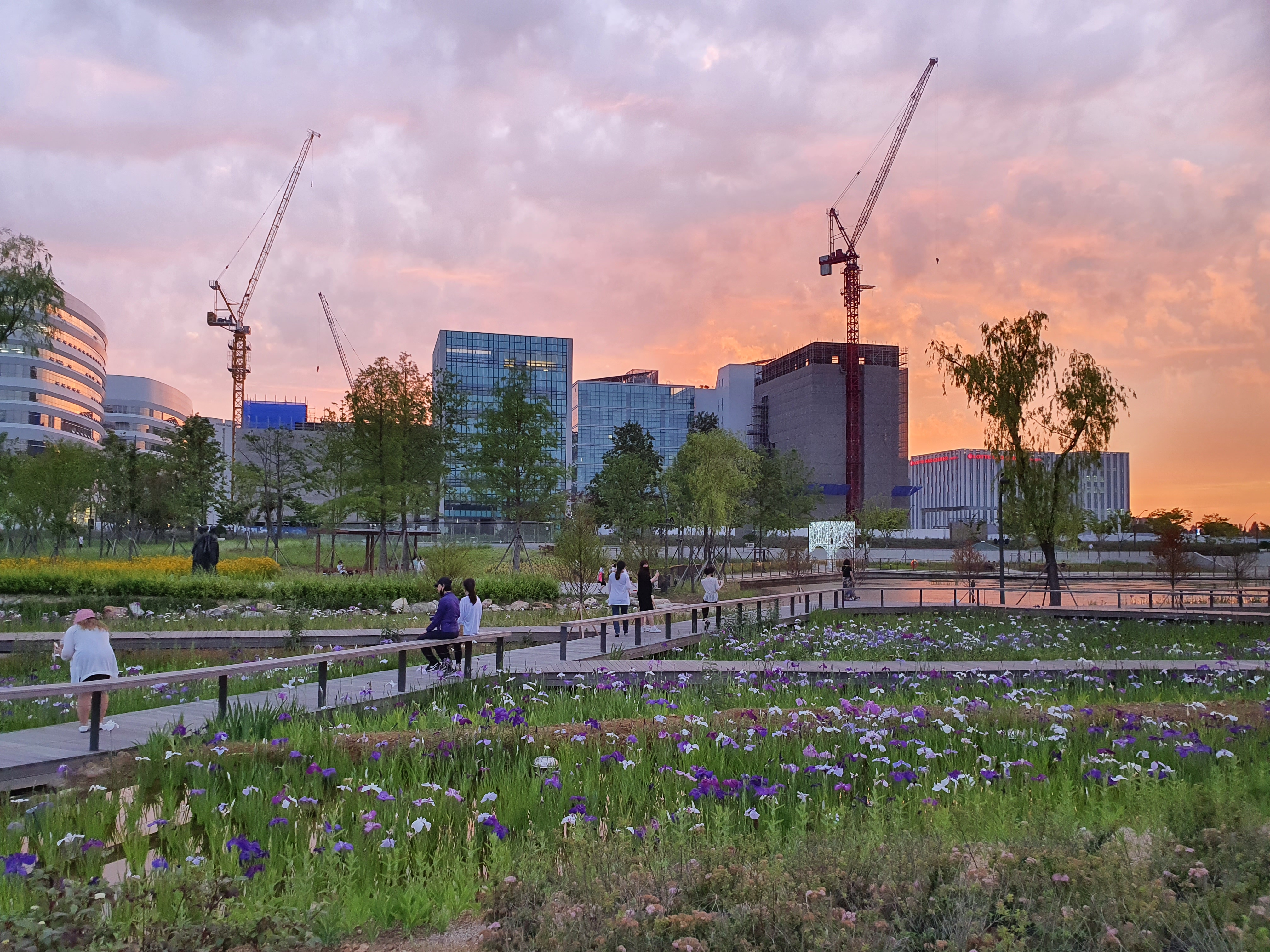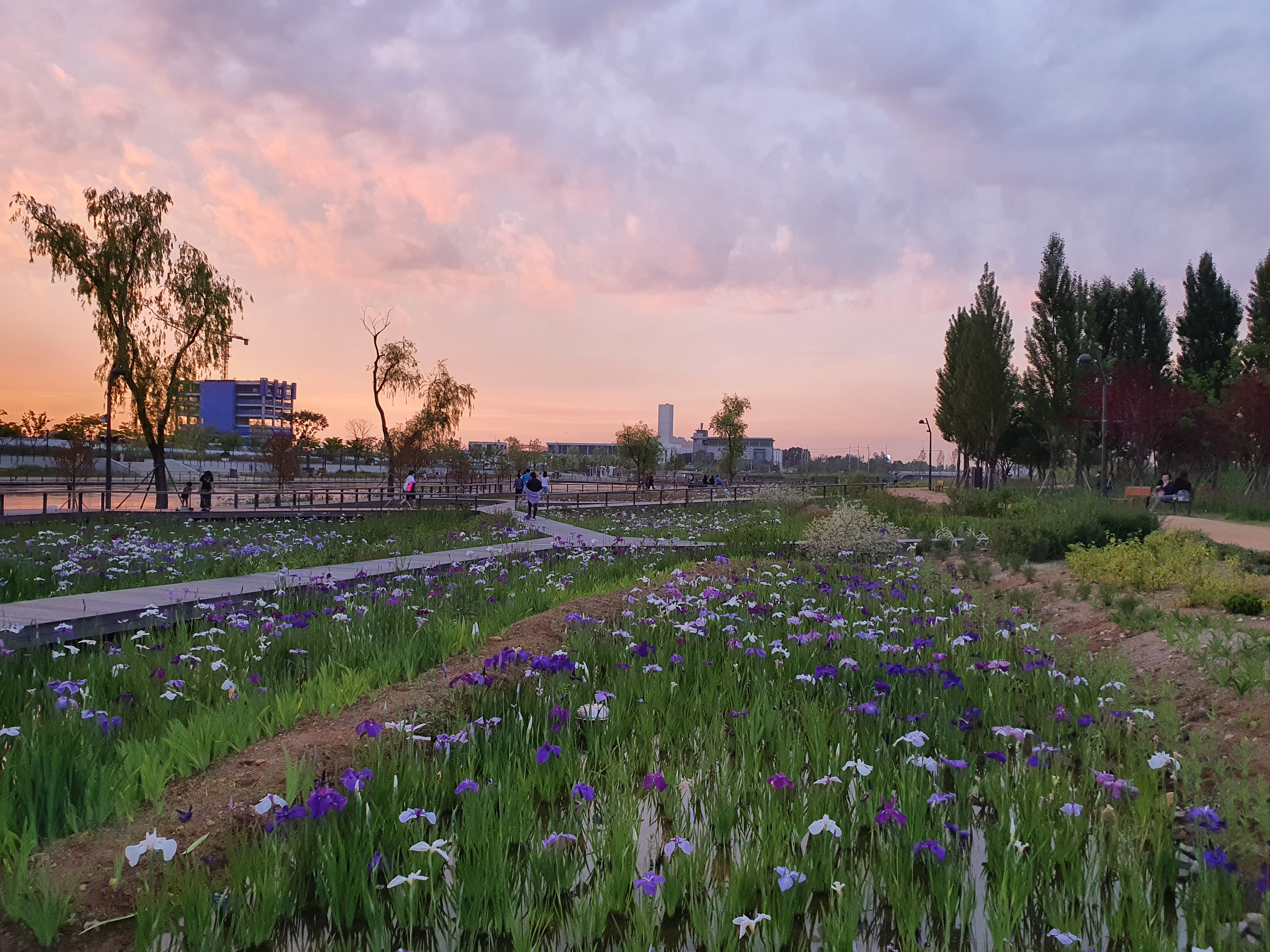 지난 5월에 왔을 때는 튤립이 만발해 있었는데, 이번에는 붓꽃이 너무 예쁘게 펴 있었어요. 붓꽃은 처음 봤는데 하늘하늘한게 정말 예쁘더라구요. 붓꽃을 두고 가운데로 길이 나 있어서 산책하기 정말 좋아요. 여기 저기 사진찍는 사람들도 많구요!