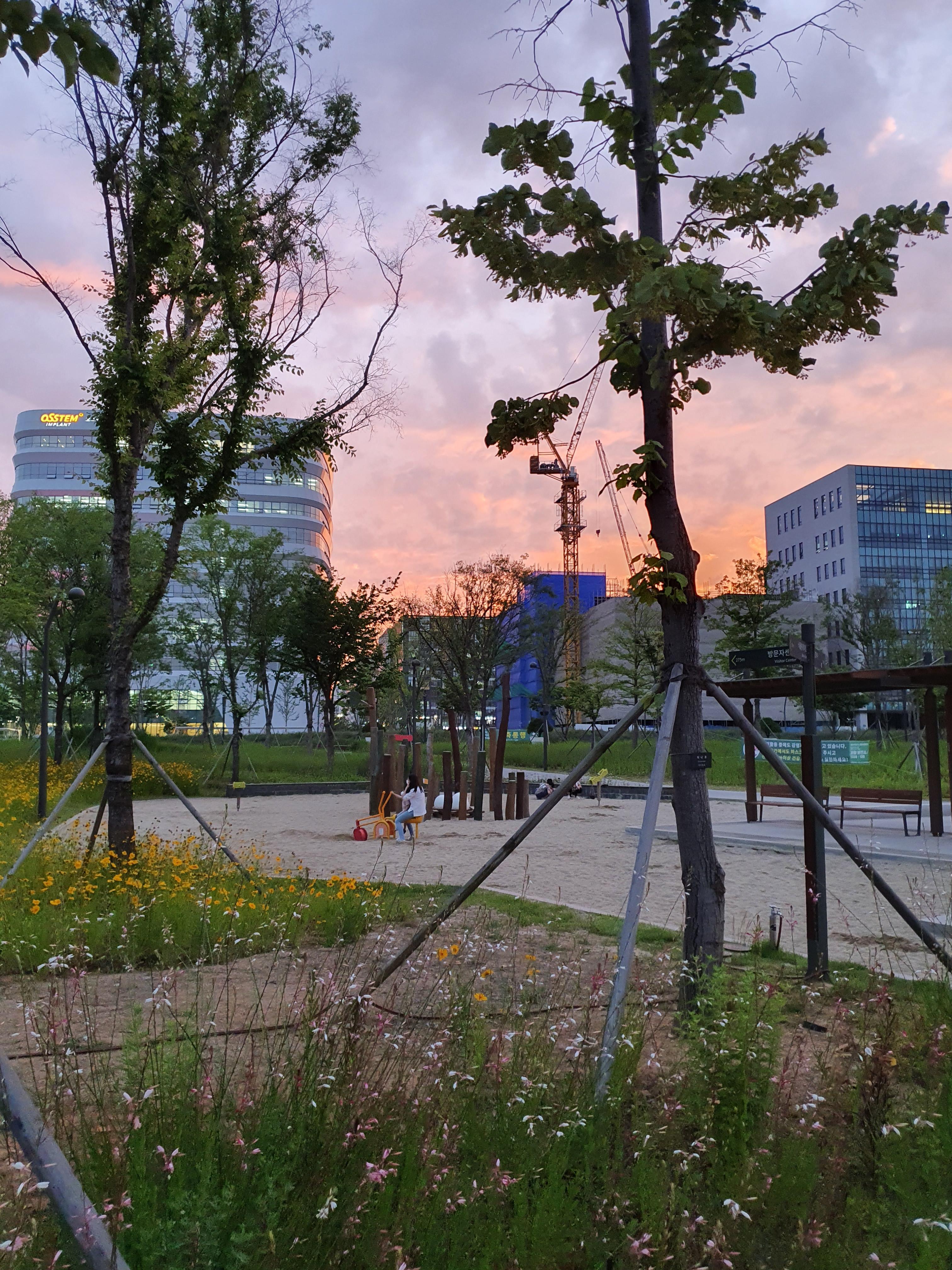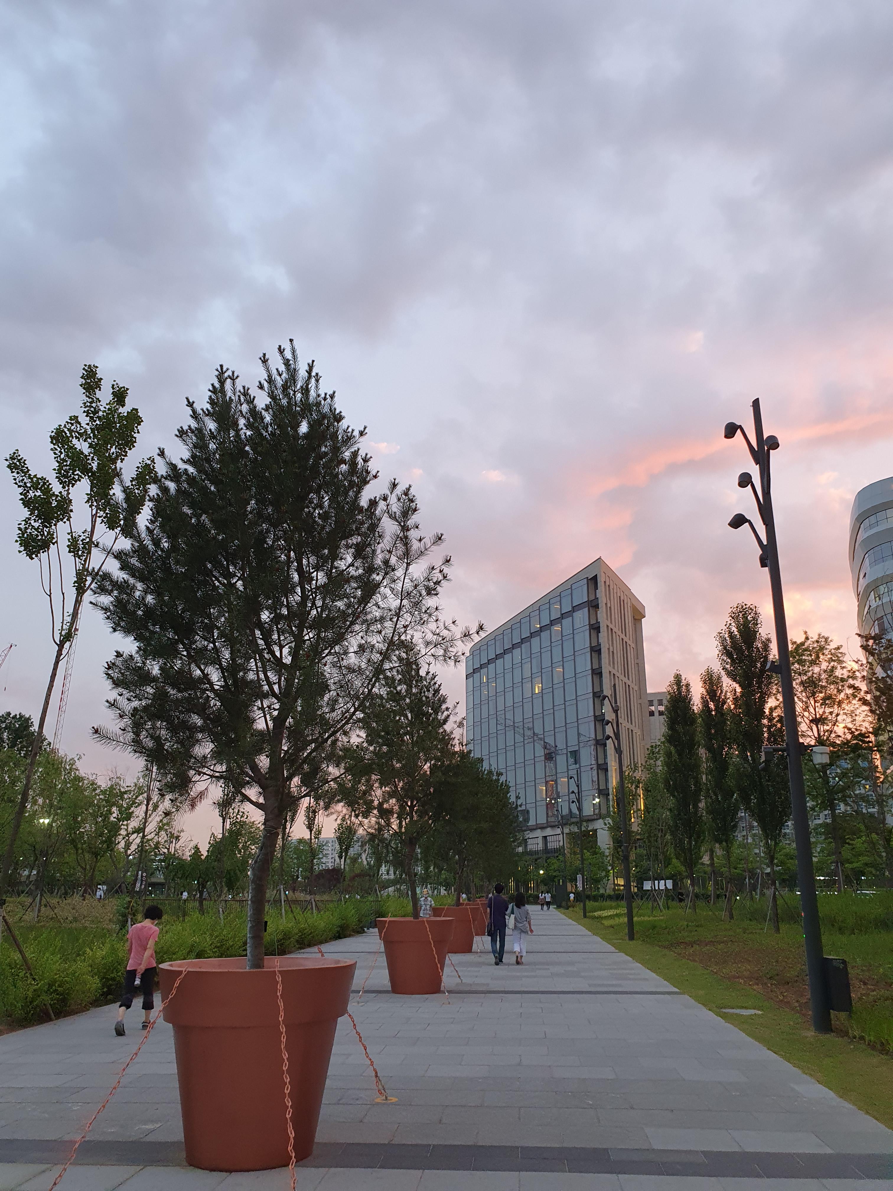 커다란 화분에 나무가 심어져 있어서 신기했어요. 이렇게 큰 화분이 있다니! 하늘을 보니 핑크빛 노을이 하늘을 물들이고 있었네요. 하늘색깔 너무 예쁘죠? 저기 보이는 건물은 전에 포스팅했던 코트야드 메리어트 보타닉 파크인데요, 다시봐도 위치가 끝내줍니다!