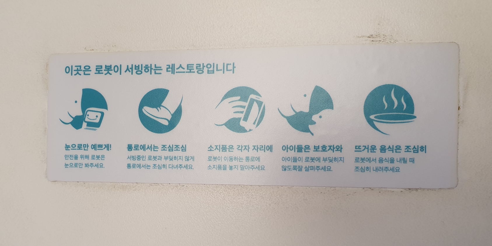 테이블마다 이런 안내문이 붙어있으니까 한 번씩 읽어봐주세요. 로봇은 크게 두 종류에요. 테이블 옆에 레일을 따라 움직이는 로봇과 홀 전체를 돌아다니면서 서빙하는 로봇! 로봇이 서빙을 해준다니 신기하네요. 다른 테이블로 서빙하는 로봇들을 구경하다보니 드디어 우리가 주문한 음식도 나왔어요!