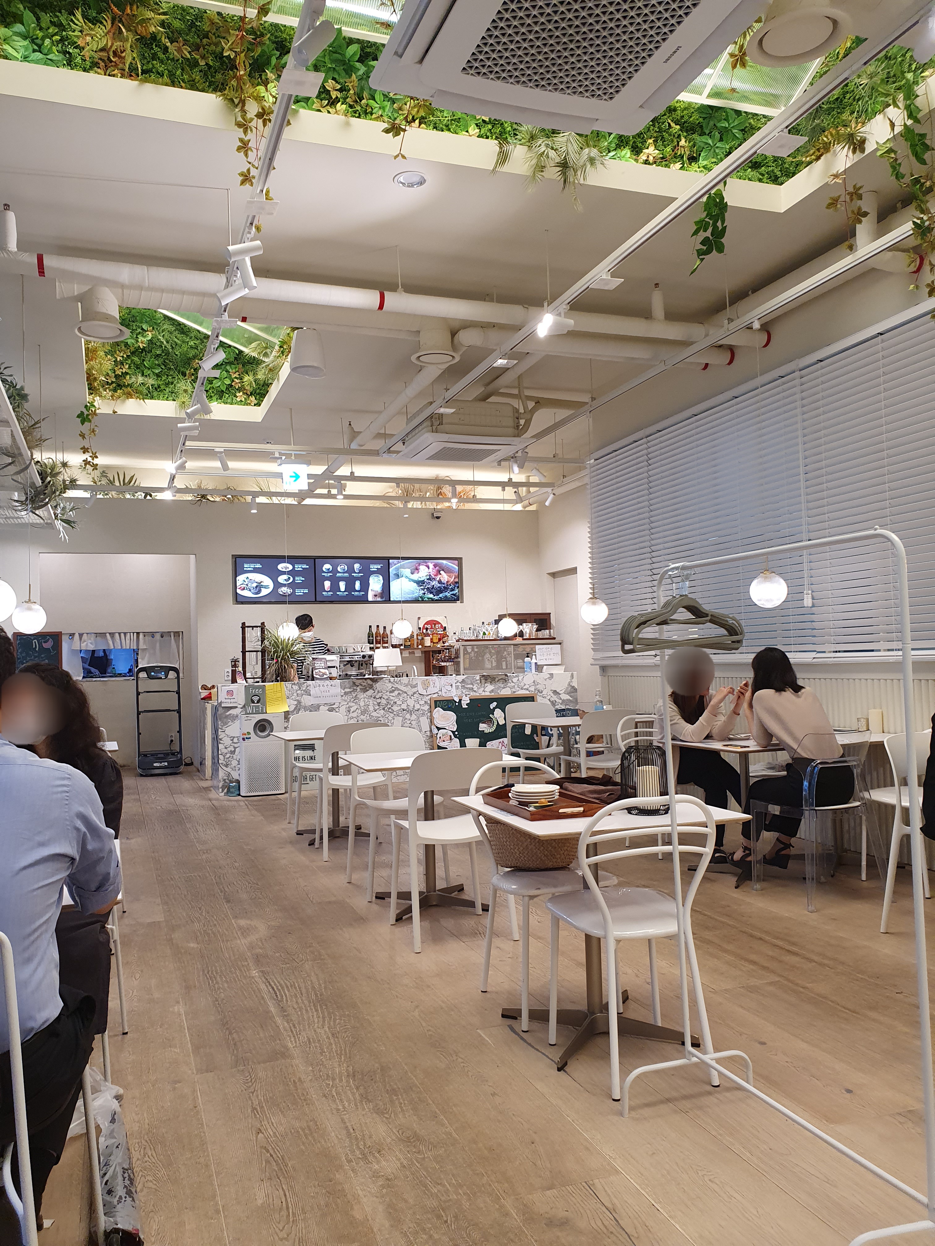본격적으로 내부를 살펴볼게요. 내부 분위기는 뭔가 자연친화적인 느낌이 물씬! 그러면서도 화이트계통의 가구와 조명으로 깨끗한 느낌을 줍니다. 천장에도 식물들이 있어서 신기했어요.