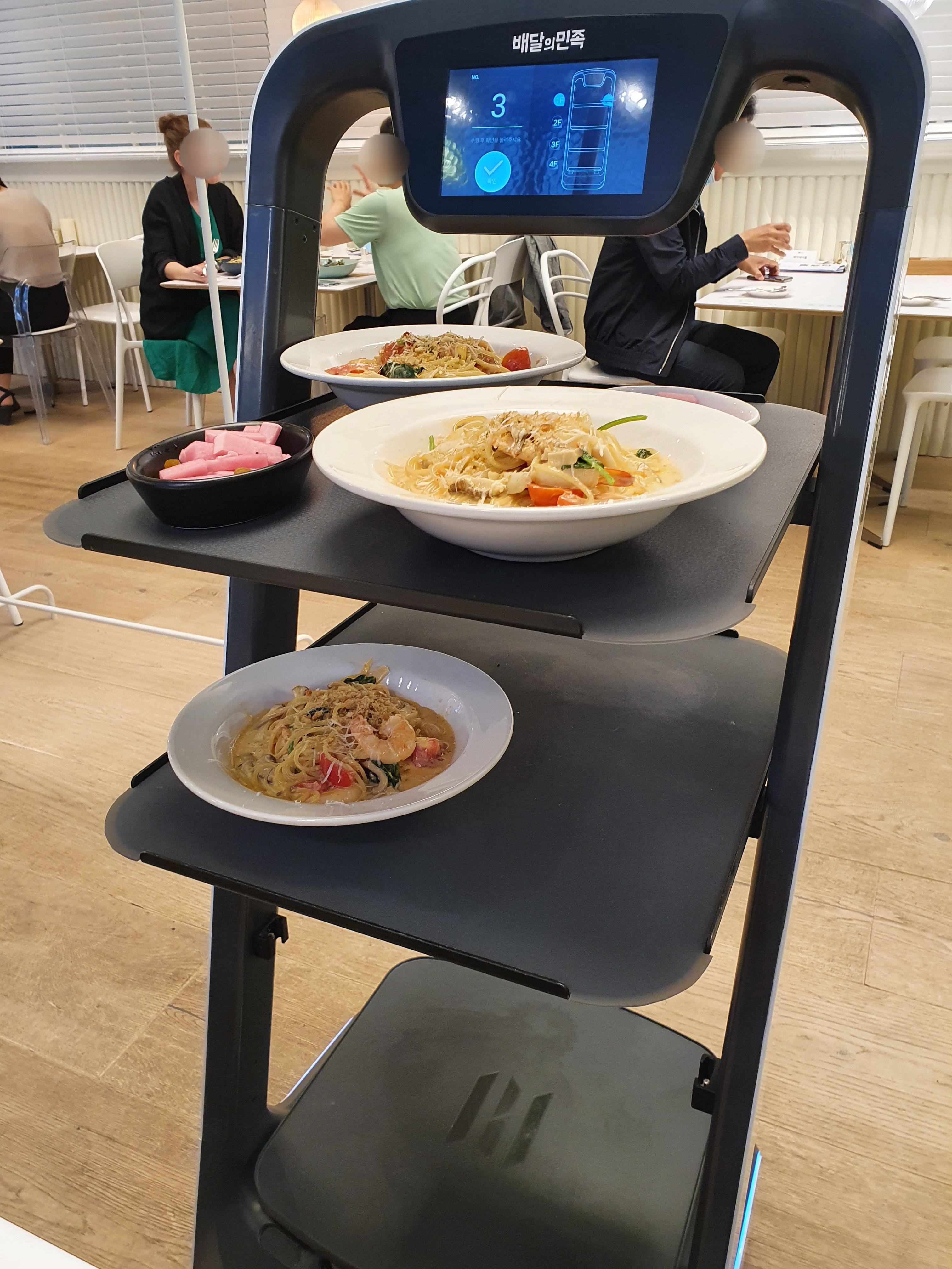 이 식당의 특이한 점은 로봇이 서빙해준다는 점이에요. 배달의 민족이랑 협력해서 이런 시스템을 구축했나봐요.