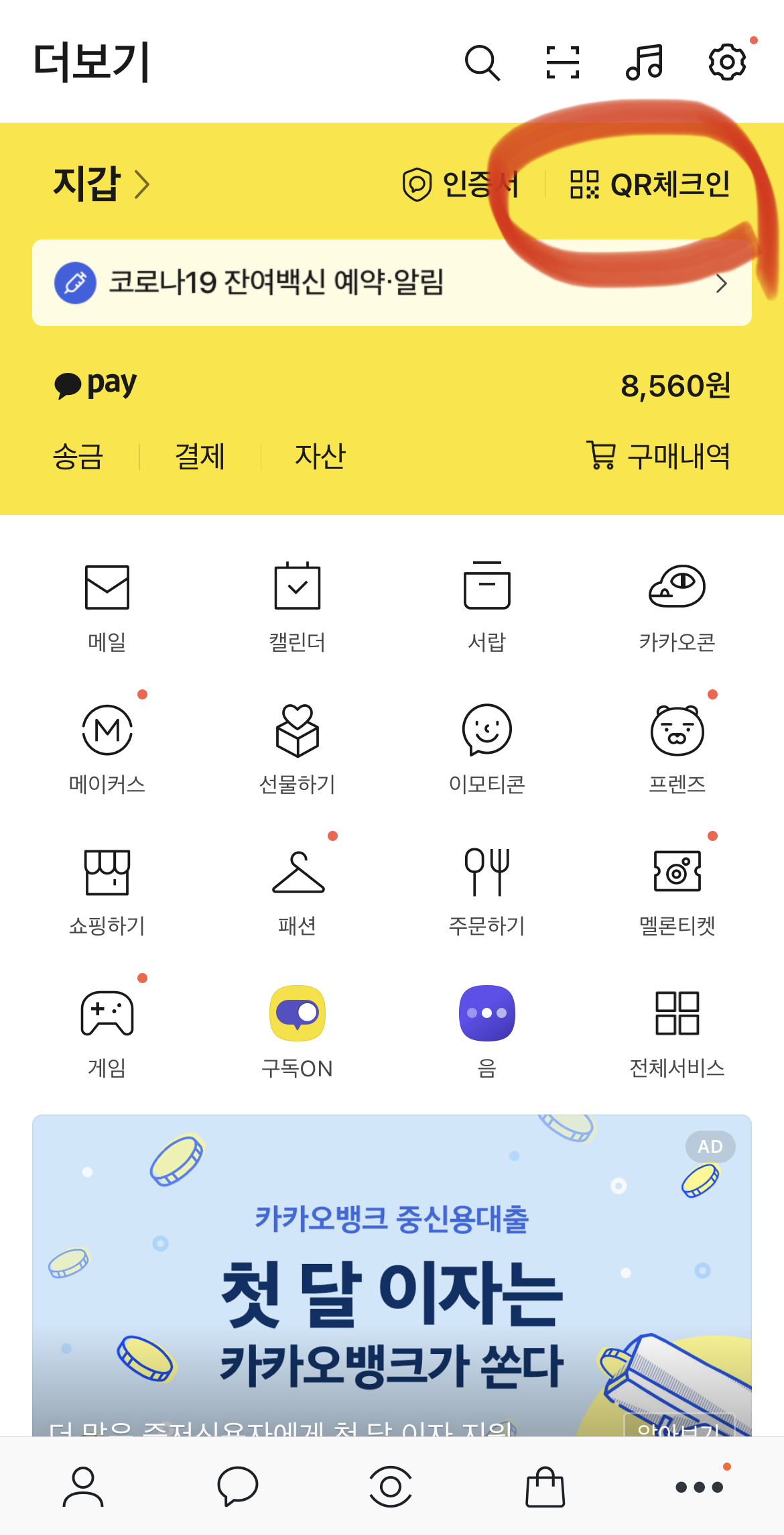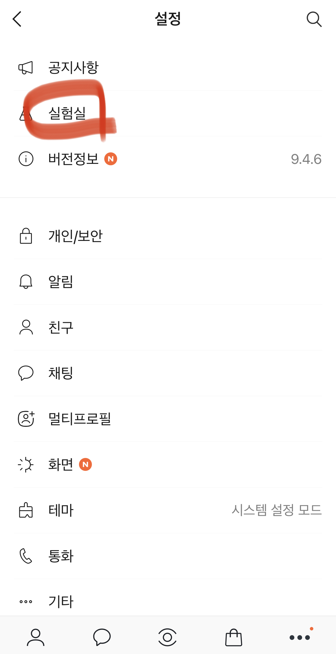 저는 카카오톡을 가장 많이 사용하기 때문에 카카오톡 QR코드를 이용하는데요, 카카오톡에서 QR체크인으로 들어간 뒤 인증을 해주시면 됩니다. 카카오톡은 흔들면 바로 QR코드가 화면에 나올 수 있도록 하는 기능을 제공하고 있는데 그 기능이 궁금하시다면 이렇게 따라해주시면 됩니다. 먼저 설정에서 실험실로 들어가주세요.