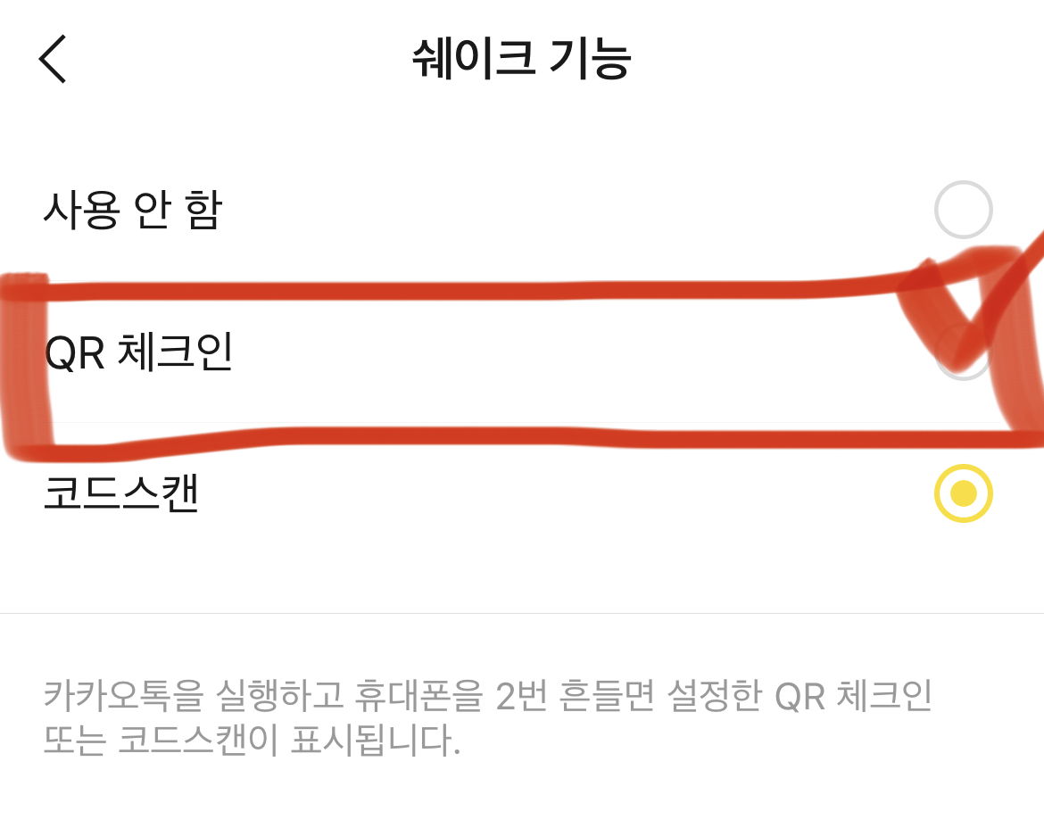 실험실을 클릭하면 쉐이크 기능이 있는데 쉐이크 기능을 누르고 거기서 QR 체크인을 선택하시면 끝이에요! 이렇게 설정해두면 카카오톡만 켠 상태로 휴대폰을 흔들었을 때 QR코드나 나타나게 됩니다. 참 편리하죠?