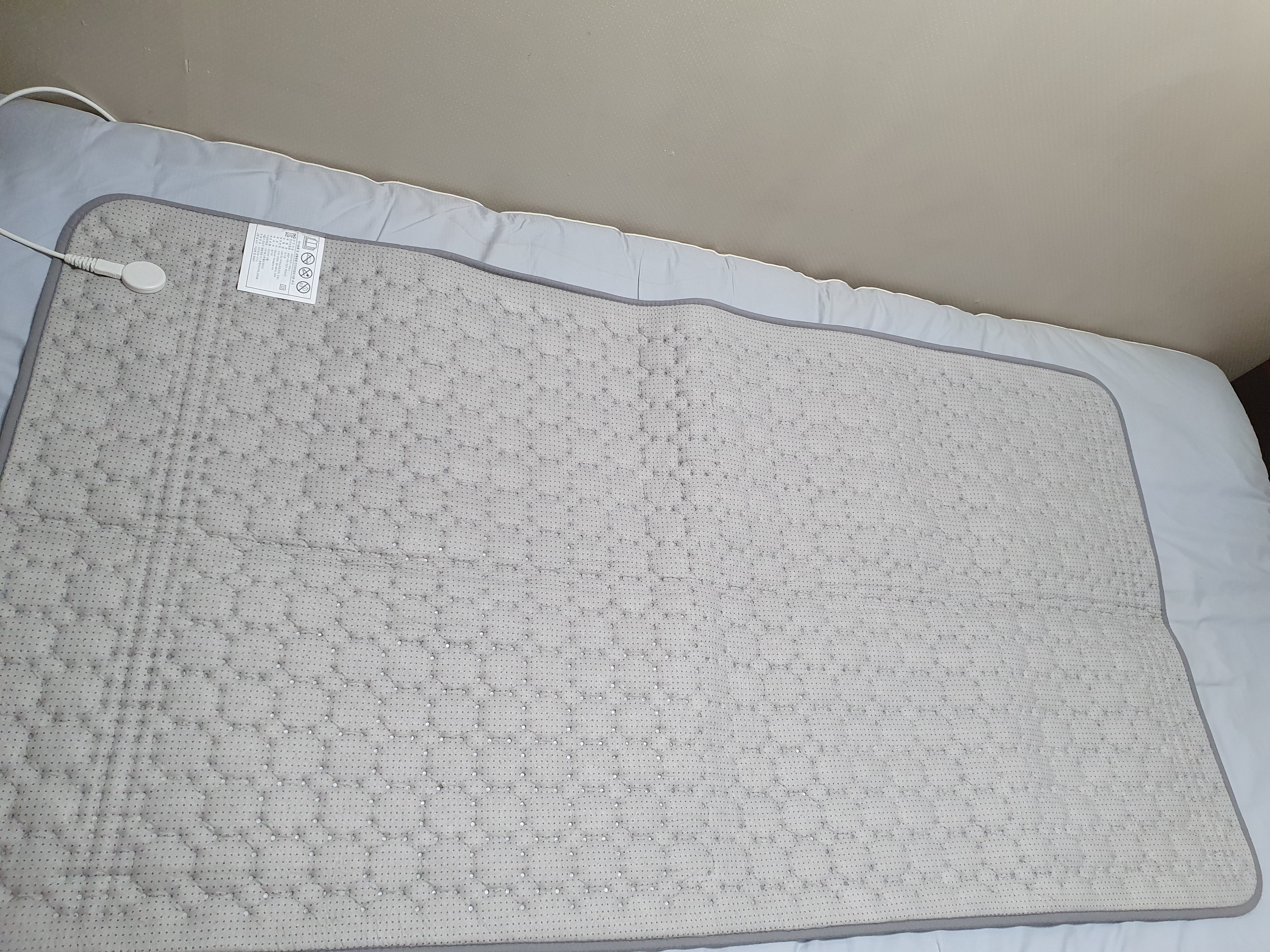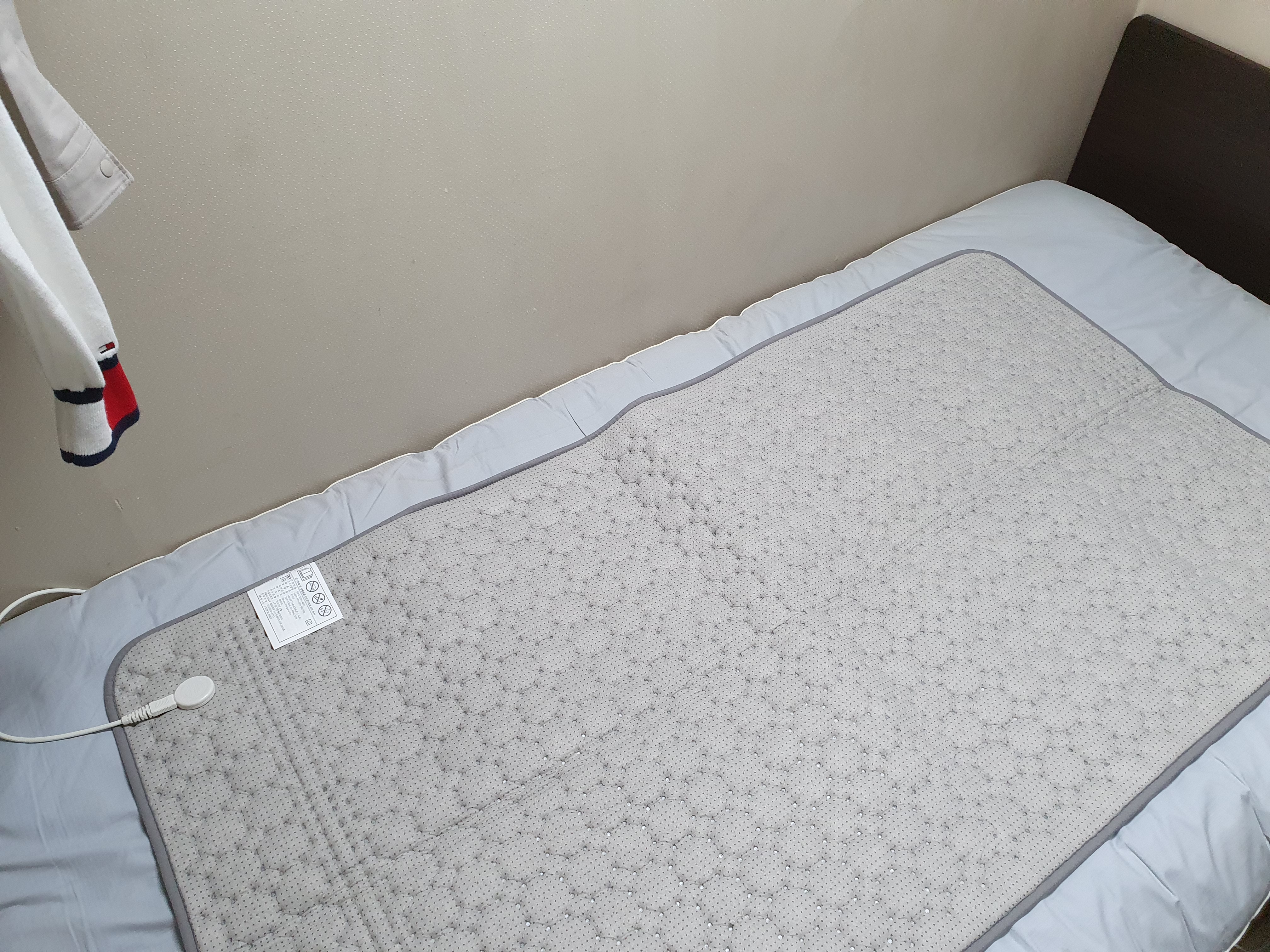 싱글침대에 깔면 이런 모습이에요. 아직 사용한지 몇일 안됐지만 따뜻하게 꿀잠자고 있어요. 저는 전기요가 자꾸 밀려서 위에 얇은 이불하나를 더 깔았어요. 그랬더니 안밀리고 좋더라구요!