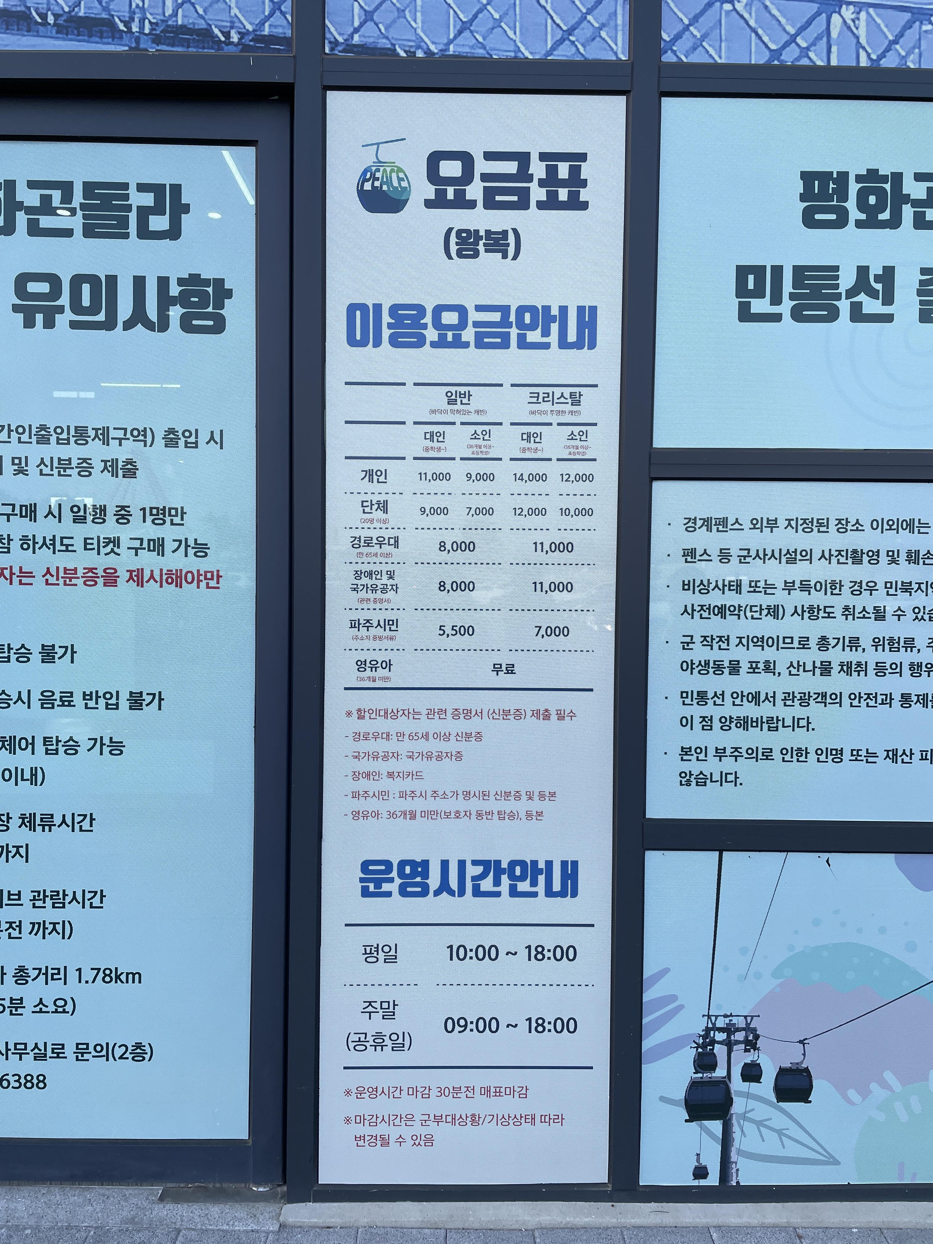 가격은 그래도 저렴한 편입니다. 일반 곤돌라는 성인 기준 11,000원, 소인은 9,000원이구요, 아래가 투명한 크리스탈 곤돌라는 성인의 경우 14,000원, 소인 12,000원입니다. 파주시민과 만 65세 이상일 경우 신분증을 제시하면 할인을 받으실 수있으니 참고하세요. 평화곤돌라를 타고 북쪽 탑승장으로 건너가면 DMZ를 조금 더 가까이 보실 수 있어요.