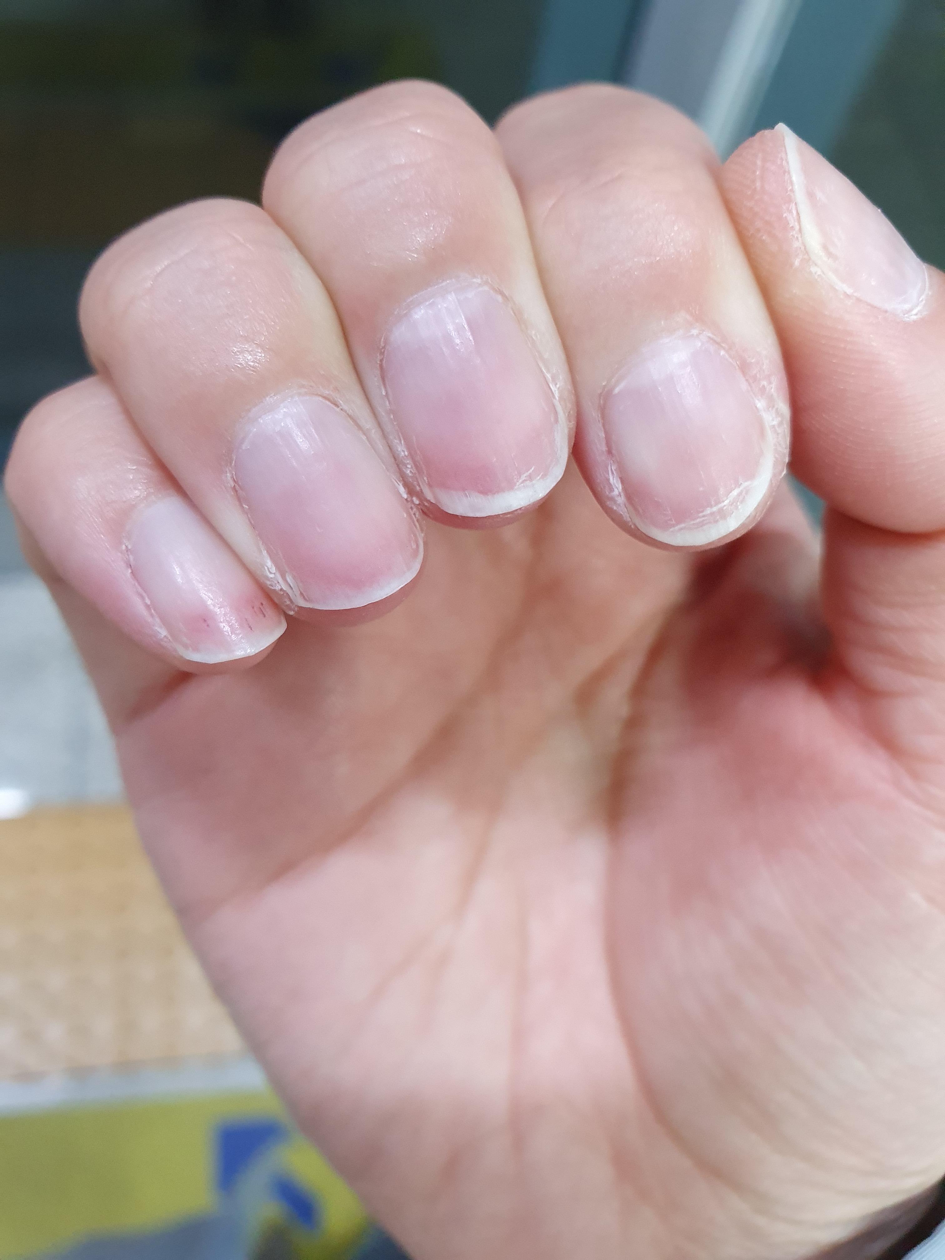 요게 현재 제 손톱상태인데 지금은 일주일 간 관리해주고 조금 나아진 상태입니다. 깨진것도 아닌데 하얗게 금간 것처럼 보이기도 해요.