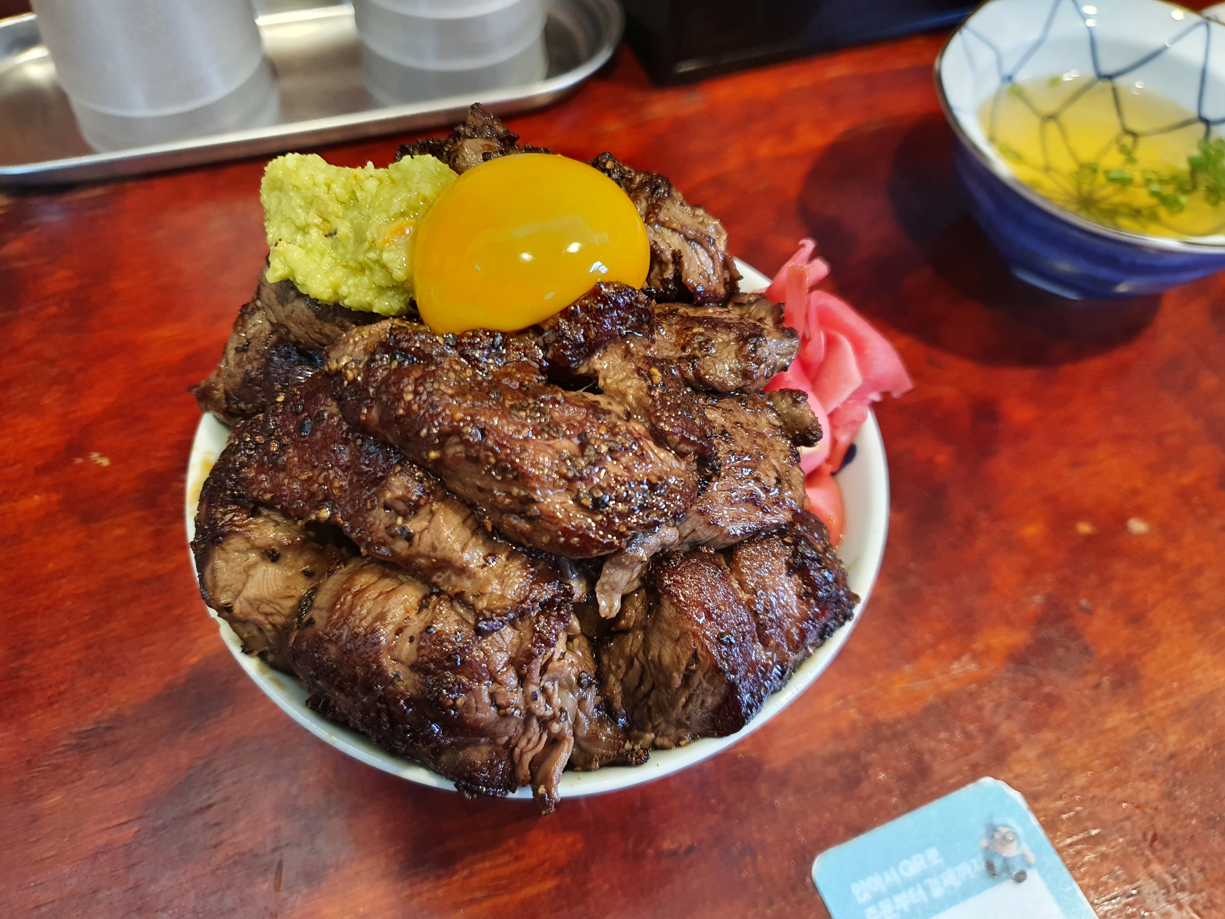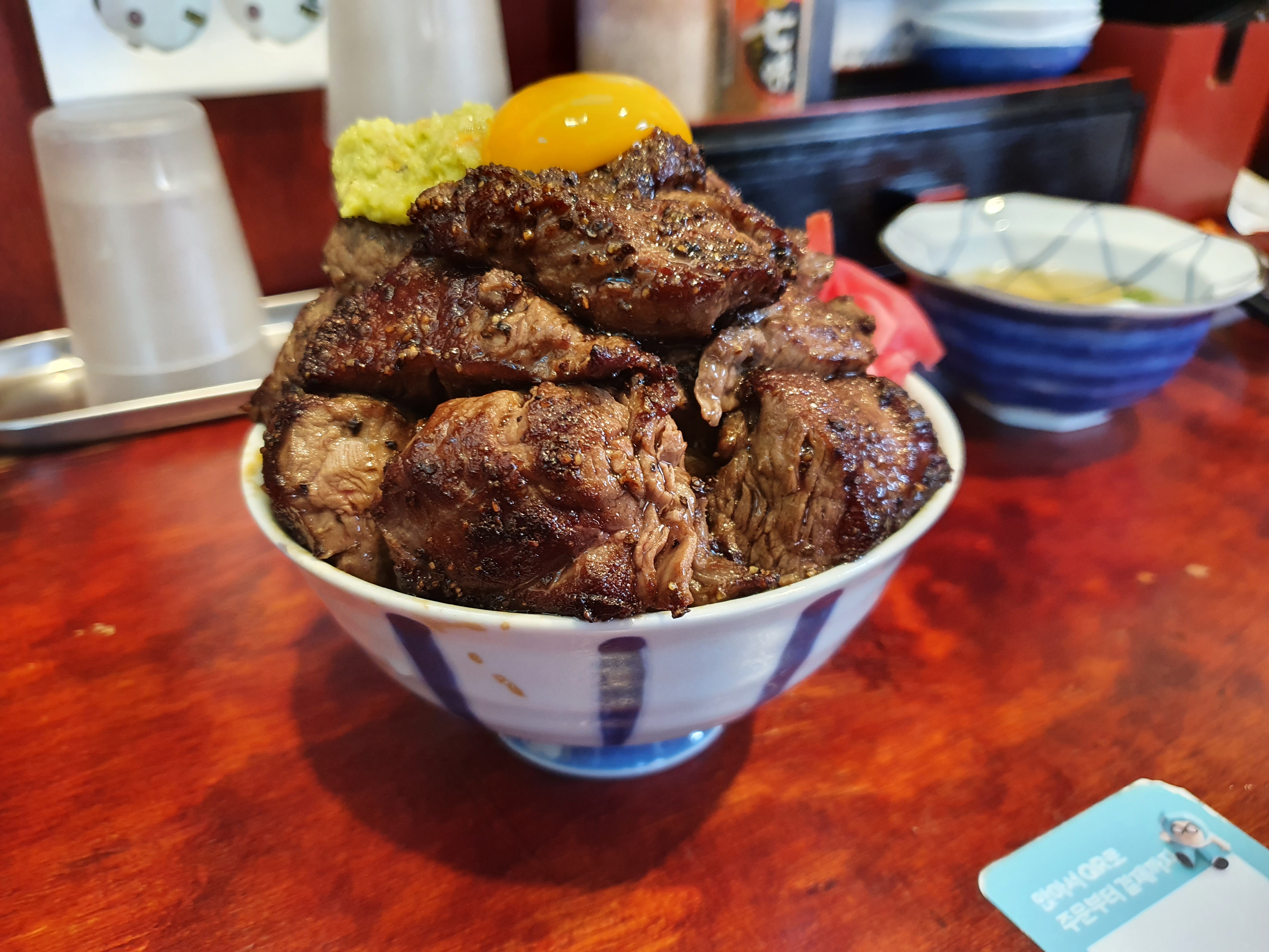 드디어 주문한 음식이 나왔어요! 먼저 나온 오리지널 스테키동입니다! 스테이크가 아주 넘칠듯이 들어있고 위에는 계란노른자가 통! 저는 계란 노른자를 터뜨려서 고기를 찍어먹었는데 굉장히 담백해요. 오리지널 스테키동의 고기는 육즙 가득하고 가끔 질긴 부위가 있구요, 고기를 굉장히 두껍게 썰어주셔서 씹는 맛이 있어요.