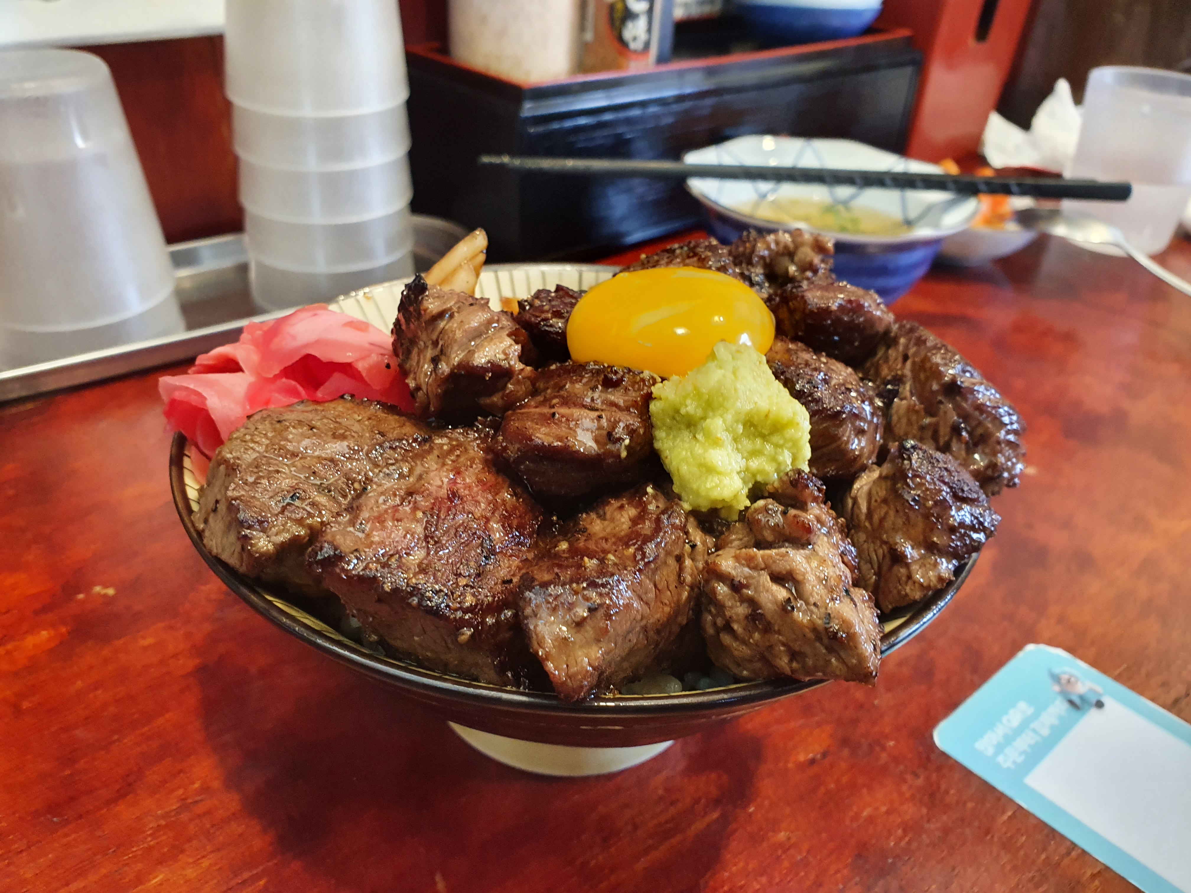 드디어 주문한 음식이 나왔어요! 먼저 나온 오리지널 스테키동입니다! 스테이크가 아주 넘칠듯이 들어있고 위에는 계란노른자가 통! 저는 계란 노른자를 터뜨려서 고기를 찍어먹었는데 굉장히 담백해요. 오리지널 스테키동의 고기는 육즙 가득하고 가끔 질긴 부위가 있구요, 고기를 굉장히 두껍게 썰어주셔서 씹는 맛이 있어요.