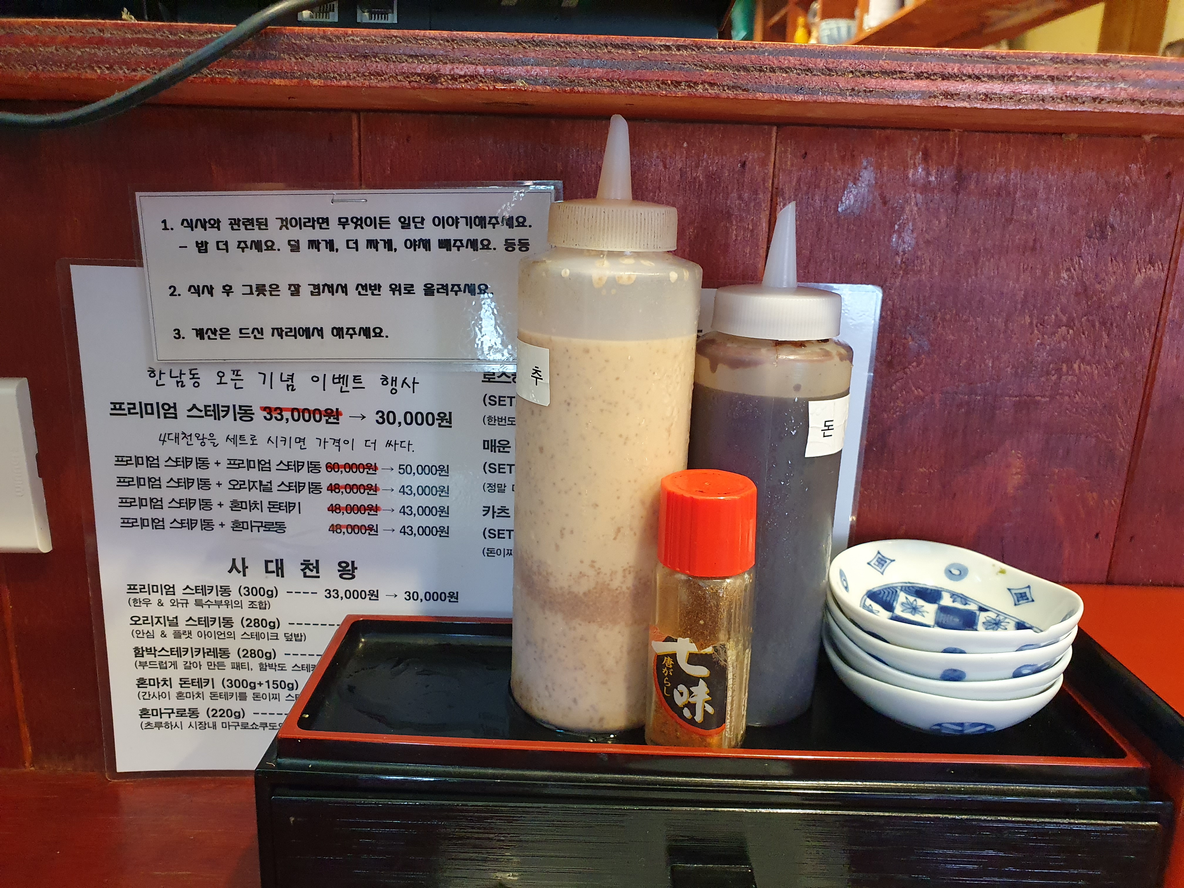워~ 장사가 잘돼서 한남동에도 오픈을 했나봐요. 오픈기념행사를 합니다. 저는 여기 처음 와봐서 오리지널 스테키동을 시키고 친구 두명도 같은 메뉴를 시켰는데 한정메뉴라 한팀에 한 개 밖에 못시킨다고 하더라구요.
