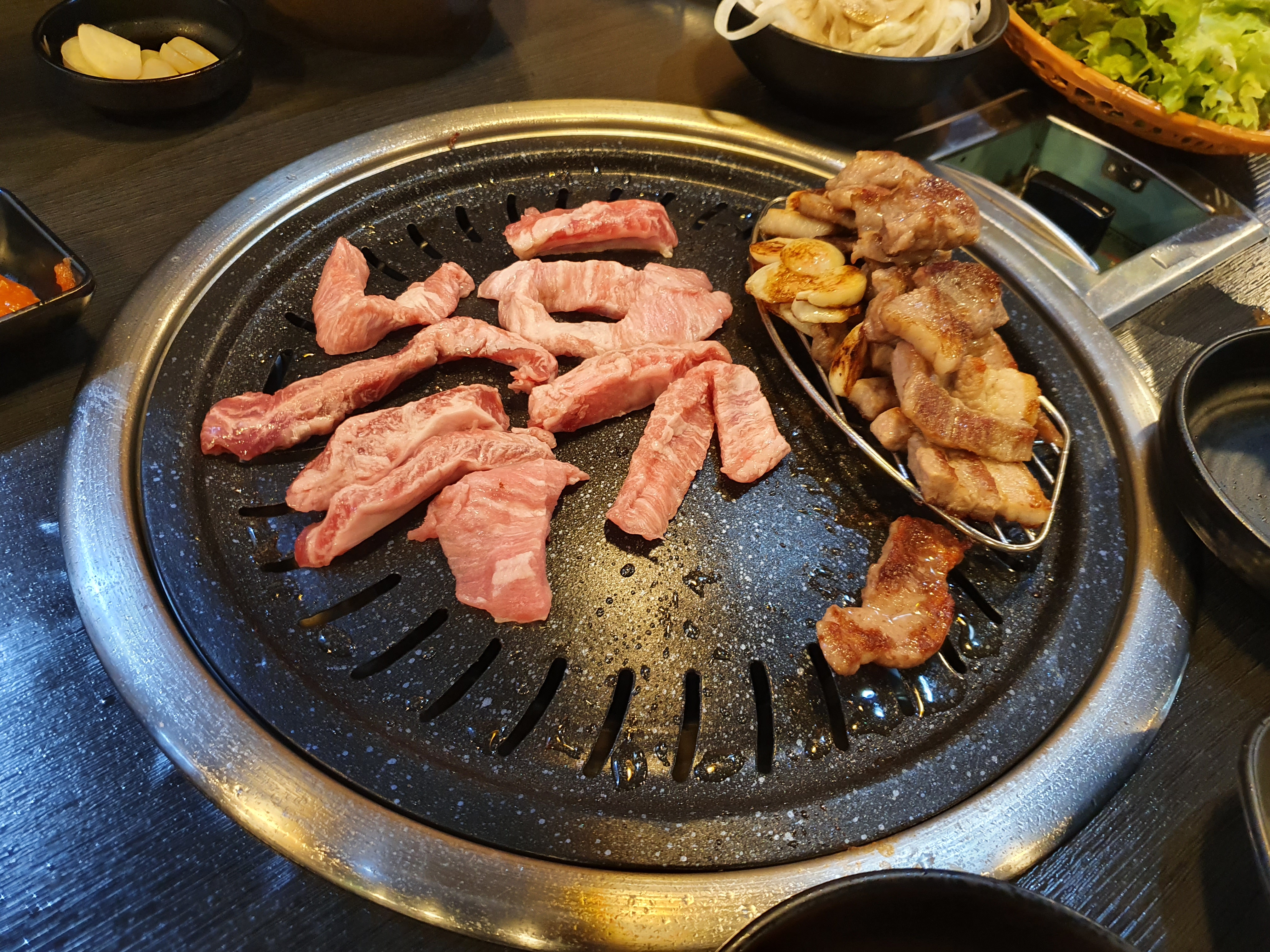 고기가 맛있게 구워졌습니다. 타지 않도록 트레이 위에 올려주고, 본격 먹방 돌입!