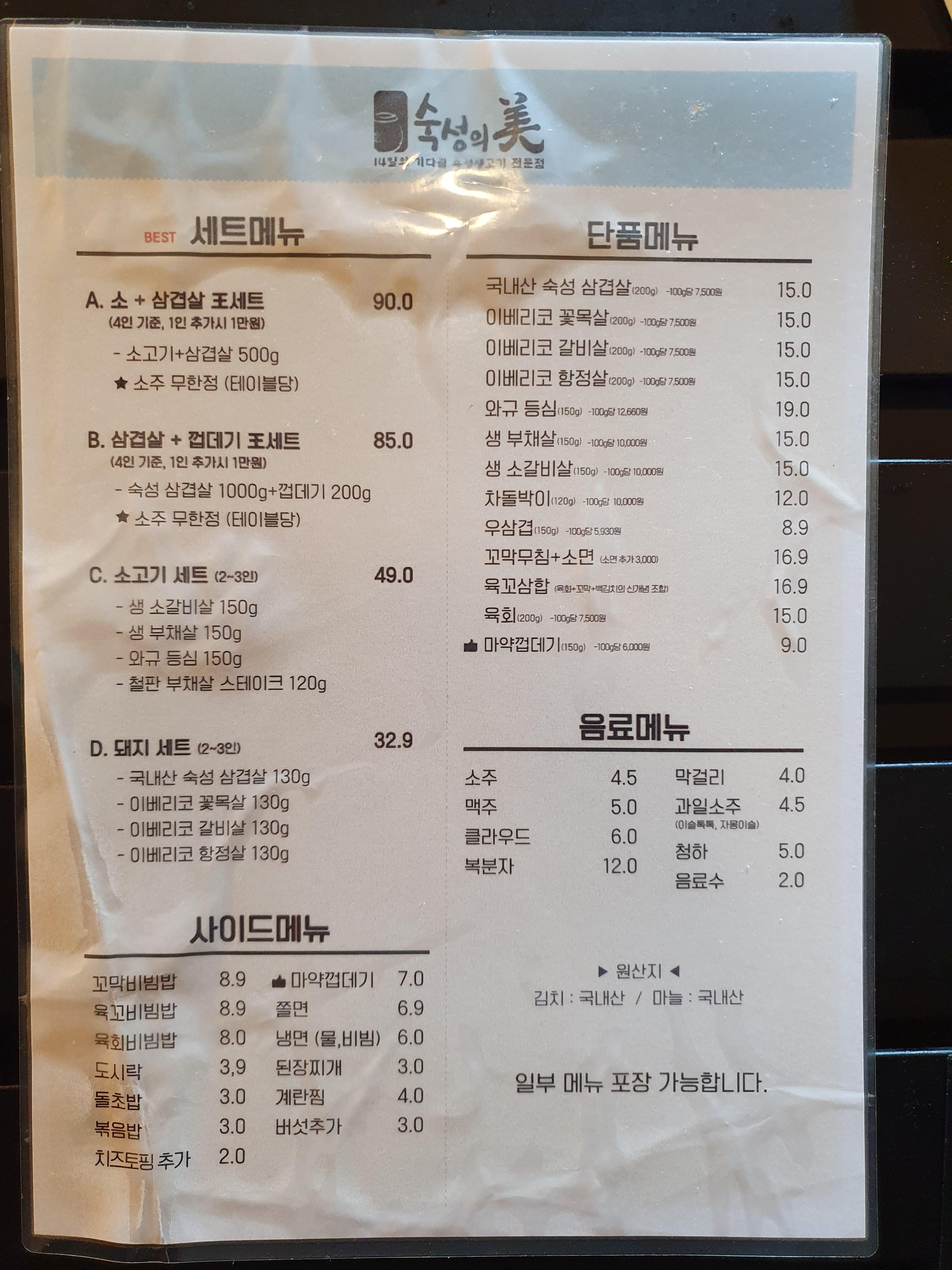 메뉴는 요렇게 있구요, 삼겹살 뿐만 아니라 소고기, 돼지껍데기도 먹을 수 있어요. 저희는 숙성전문 고기집에 온 만큼 국내산 숙성삼겹살을 주문했어요.